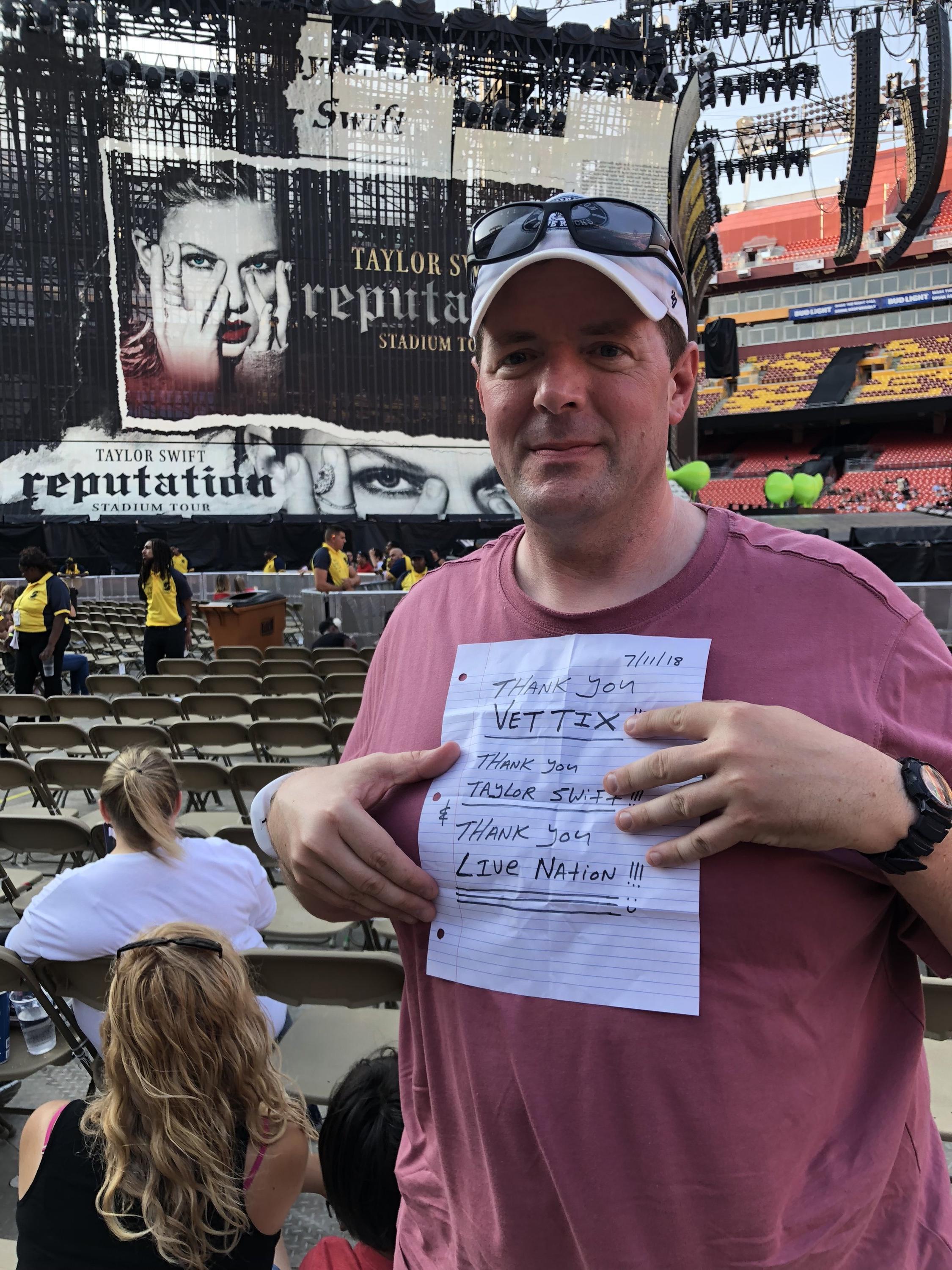 Thank You Vet Tix for a magical evening with Taylor Swift & her Reputation Tour. The seats were fantastic & by far the best seats I've ever had to any concert I've ever been to. My girlfriend & her younger cousins had a blast seeing their favorite artist up close & singing along to their favorite songs. Thank You Live Nation & Ticketmaster for the generous gift. I'm thankful for your gift as it made my special evening possible. Thank You Vet Tix for all that you do.
