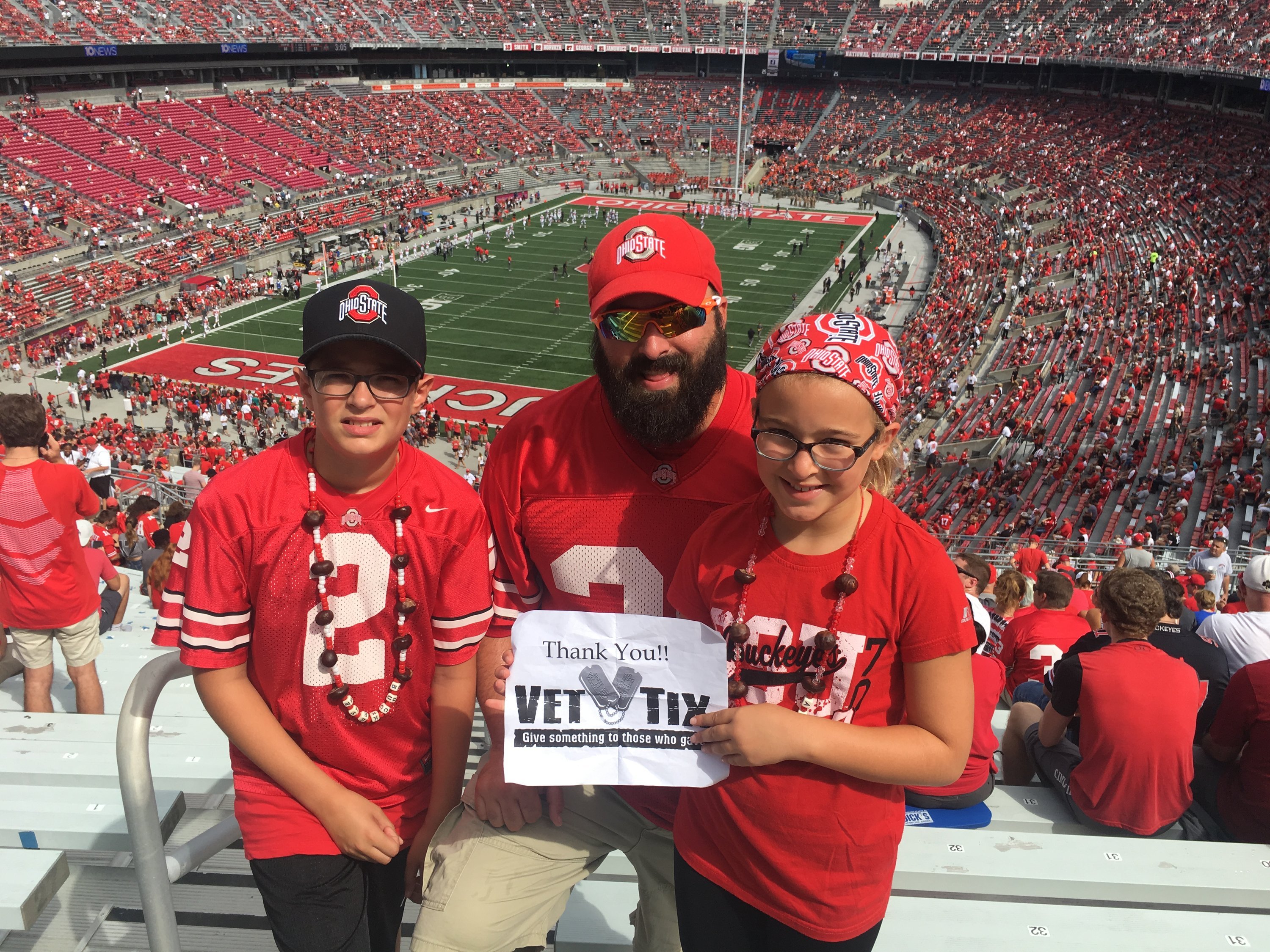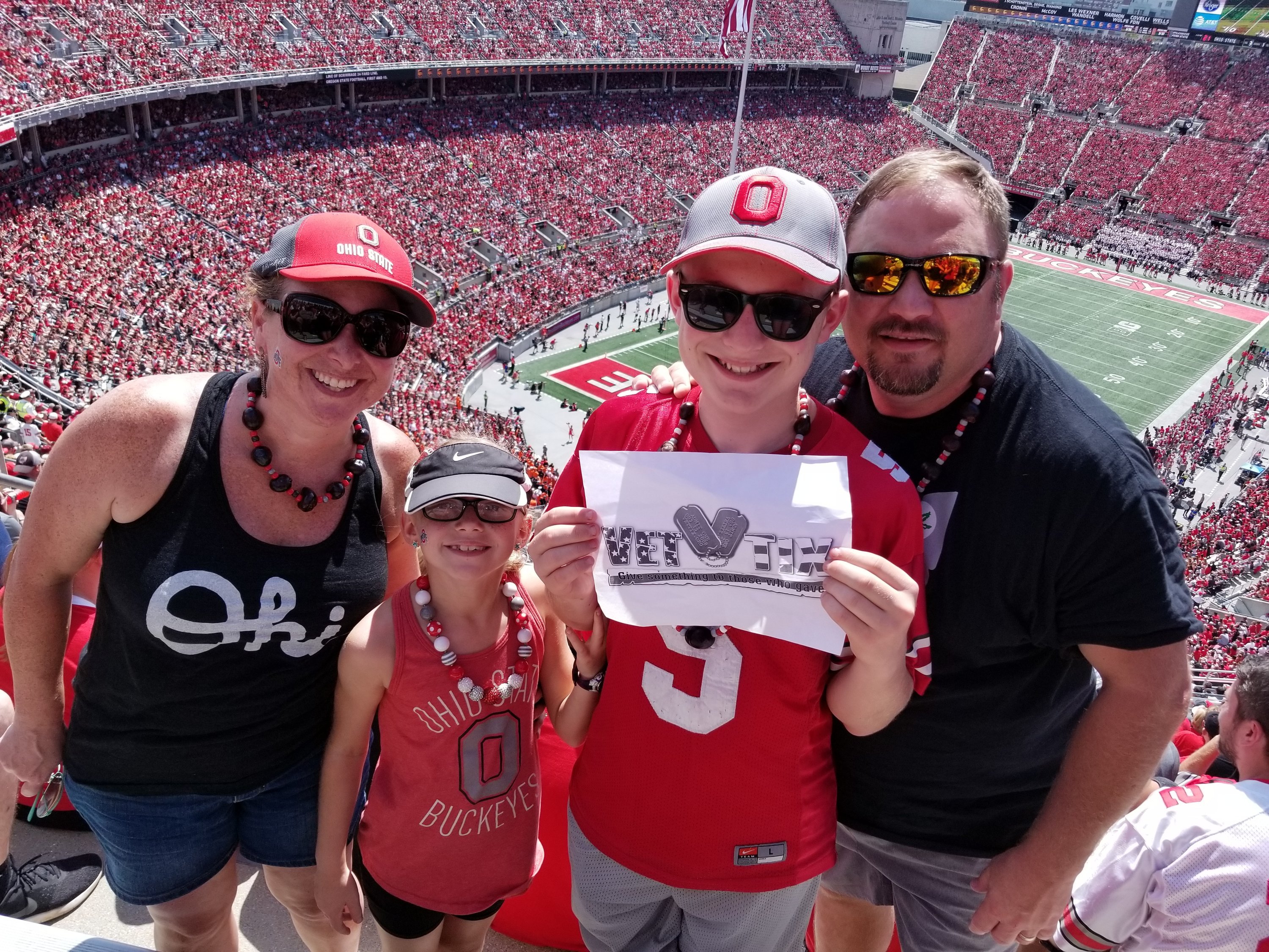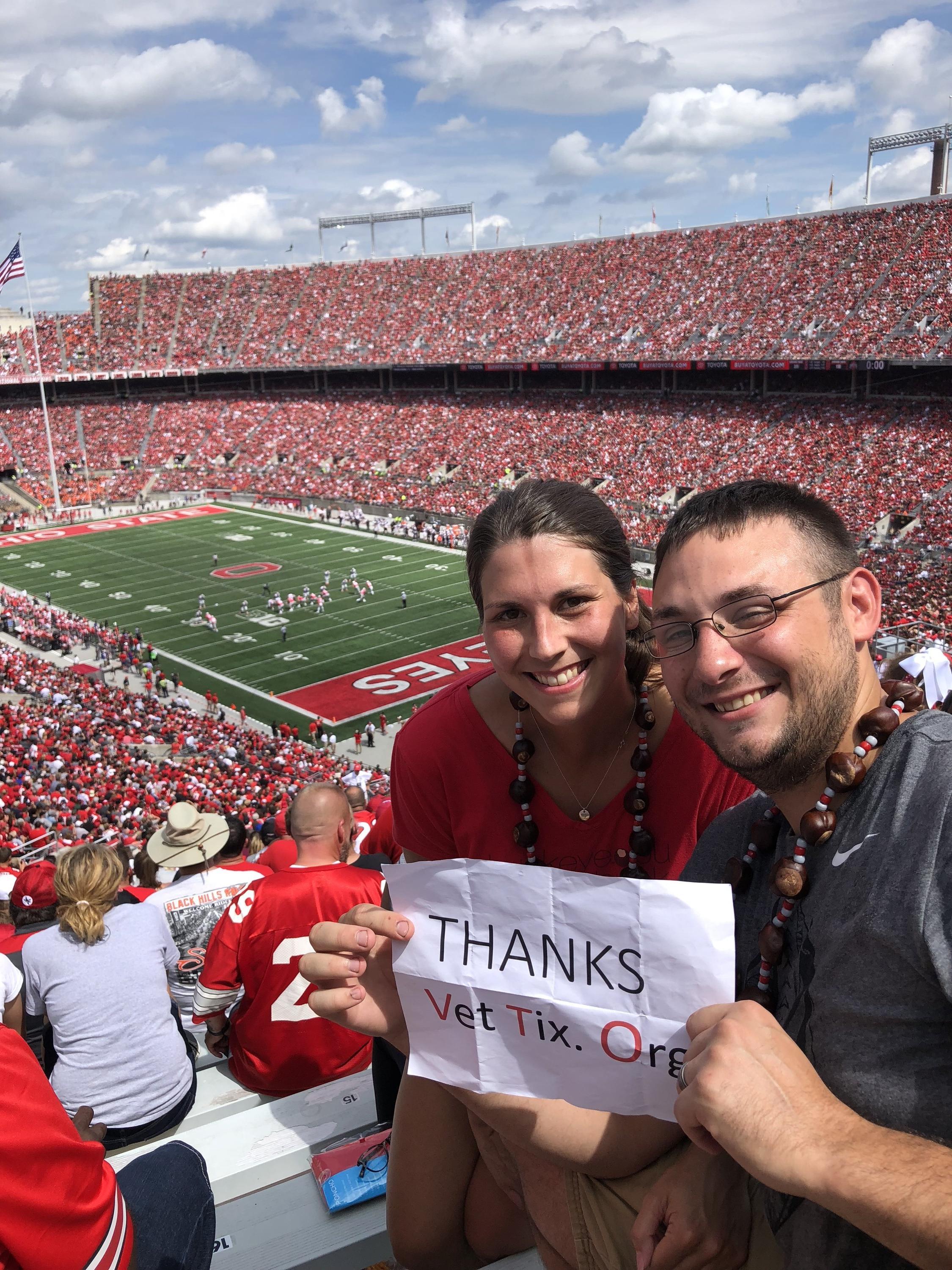 Thank you for donating tickets to the Ohio State University football game against Oregon State on September 1st. These tickets allowed me to take my kids to an OSU football game and we thoroughly enjoyed ourselves. Thank you for supporting veterans!!