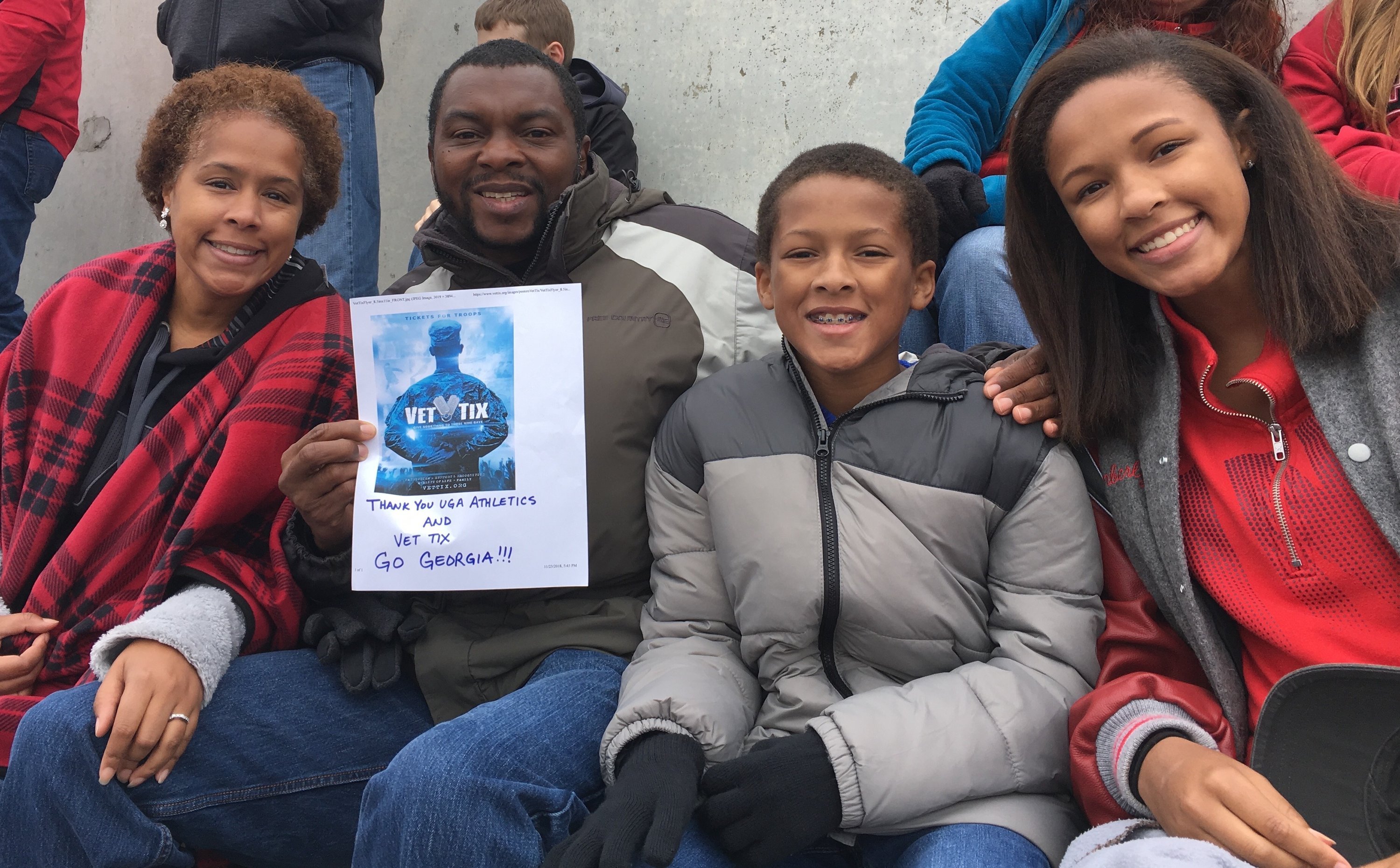 Thank you so much for tickets to the Georgia - Georgia Tech game. Of course it was a great game since Georgia stomped Ga Tech and we got to experience some good ole fashioned hate first hand. Me and my family were able to enjoy this experience together thanks to you. Sorry I forgot the Vet Tix sign.
