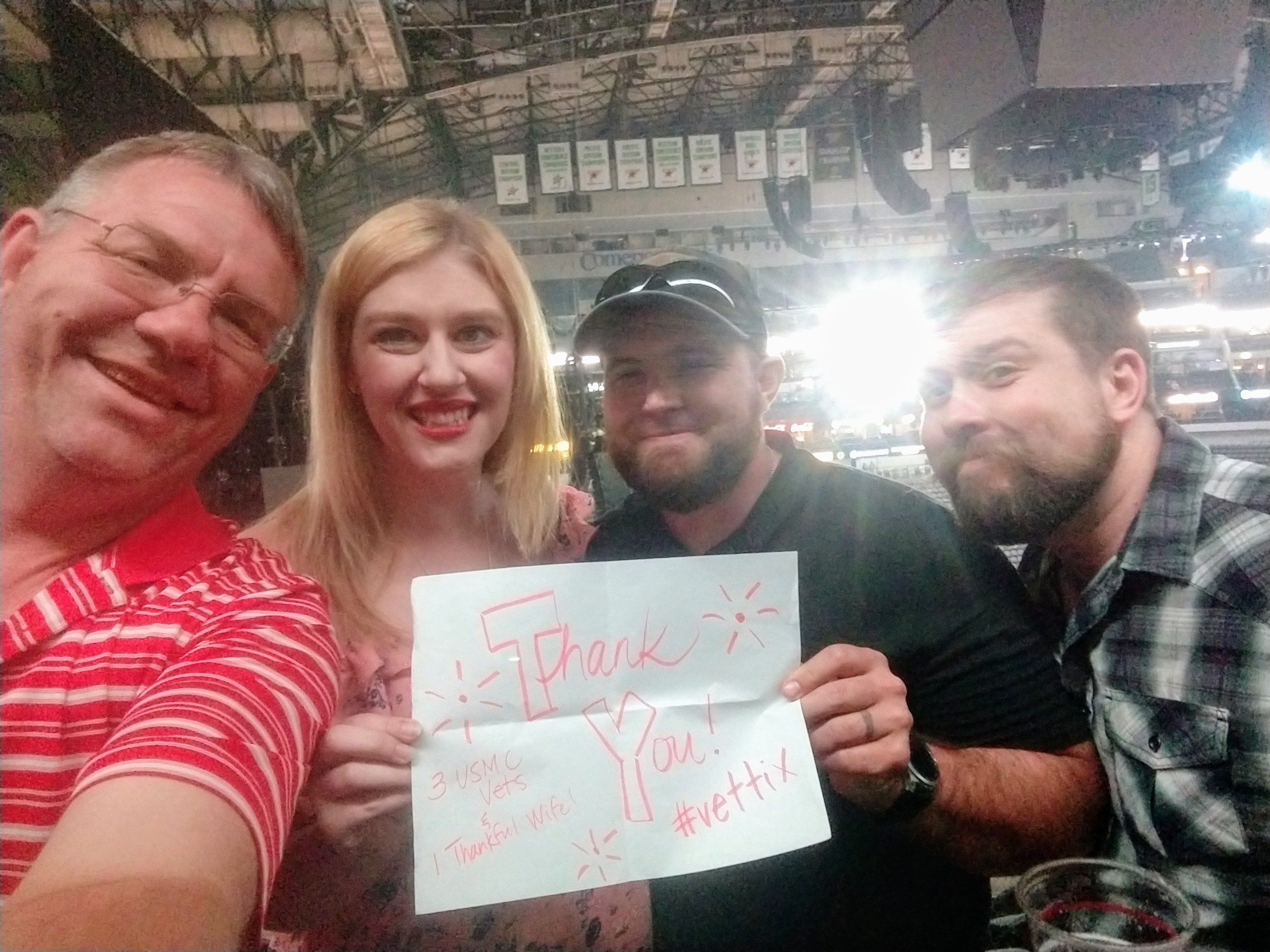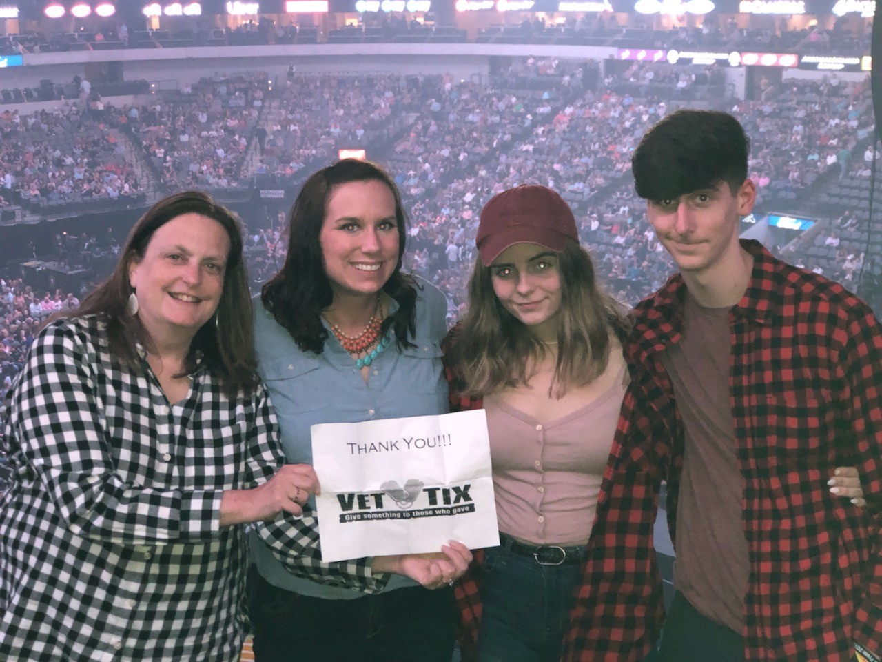 We would like to thank the generous donors who gave us tickets to Eric Church. It was a wonderful show and we had a great evening. It was nice to sit with so many other veterans at the event. Thank you so much for all you and vet tix do for us and all veterans.