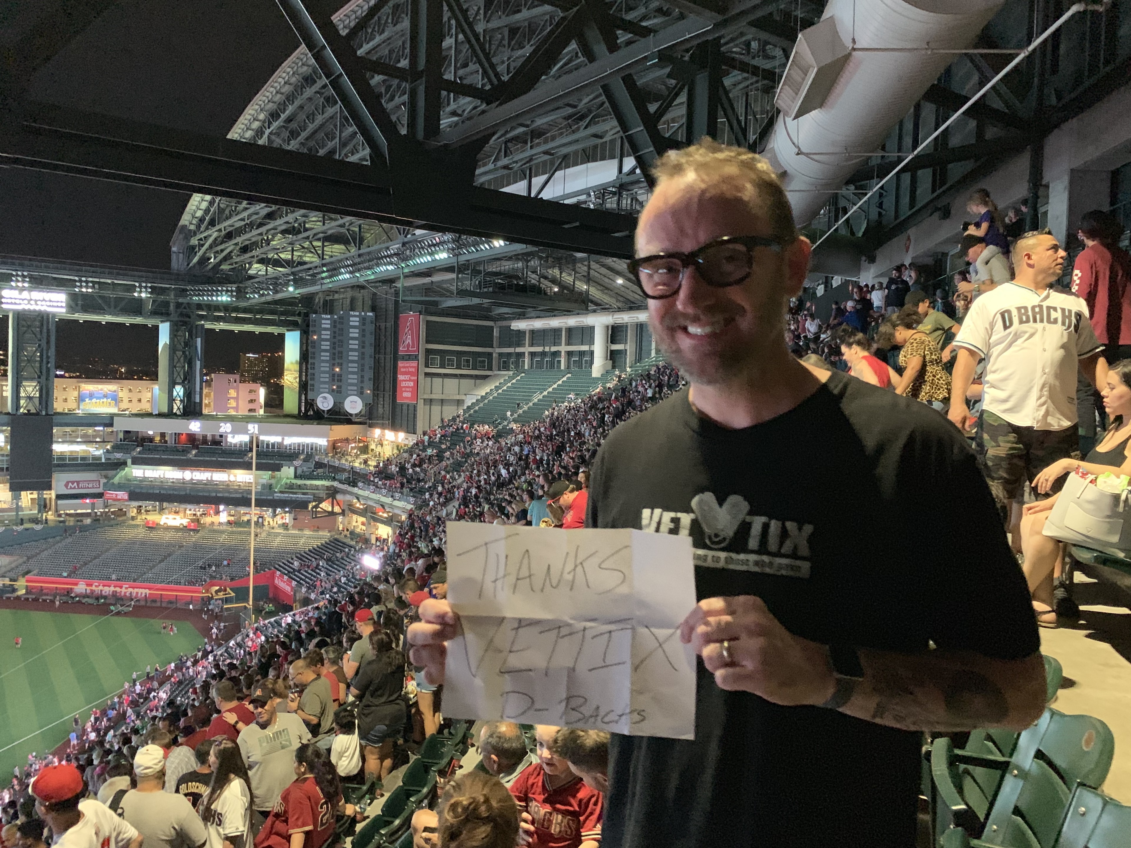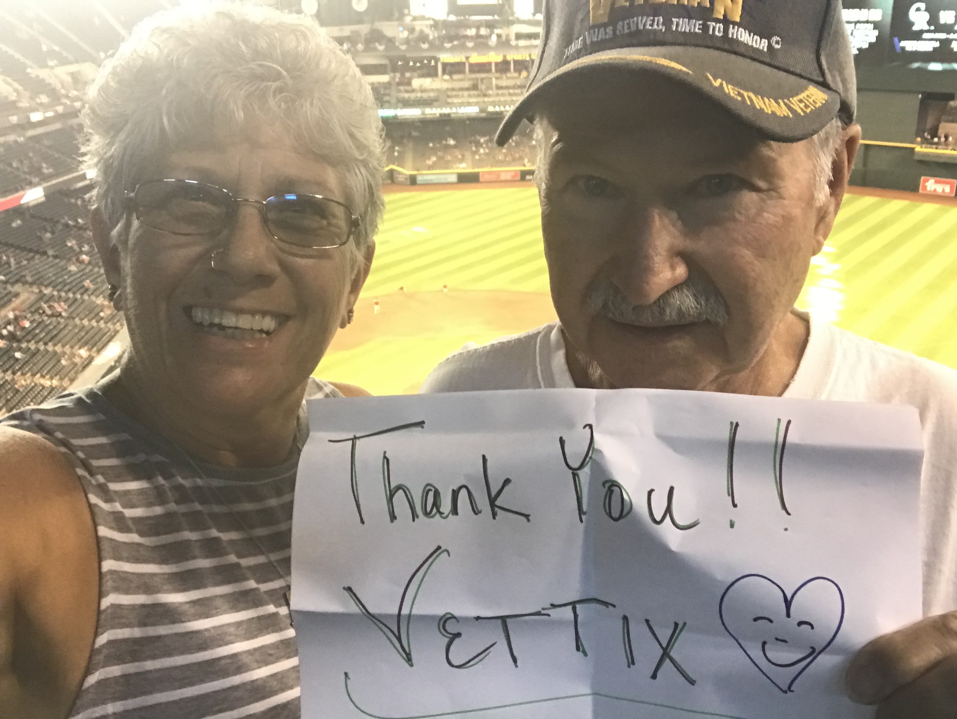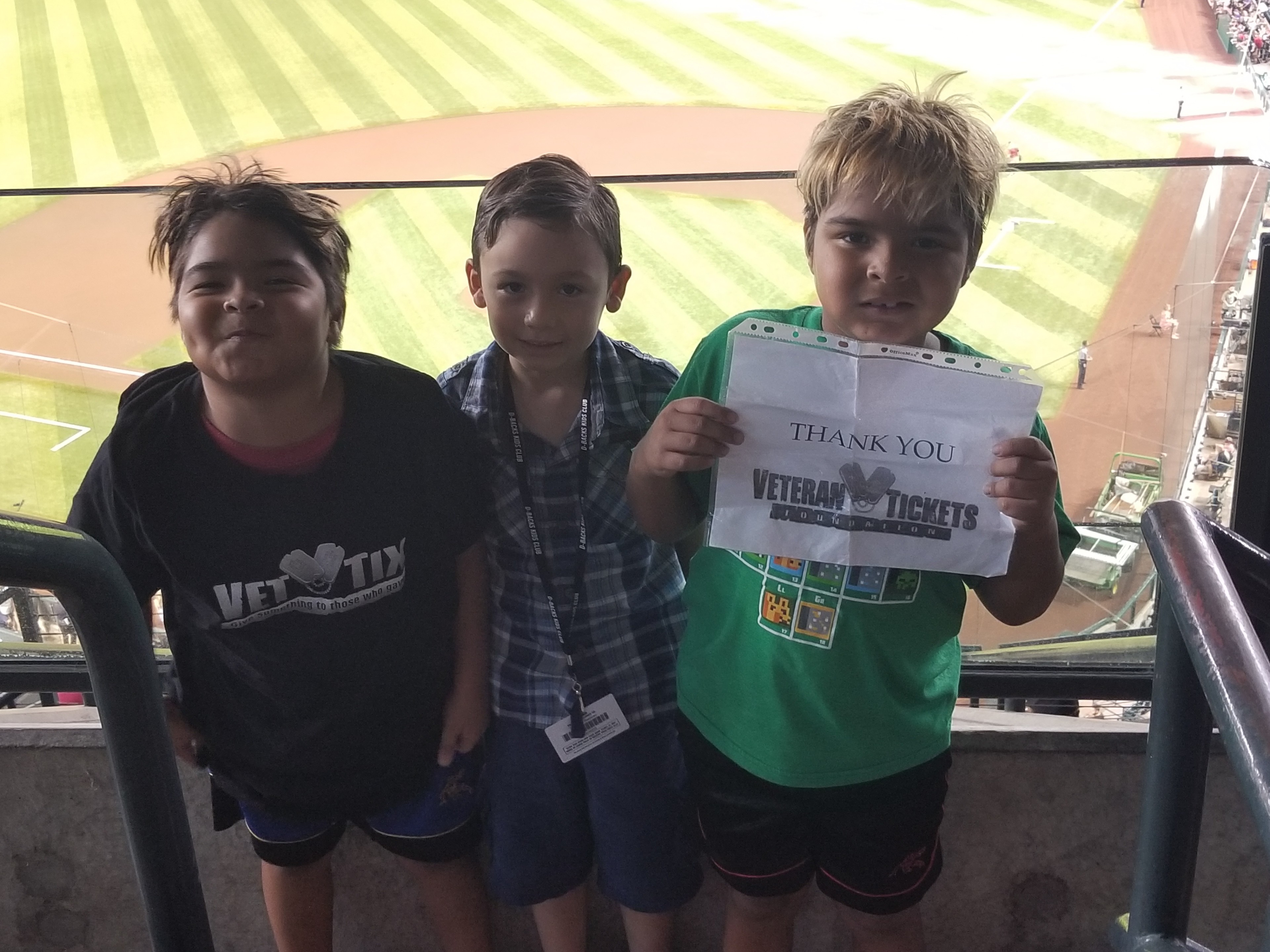 This was our first Vet Tix experience. Thank you so very much! We appreciated the tickets and had a fun night. Our little guy kept saying, "I can't believe someone gave us free tickets. That's so nice!" --and it was! Thanks again! Diamondbacks won 8-0. :)