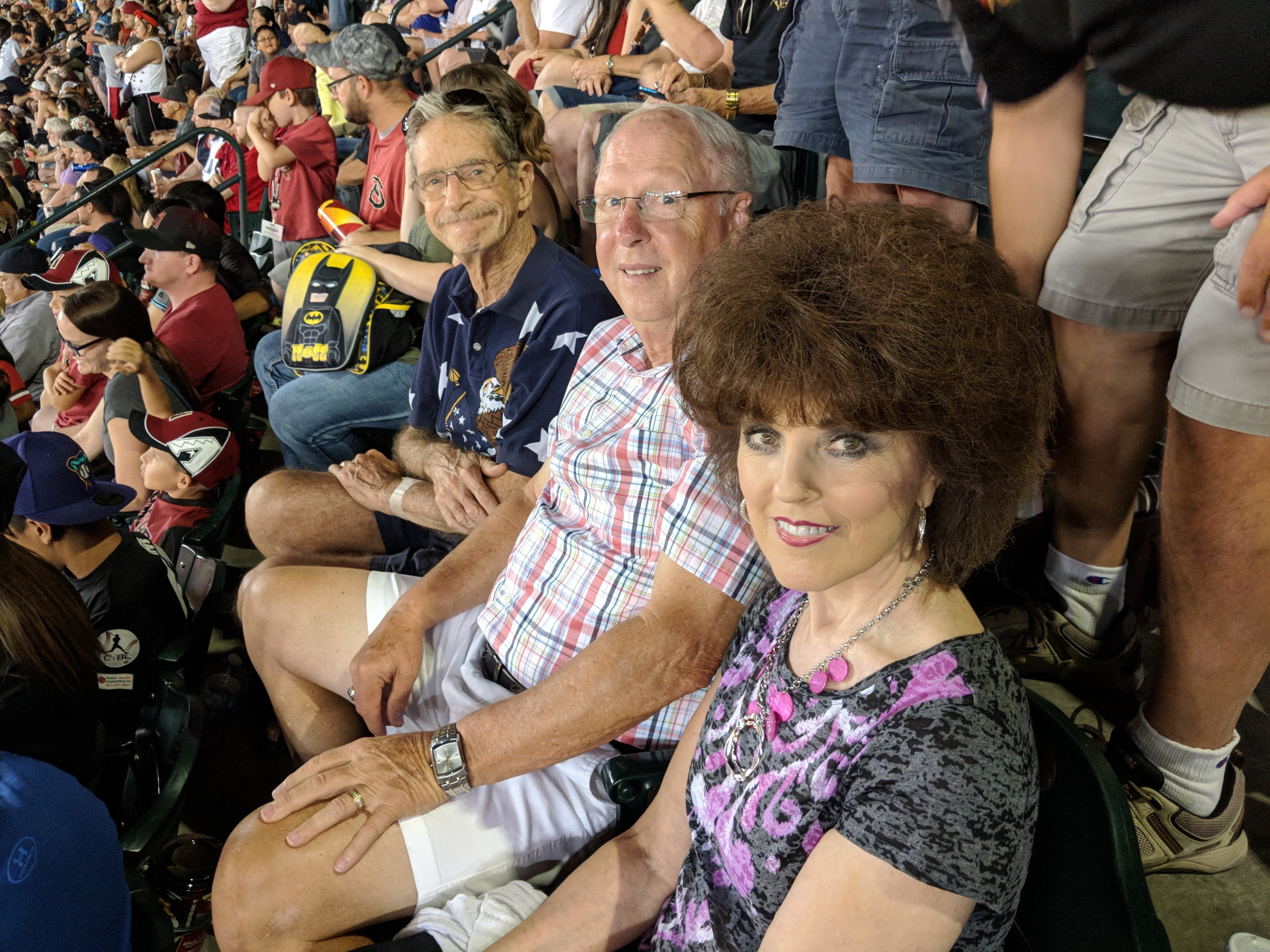 We thoroughly enjoyed the game on the 5th of July. The fireworks were spectacular. I wanted to send a picture of those too but am limited to one. Unfortunately we couldn't get a picture of the field in the background. The seats were right behind home plate and we had a great view of the entire field. It was great to part of such a patriotic program. Again thank you so much Arizona Diamondbacks!!! p.s. Vet James is on the left of the trio.