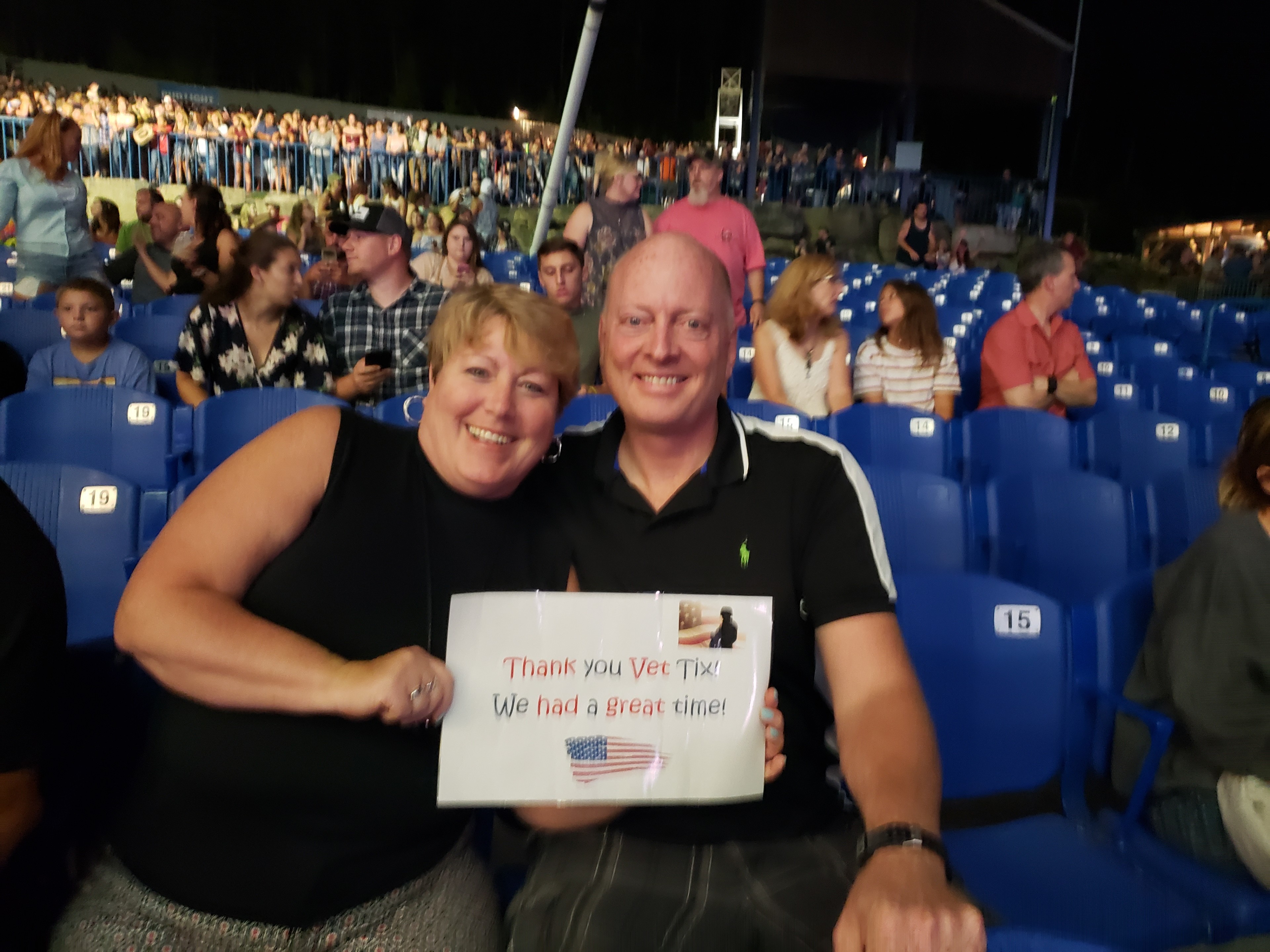 I would like to truly thank live nation for the tickets they donated to vettix, allowing my girlfriend and I to attend an awesome concert. We would otherwise not be able to attend such a great event. Unfortuately our friend was unable to attend due to a family emergency. thank you again live nation and your tremendous support of veterans.