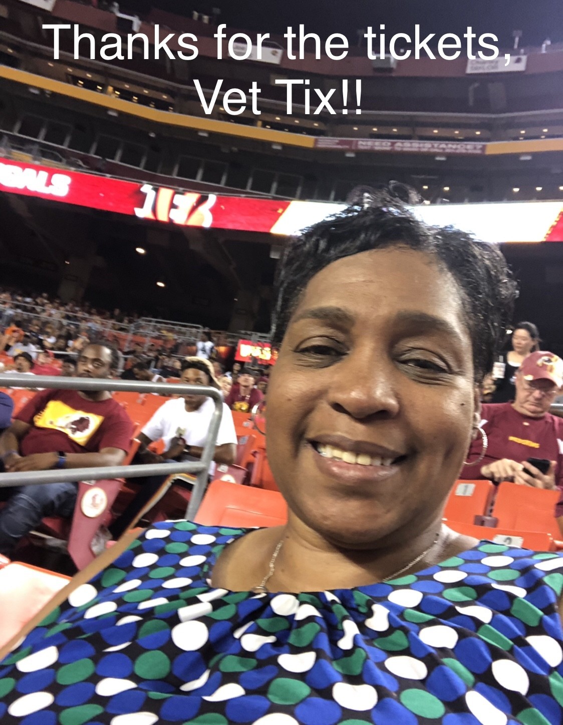 Thank you so much, Vet Tix. The seats were amazing! Even though the Redskins lost, we had a great time. Thank you so much for your donations! This Army Veteran really enjoyed my very first time seeing a live professional football game! God Bless you all!!!!