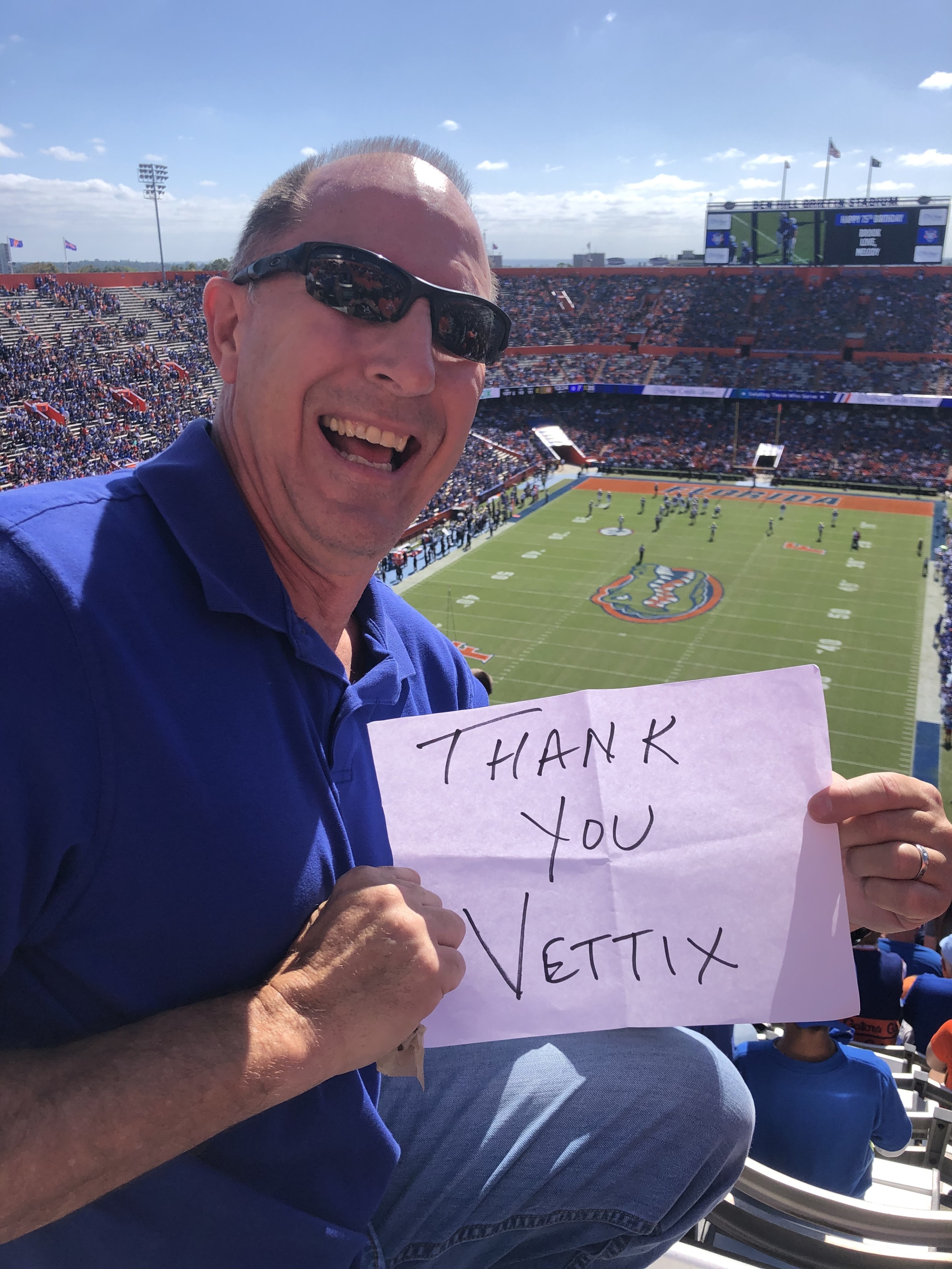 Thank you Vettix and UF Gators for tickets to the game. Enjoyed my first college football game and fine with family and friends