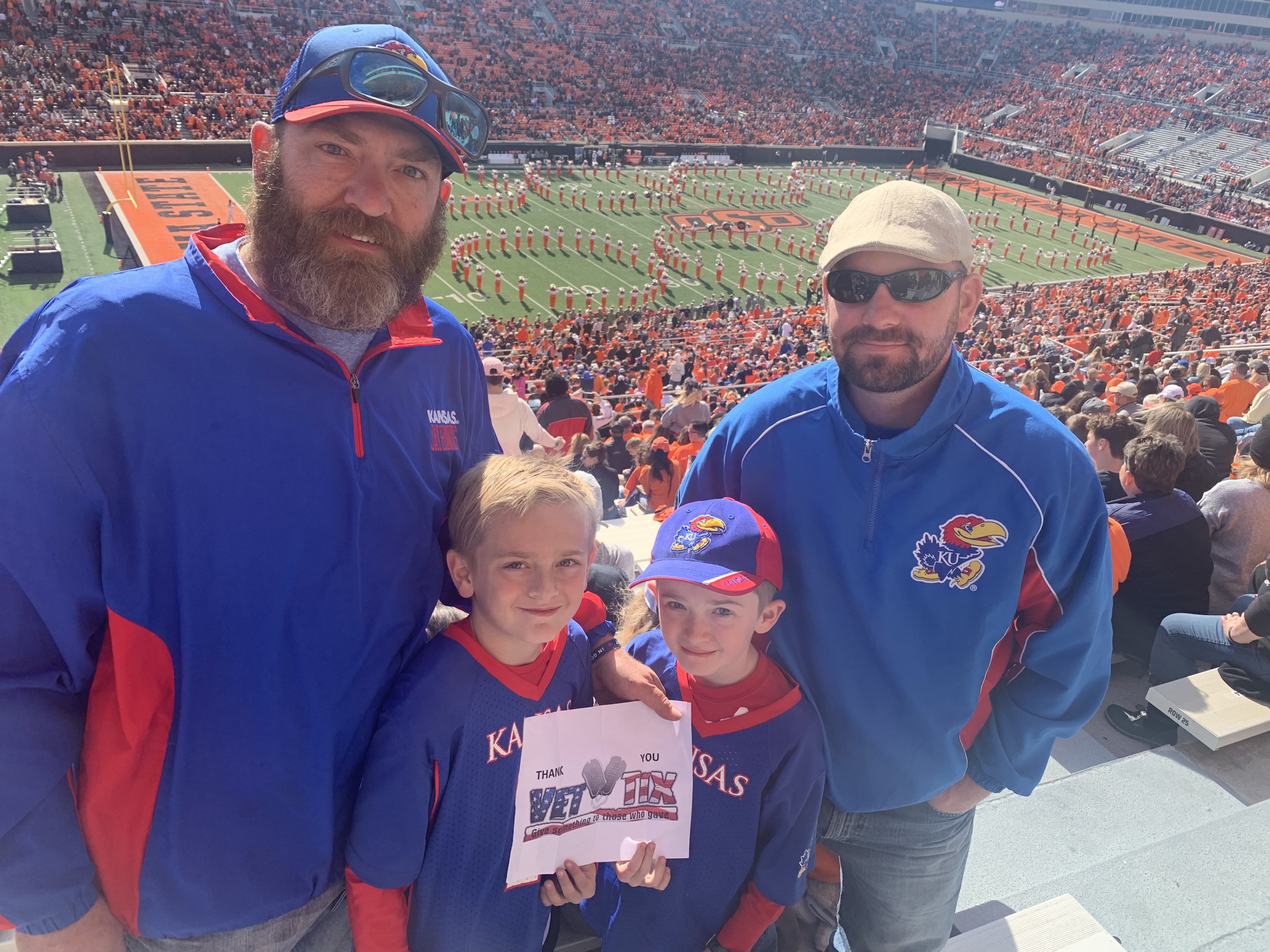 Our handicapped son was so happy, That when the marching band started to play he began to cry. Kinda teared up myself. It was absolutely amazing. Thank you so very much! Oklahoma State University Cowboys - NCAA Thank you Vet Tix, God Bless.