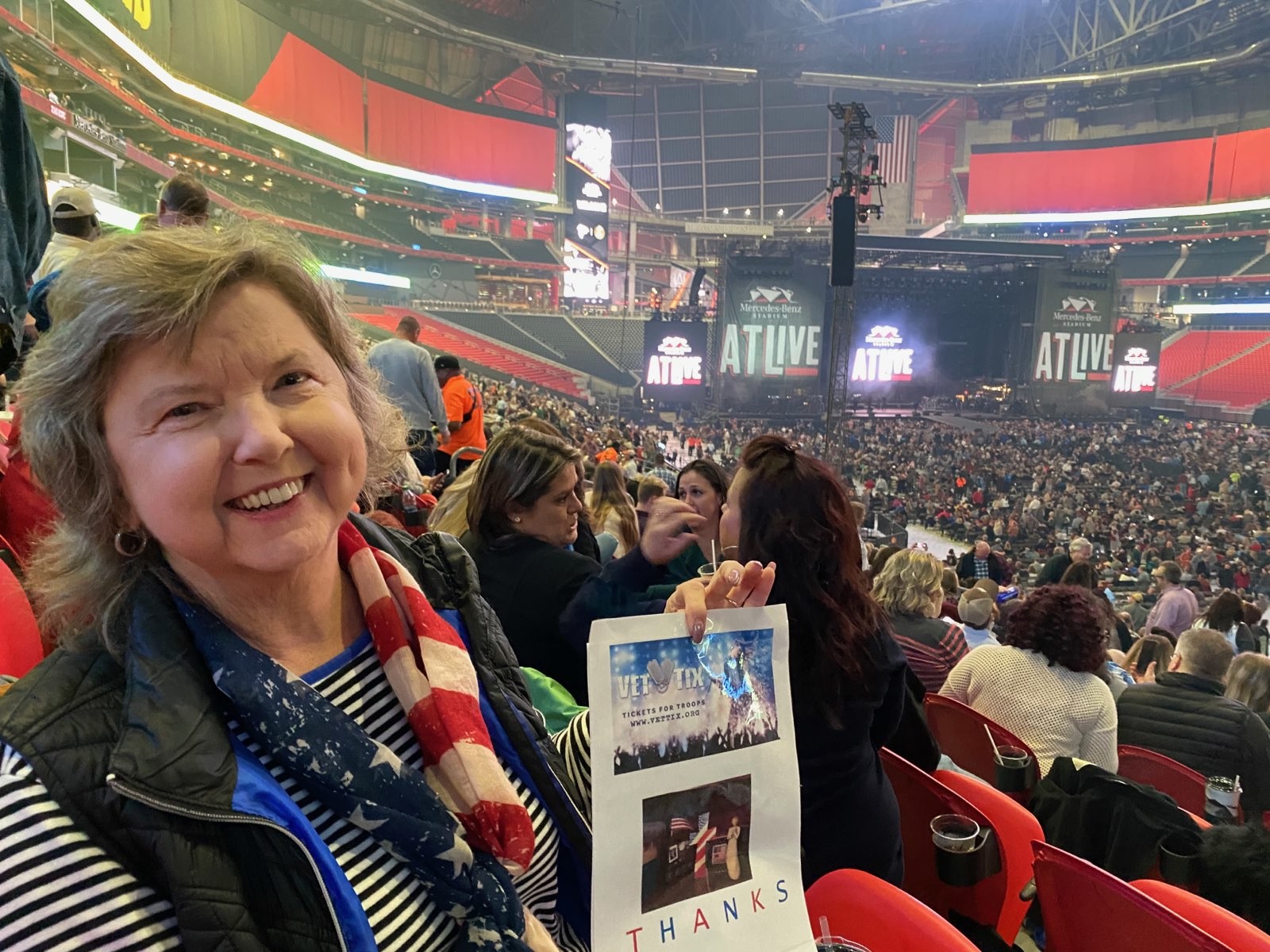Thanks AMB Sports-Entertainment-Mercedes- Benz Stadium for tickets to the ATLive concert with Blake Shelton and Keith Urban. Seats were great and so were all of the singers/bands. My daughter went with me. It was a great way to spend an evening. Thanks for all that you do for veterans and their families.