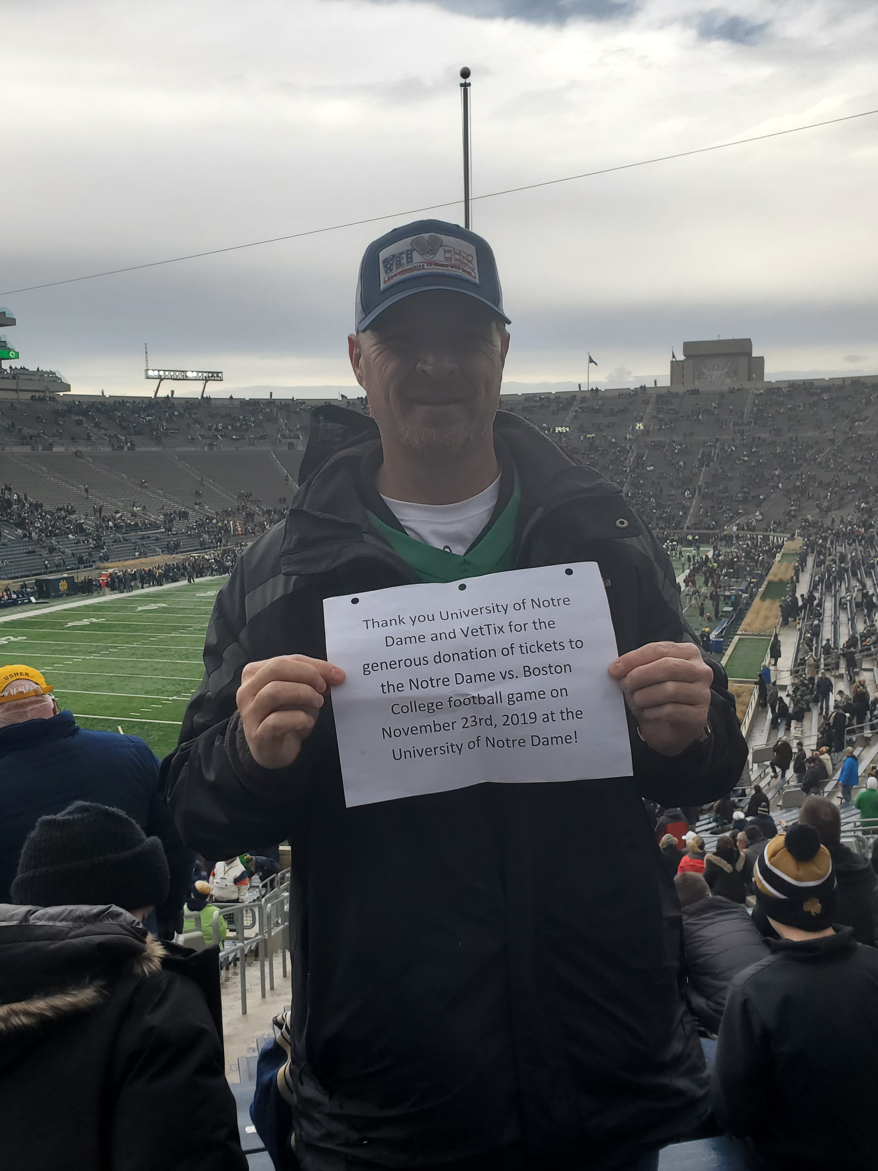 Thank you to the University of Notre Dame and VetTix for allowing us to enjoy the Fighting Irish football game against Boston College. It was an awesome experience in which I was able to interact with other vets. Thank you, thank you, thank you!