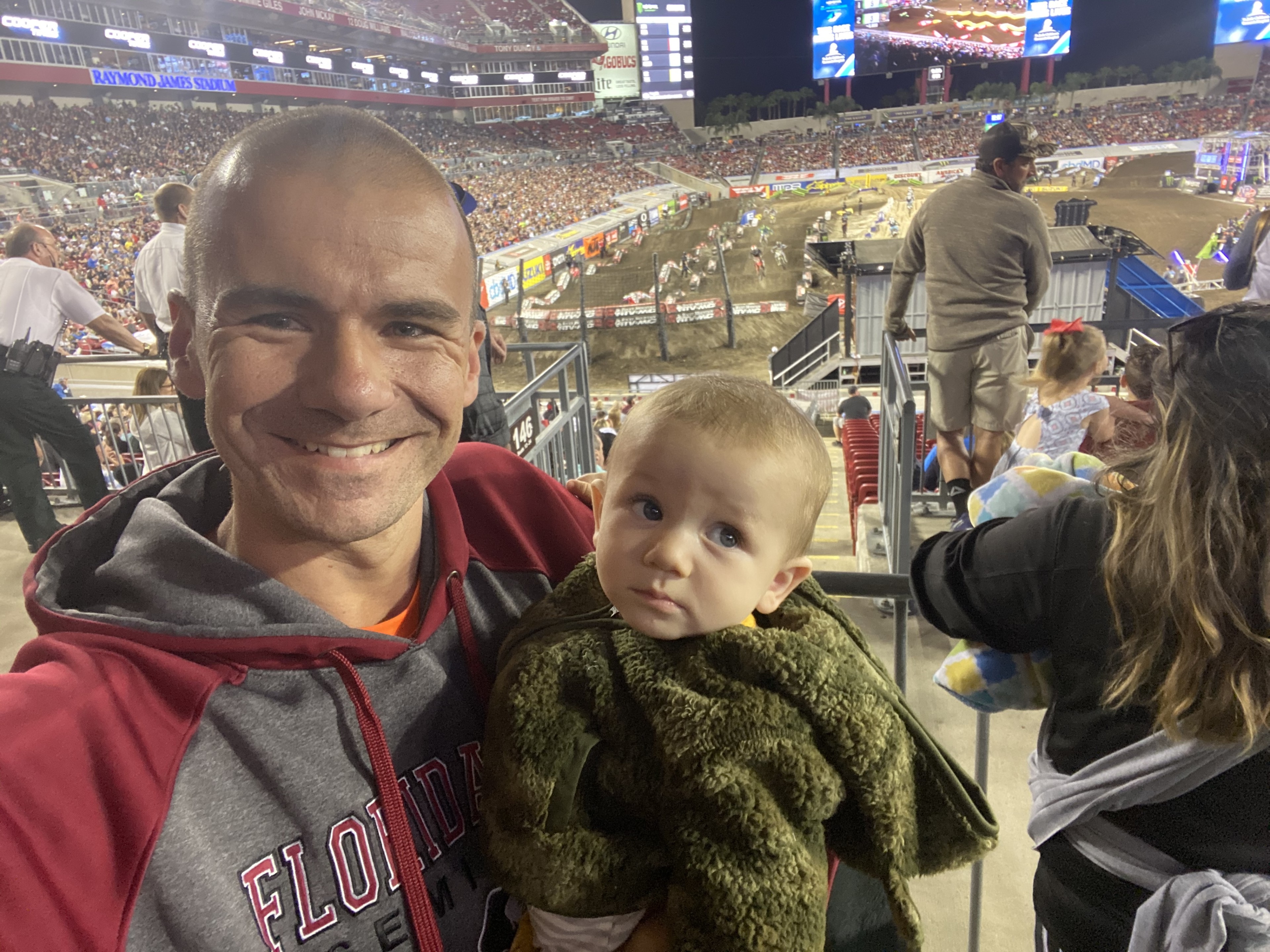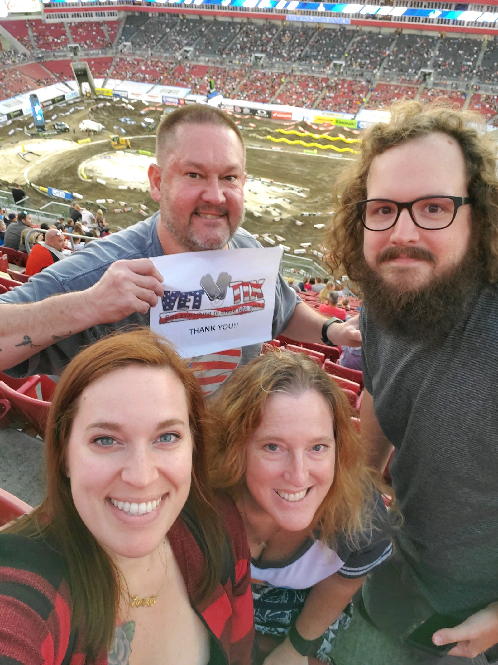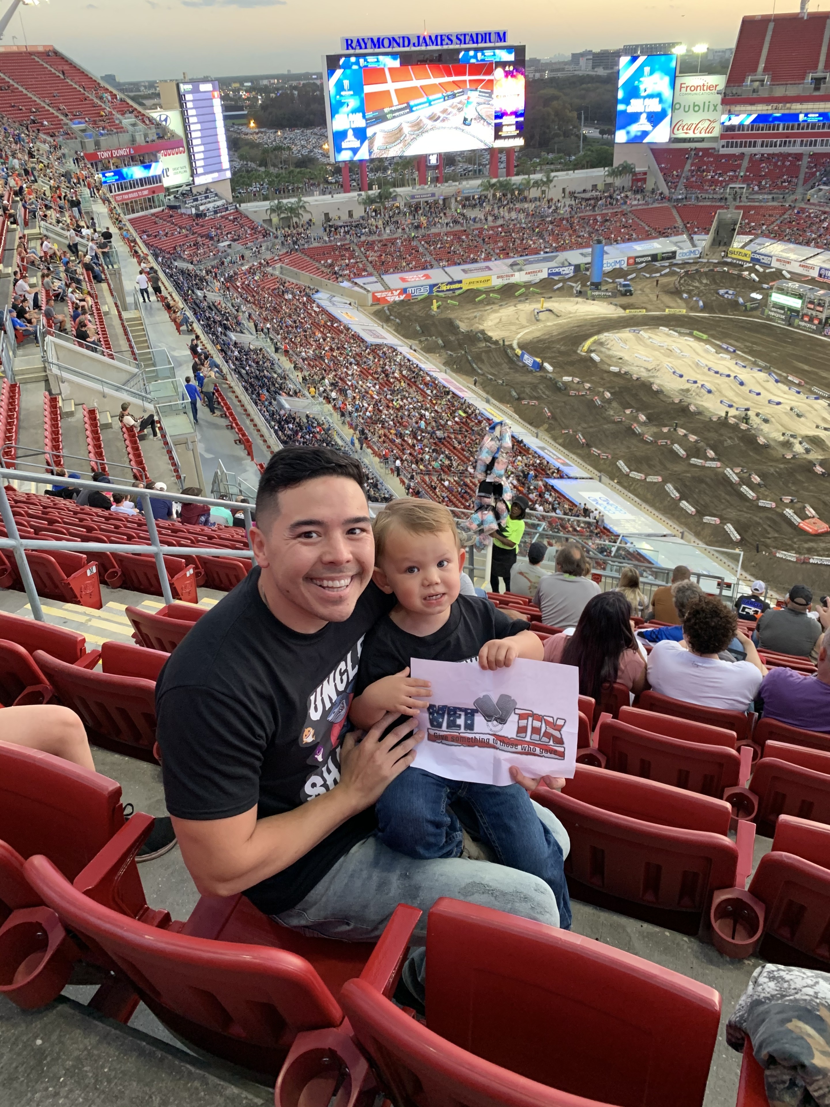 Our family would like to thank Vet Tix and Feld Entertainment, Inc. for our tickets to the Monster Energy Supercross. It was a night of edge of the seat excitement! Watching the motorcycles catch air was awesome! Our favorites of the night were the little 7 & 8yr. old riders. Our little guy the was with us never took his eyes off the track! We hope we get the opportunity to come back to Raymond James Stadium again!
