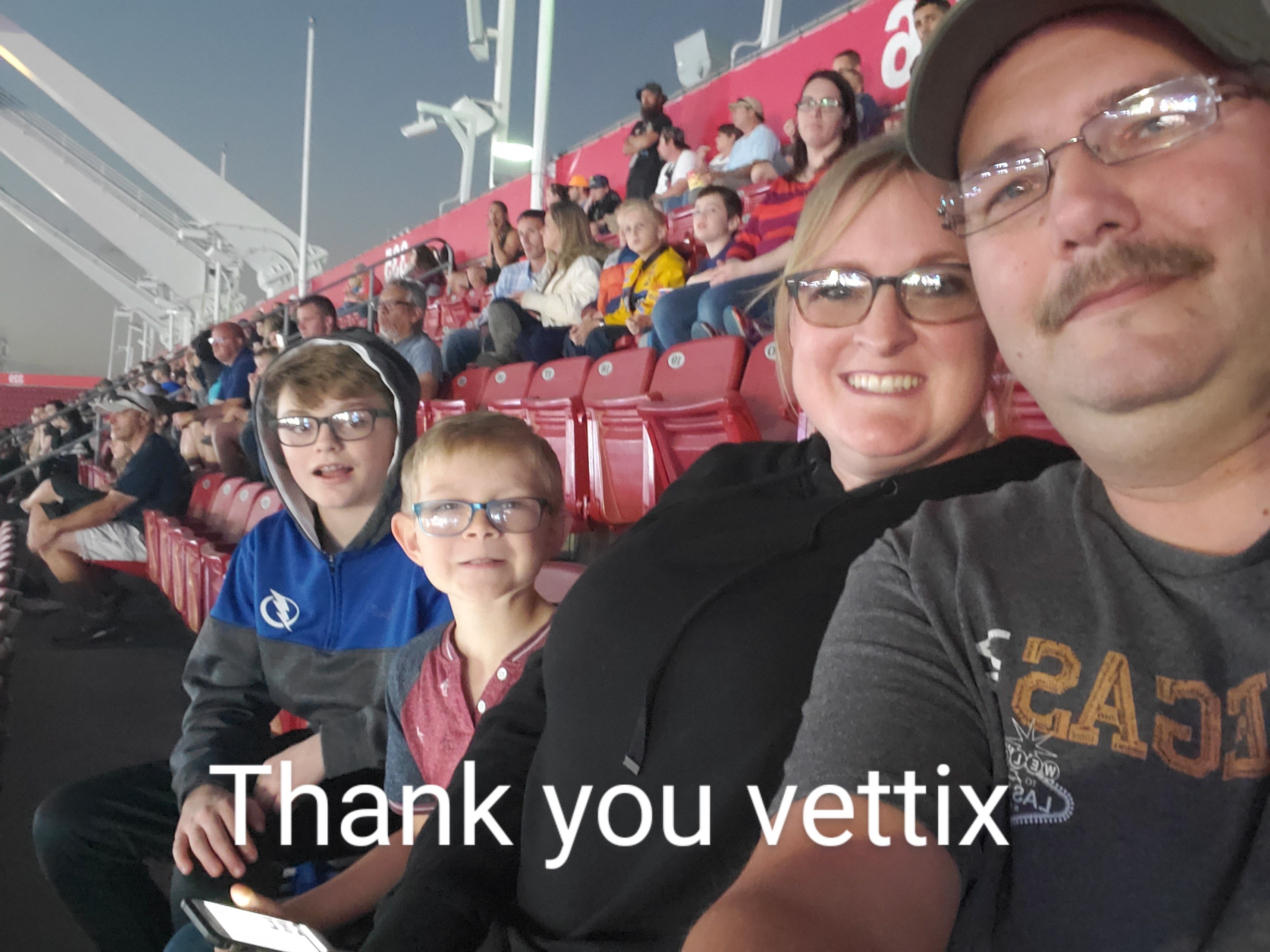 Thank you soooo much. The tickets offered amazing views of the track, unfortunately we had to move down to a lower level because 2 members were afraid of heights. I gave the tix to my sister(active military) because her son LOVES motor sports. Thank you Vettix and than you donors it was a great experience.