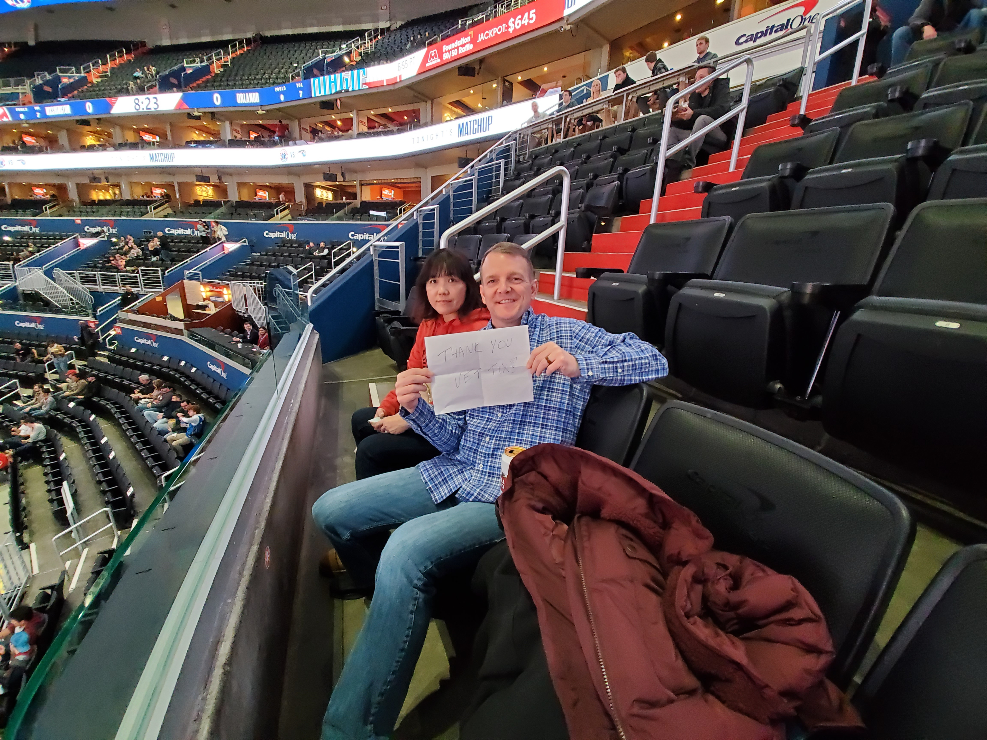 I want to say thank you to VET.TIX and Monumental Sports for our FIRST NBA tickets. This was our first time in an NBA game. Mi and my wife had a blast! I enjoyed the game from the beginning to the end. This was also our fist time in the Capital One Arena in DC. See my wife's smiling, enjoying, yelling and laughing was the most important part to me. Thanks!