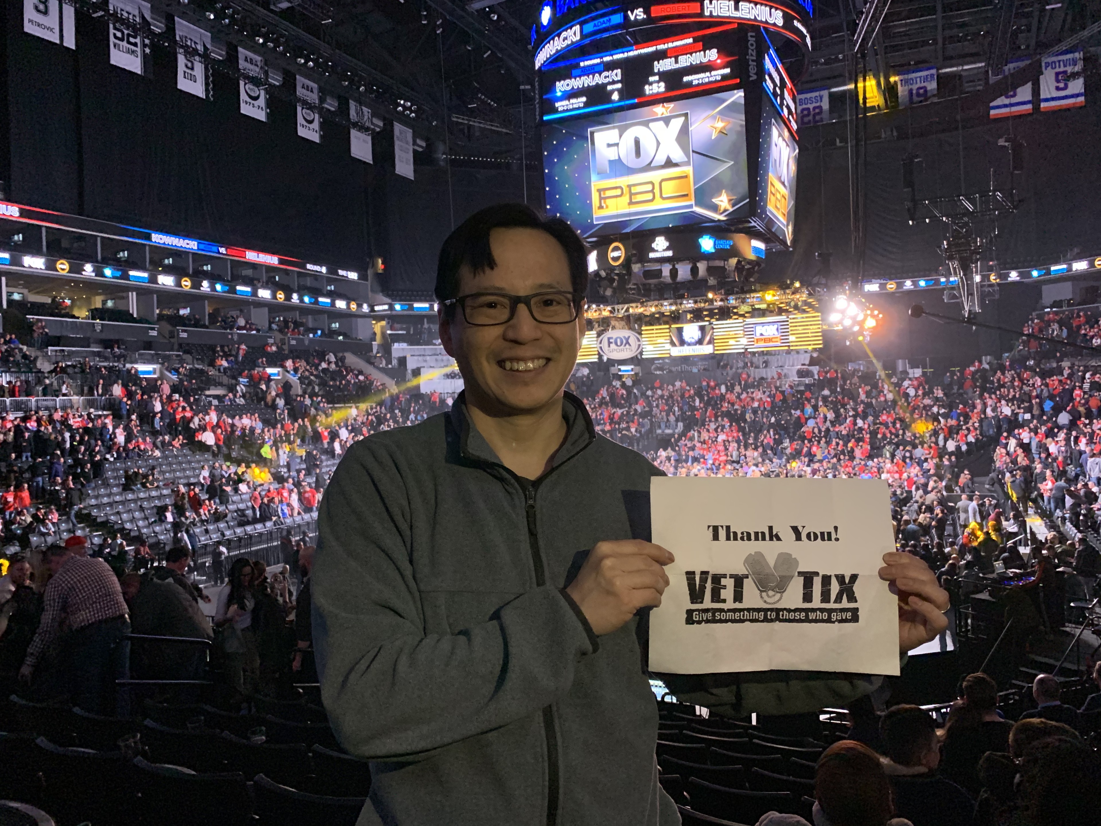 Dear Brooklyn Sports & Entertainment / BSE Global, Thank you so very much for donating these wonderful tickets to the Veterans. We had a great time attending this event. The main event was incredible. Four rounds of non-stop action. It means a lot to me and I'm sure other veterans that you support us. Thank you! SFC William Cheung, Iraqi War Veteran