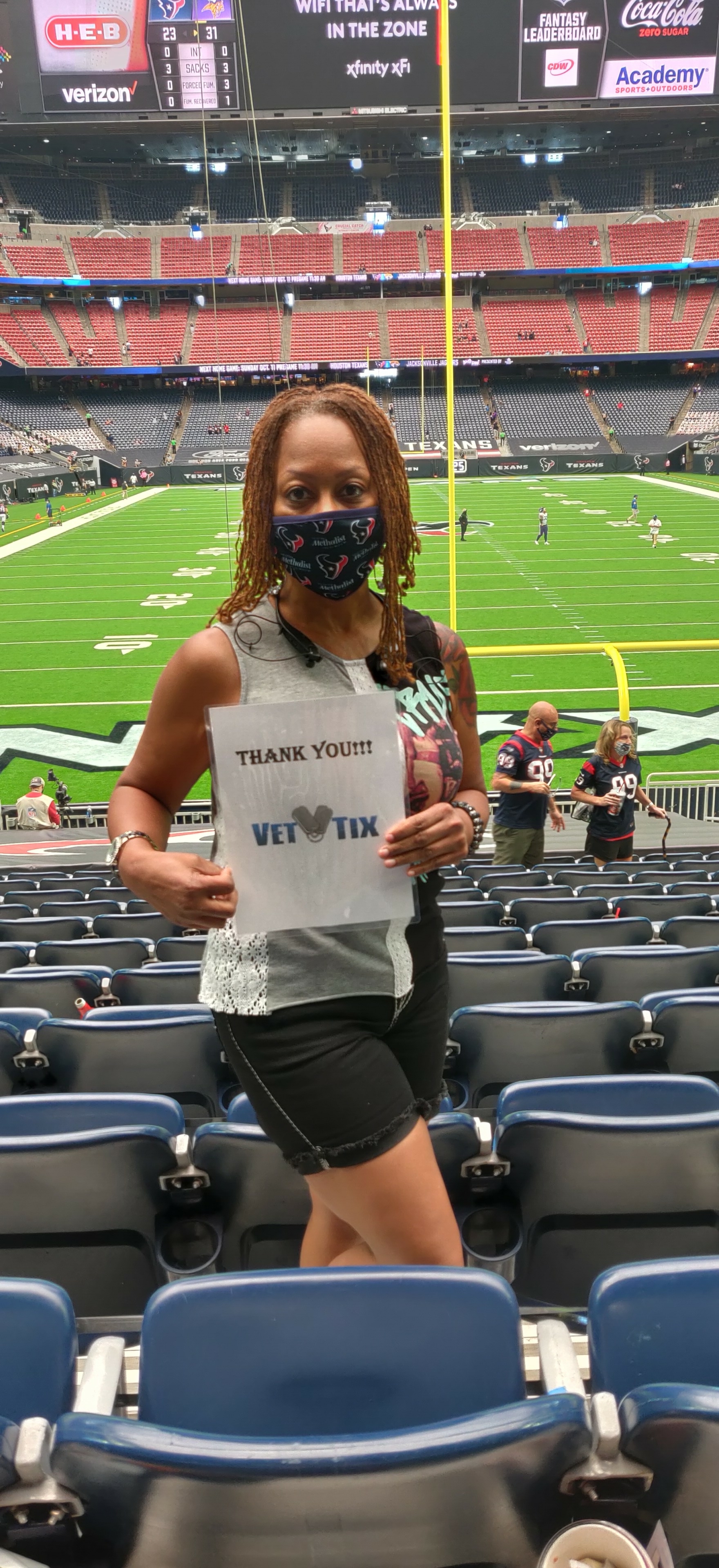 Thank you so much for these tickets! The seats were awesome! I really appreciated the added touch of having a Texans mask for every guest! You all went over and beyond to help the veterans get out the house during this pandemic! This was my first time ever going to an NFL football game. I had the time of my life! Thank you so much.