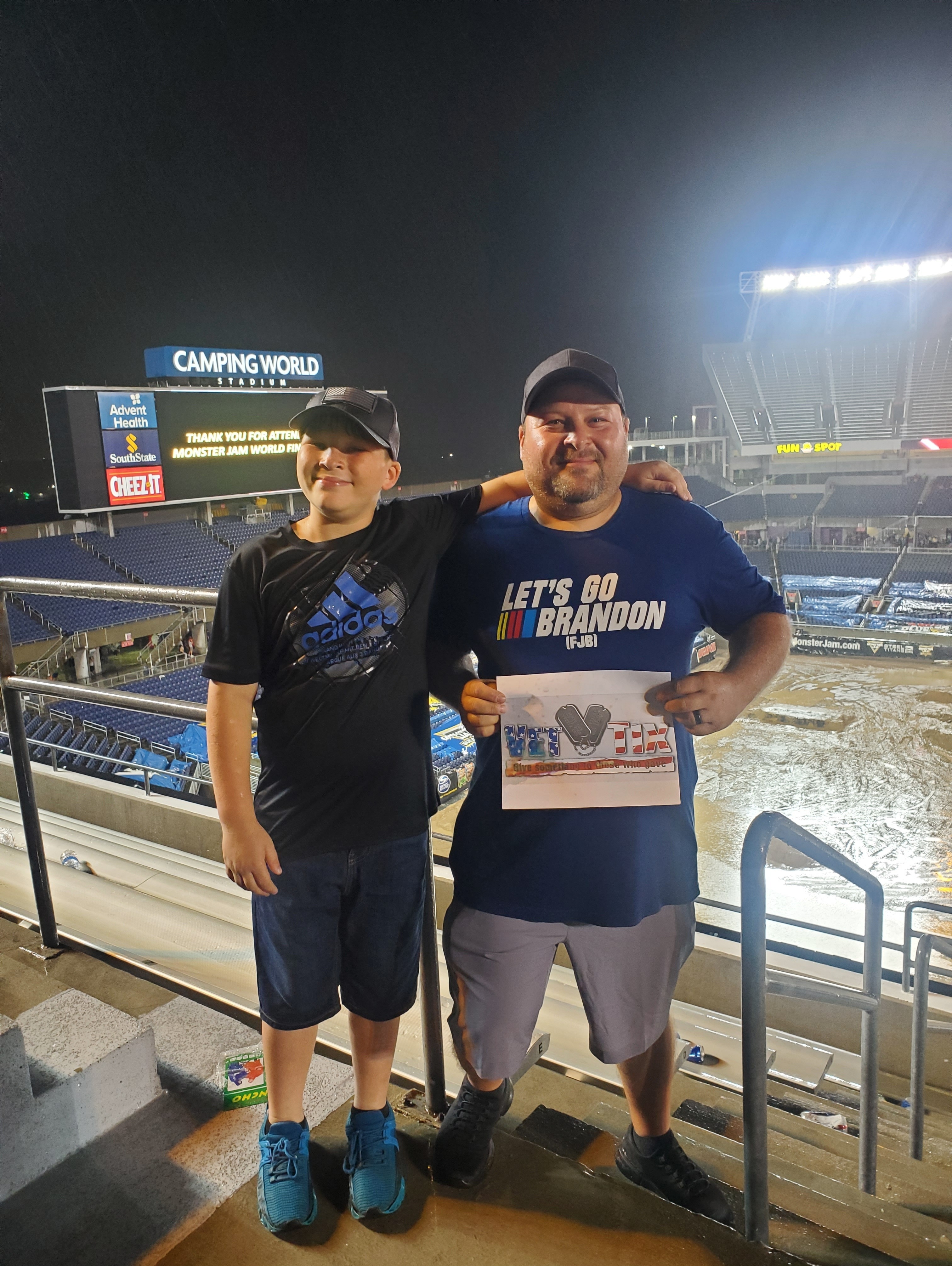 Thank you vet tix and Feld Entertainment Inc for the opportunity to allow me to take my son to the Monster Truck Monster Jam finals for his birthday! Even though the event ended up being a rain out as you can see in the photo, we did make the best of it! And most importantly a memory that will last FOREVER! Thank you again! ðŸ˜