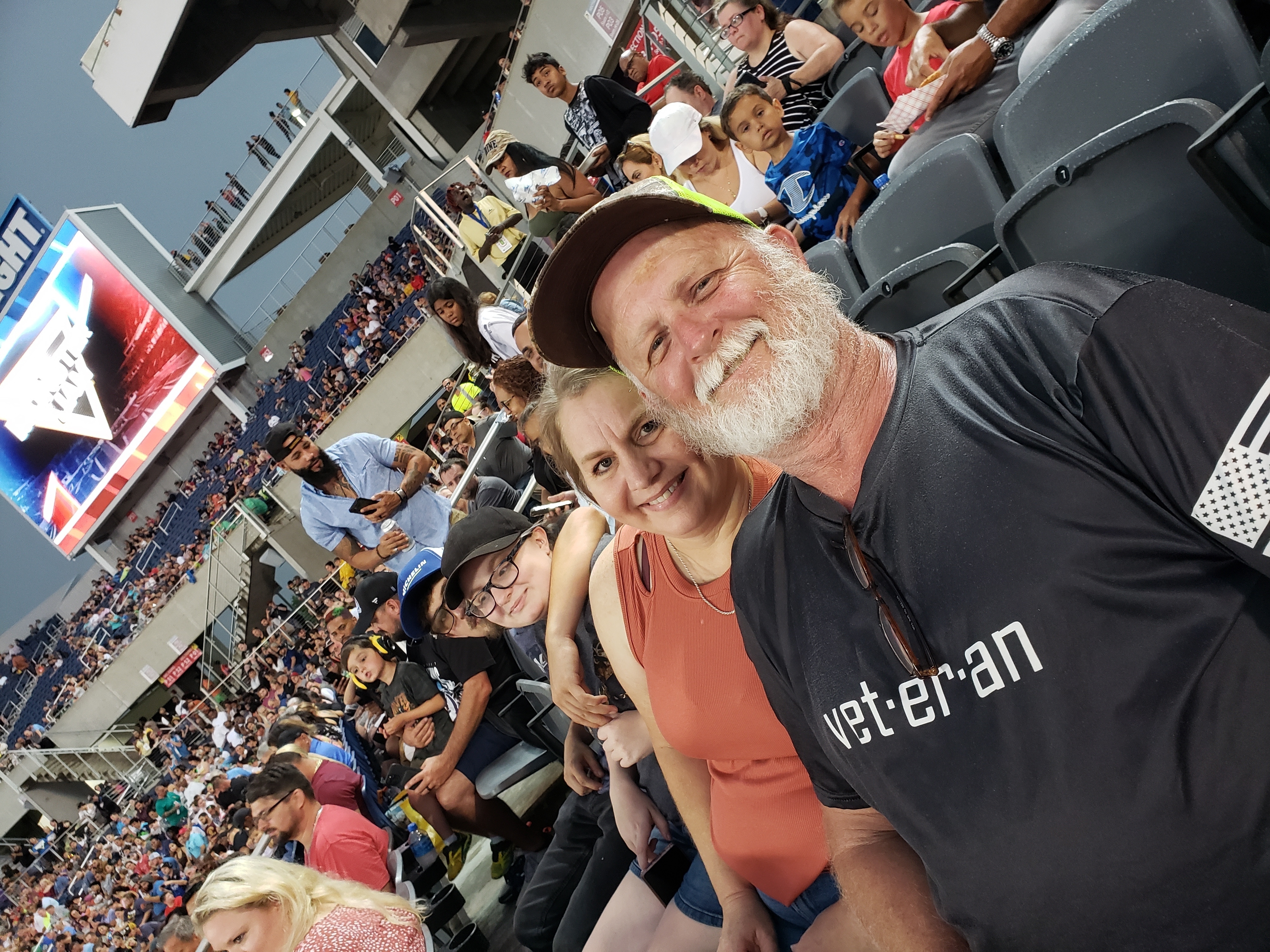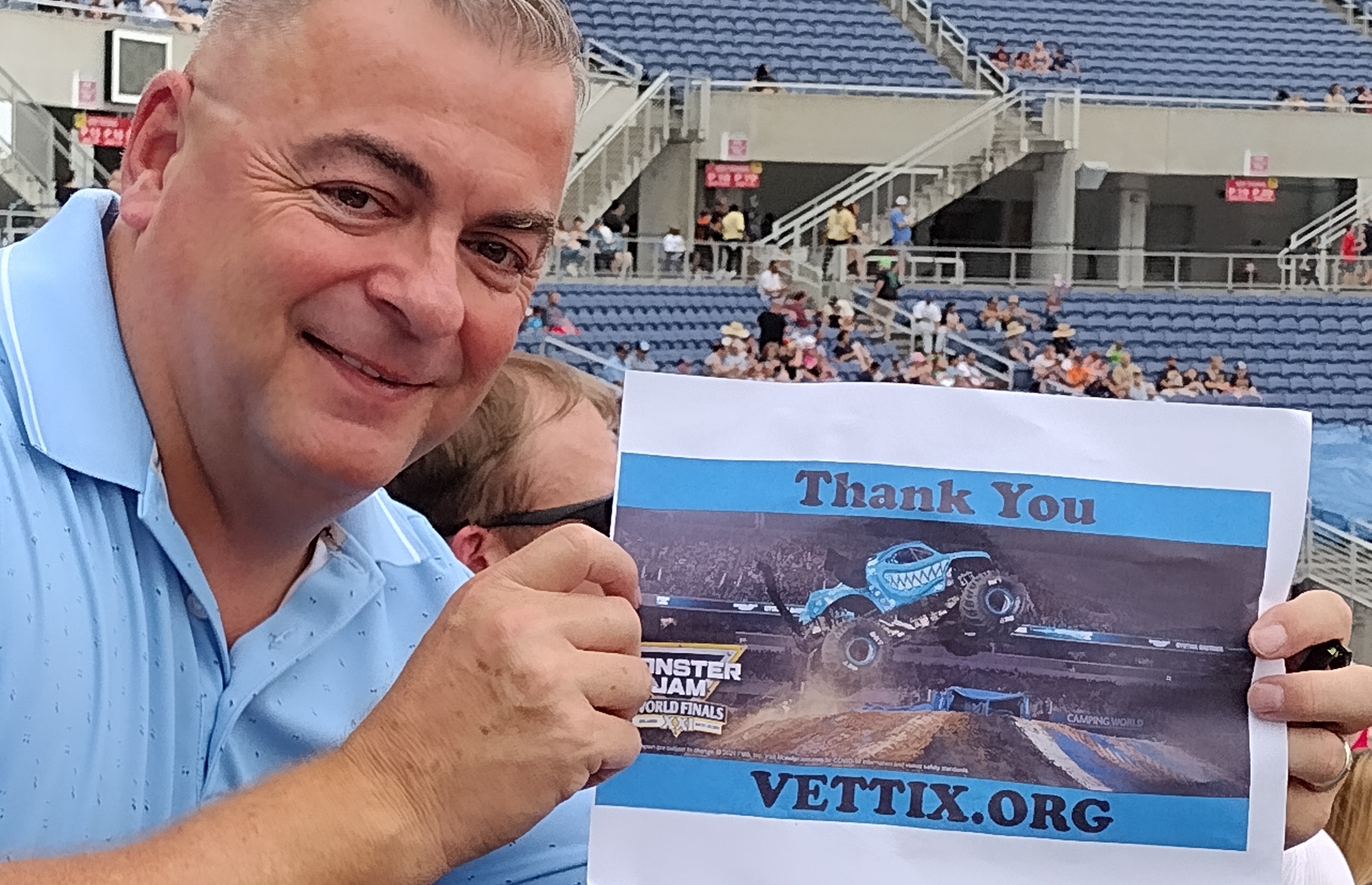 Thank you so much for the tickets to the monster jam World finals. Although the weather didn't cooperate very much it was still an exciting event while it lasted. It was a great bonding experience for me and my kids. Thank you for all you do for the veterans. Besides myself, I saw quite a few of them there and they were all very grateful for the attention and care that you gave them. It was fun to strike up a chat and find out what branch and when they served. I truly appreciate all you do.