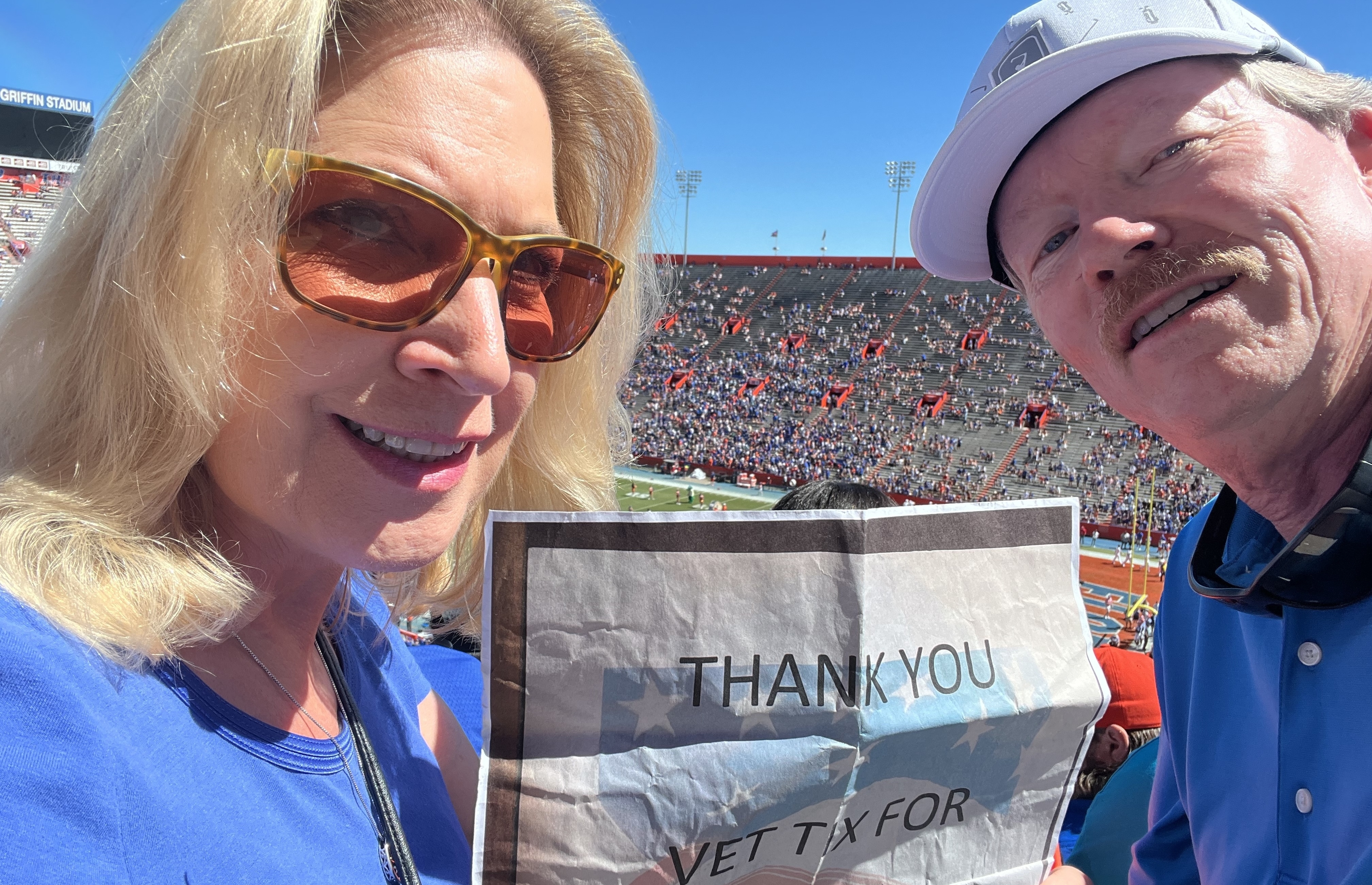 We want to thank the University of Florida for donating tickets to this game. It was our first Gator and NCAA game since moving to Florida. Beautiful stadium, campus, and easy to get in and out of university. And the Gators win. Thanks for the enjoyable day and your support to the veteran community.