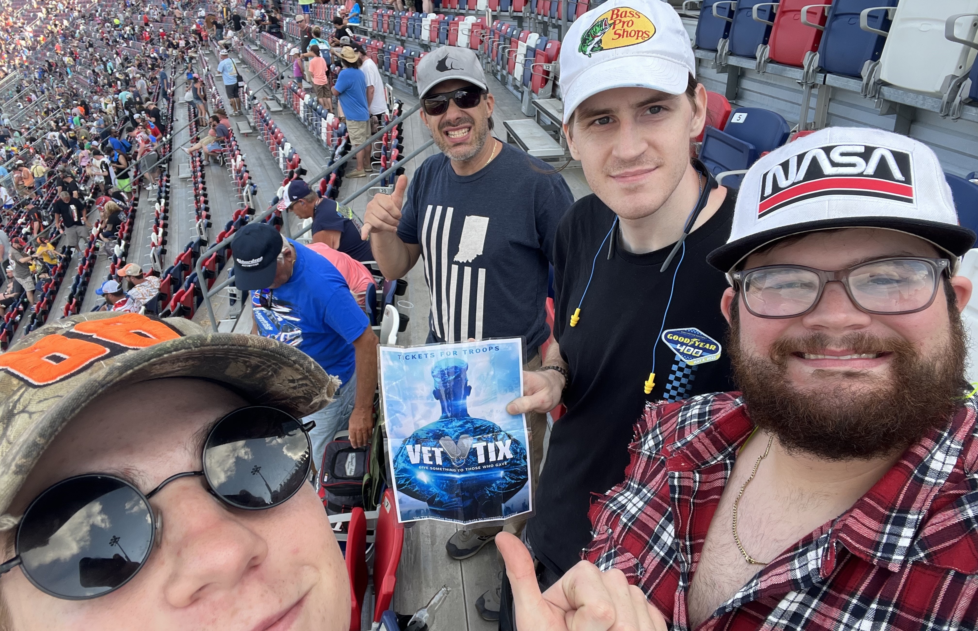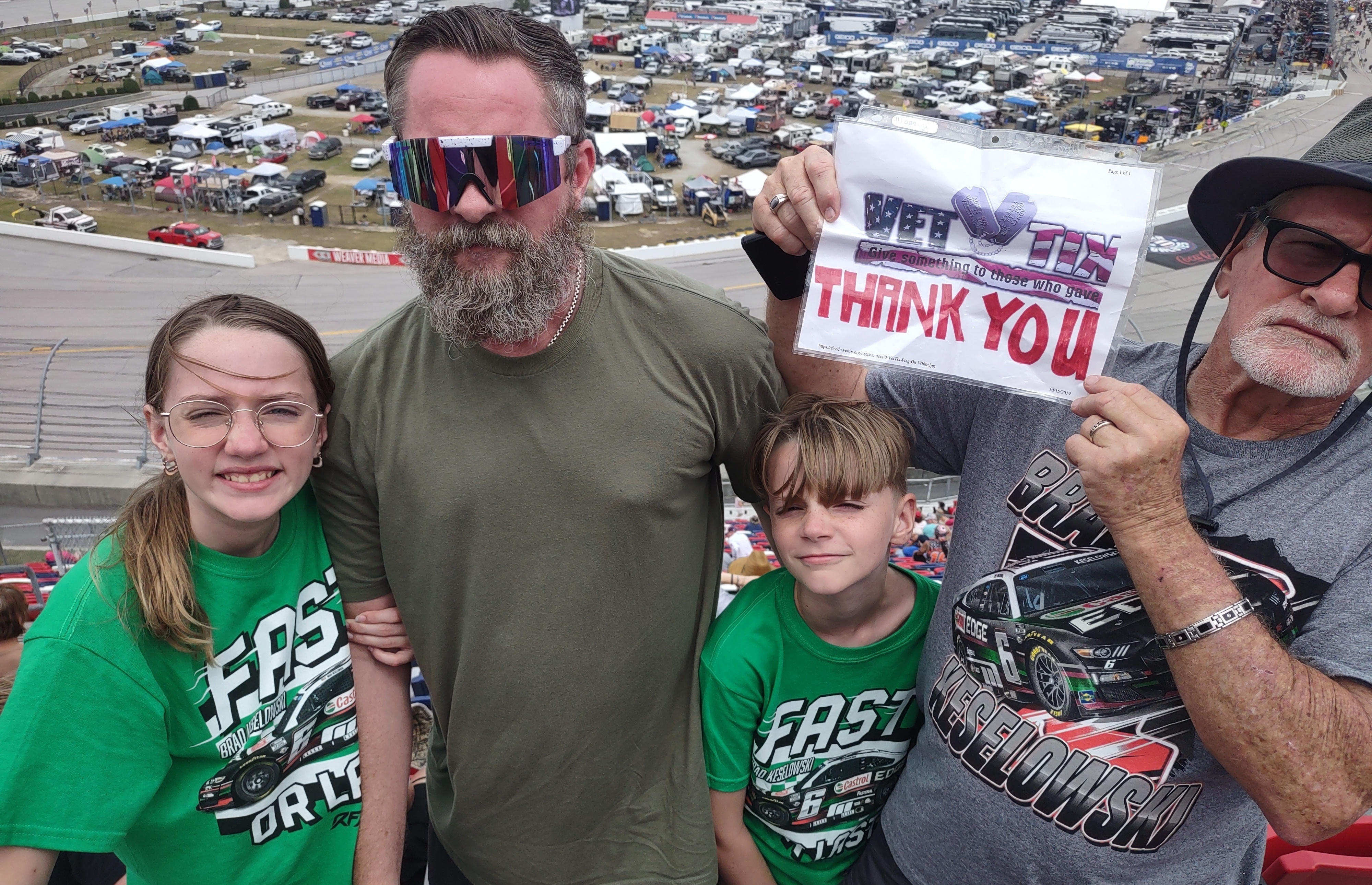 I would like to thank the Veterans Tickets Foundation for the Good Year 400 in Darlington we had a awesome time my wife and I took the grandkids to their very first race and they loved and enjoyed it so much and they want to go again so thank you very much.