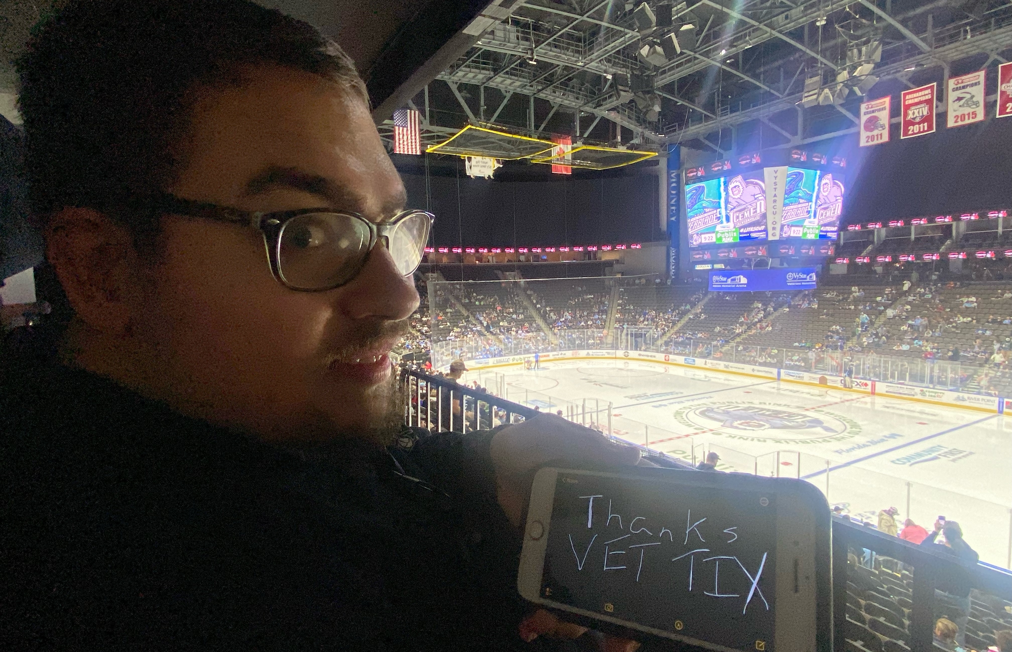 Thanks Jacksonville Icemen - ECHL, Veteran Tickets Foundation Purchases for the donation of tickets. Attending events like this helps veterans to recover from their hidden troubles they face every day. As a veteran it truly means a lot for all the support you have given us.