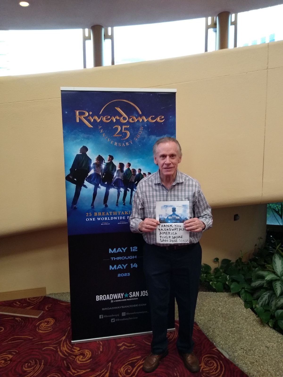 Thank you Broadway Across America for the VETTIX ticket to Riverdance on Saturday, May 13 at the San Jose Performing Arts Center. The show was the first time that I had seen it and it was sensational. I was entranced by the great dancers, musicians, singers, choreography and set designs. It was an evening to remember thanks to your generosity.