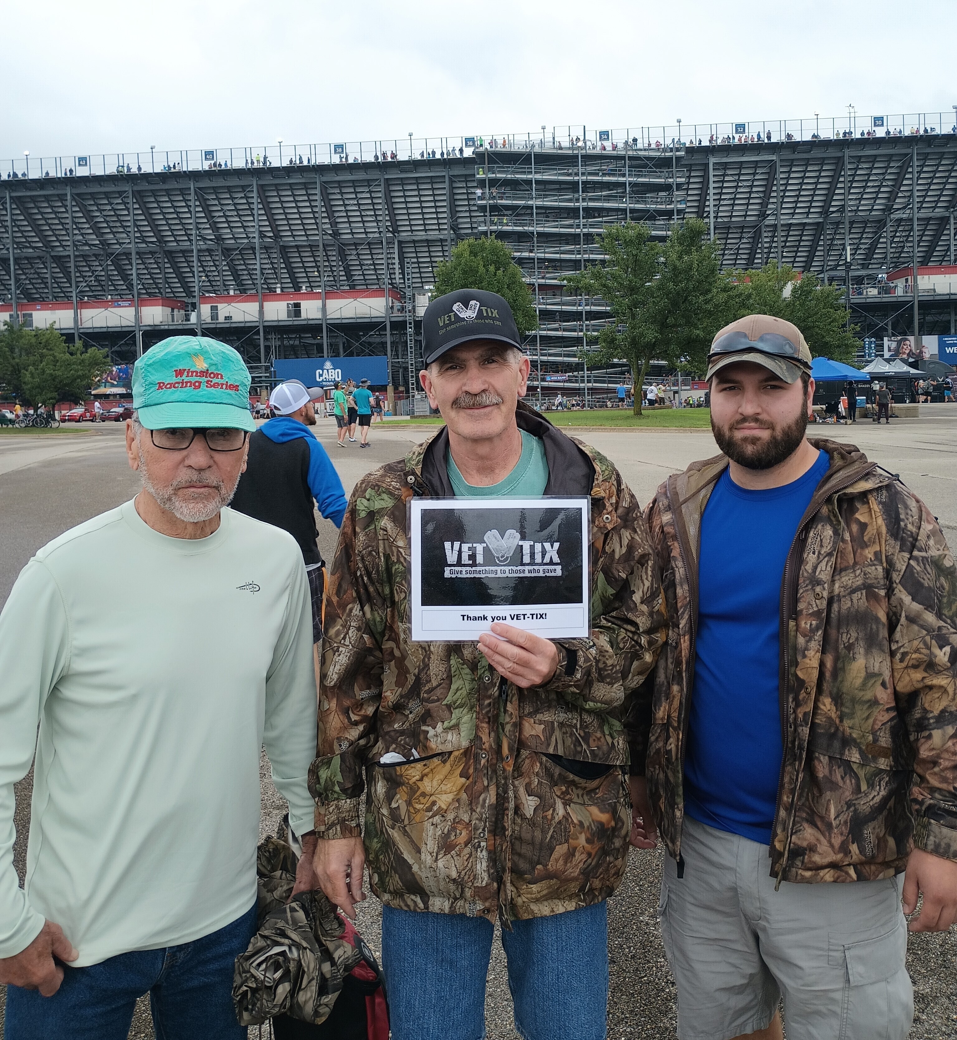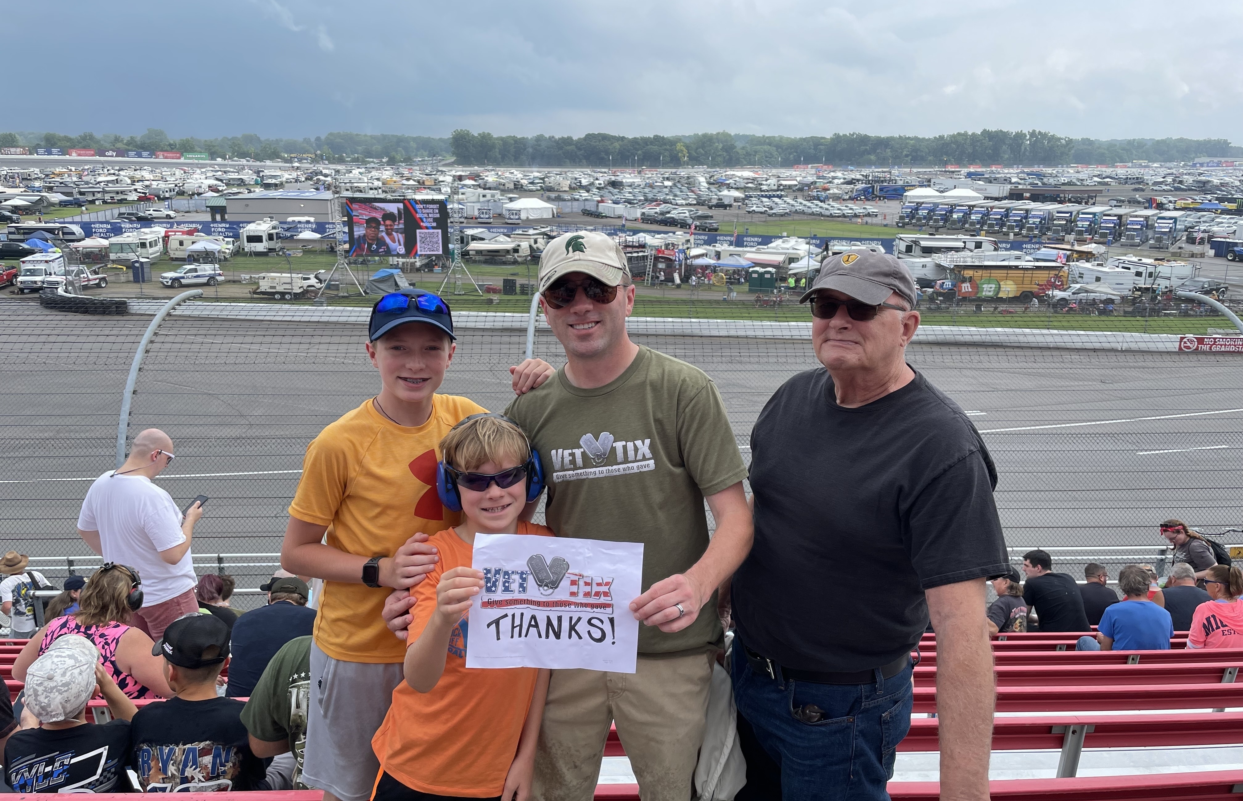 Thank you Michigan International Speedway and Vet Tix for a great day at the races. Your generous donation allowed for three generations to enjoy NASCAR together. We were so pleased the rain stopped long enough for the race to get underway. Thanks again MIS and Vet Tix for all you do to support Veterans.