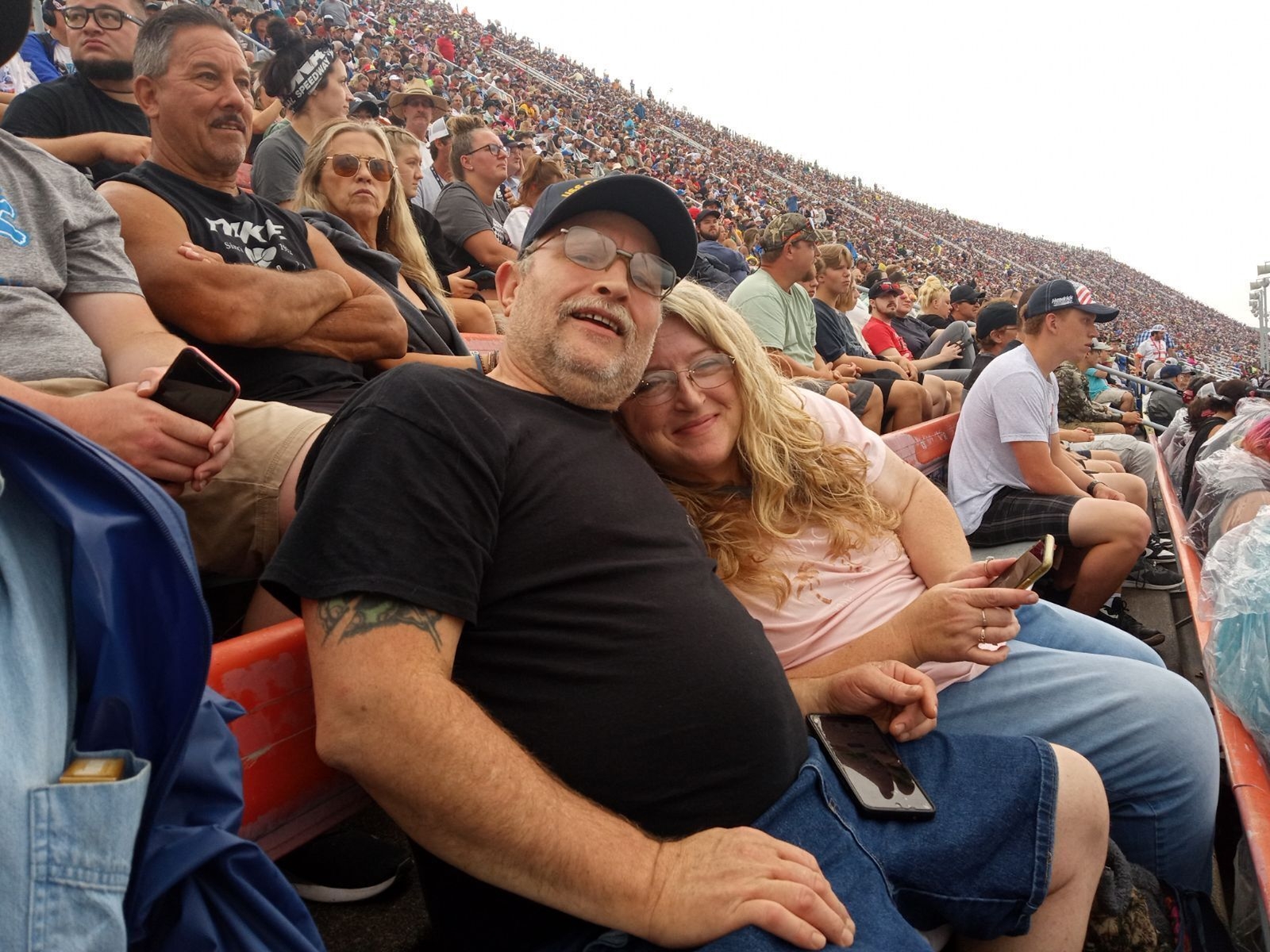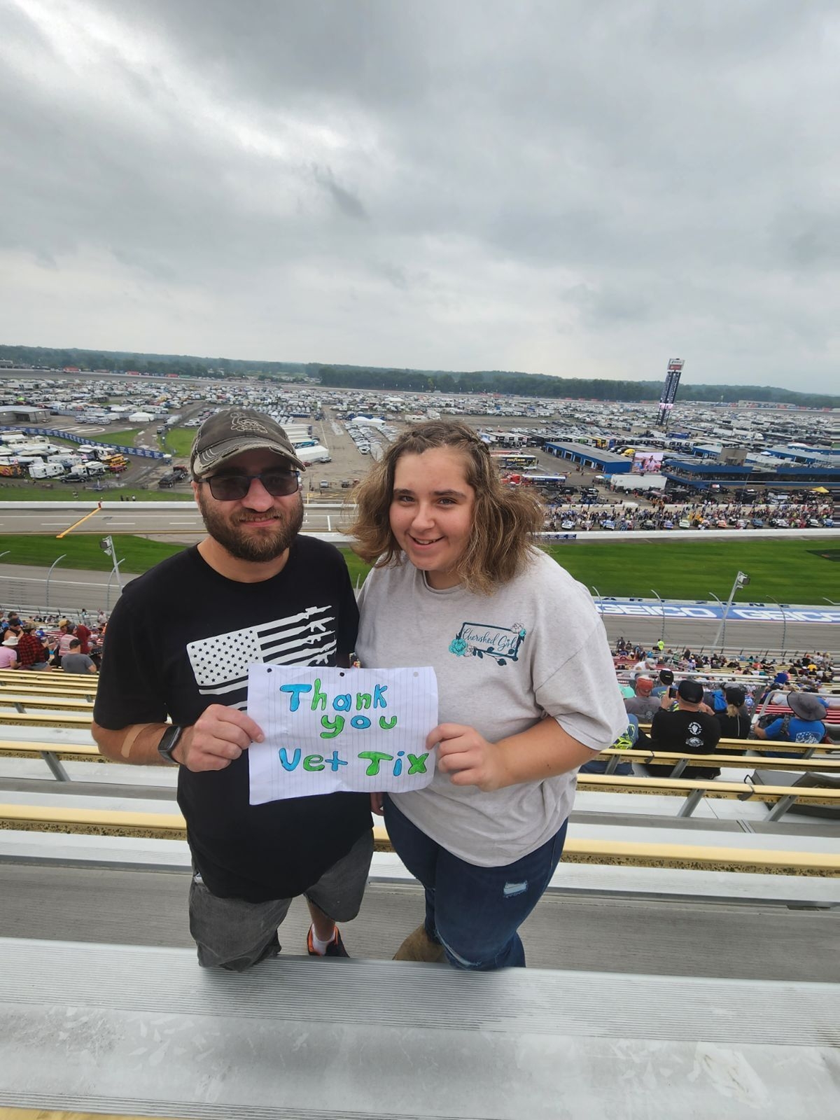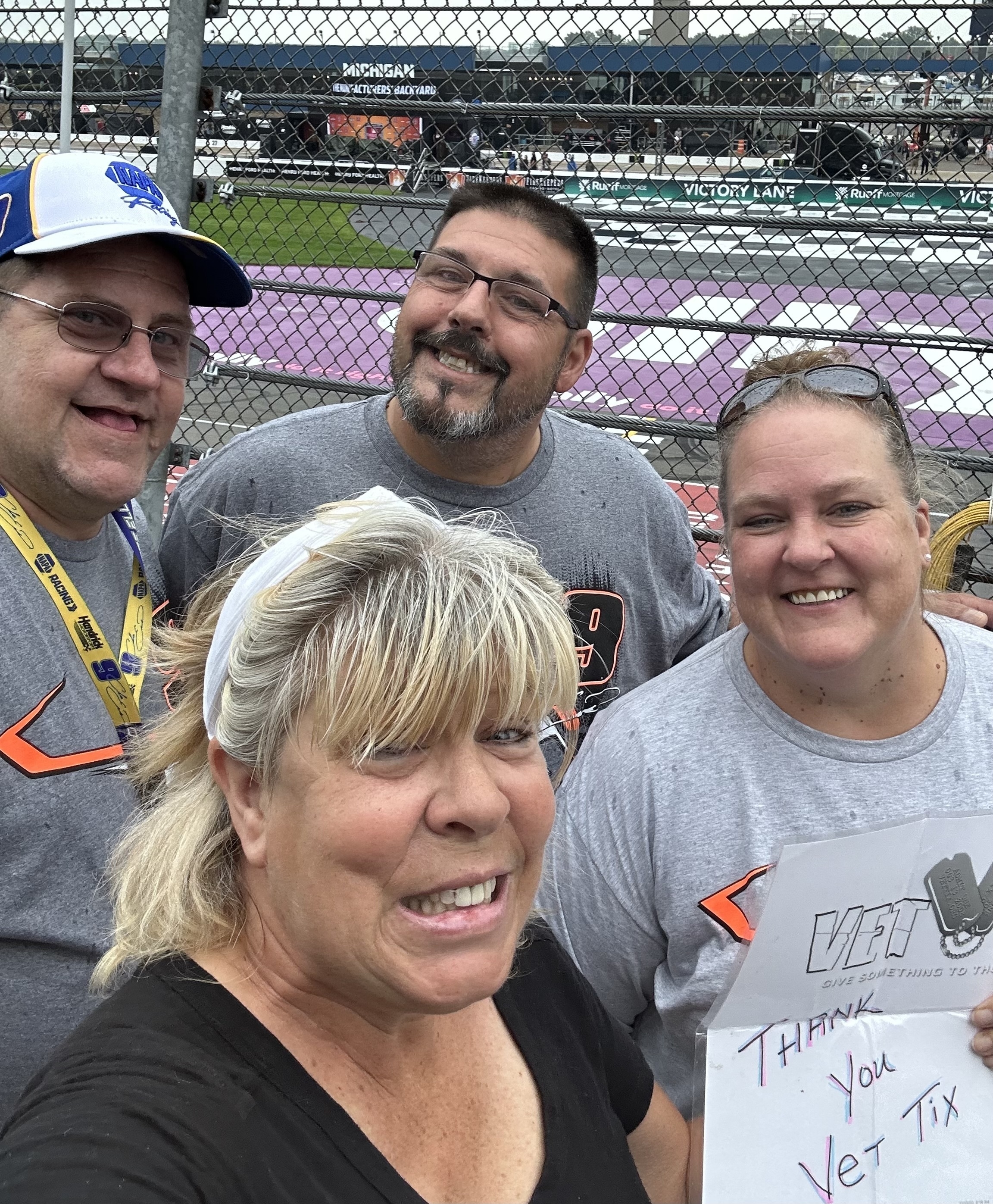 I want to sincerely thank both the Veteran Tickets Foundation Purchases and Michigan International Speedway for another amazing opportunity to see a NASCAR race in person instead of on television! This race has become an awesome tradition for us thanks to these generous donations through Vet Tix. There is nothing like the sound of those cars and looking out at that incredibly huge MIS track - WOW! Even the rain didn't deter us. We hope to continue this Michigan NASCAR race day tradition for as long as possible. Thank you again from both of us!