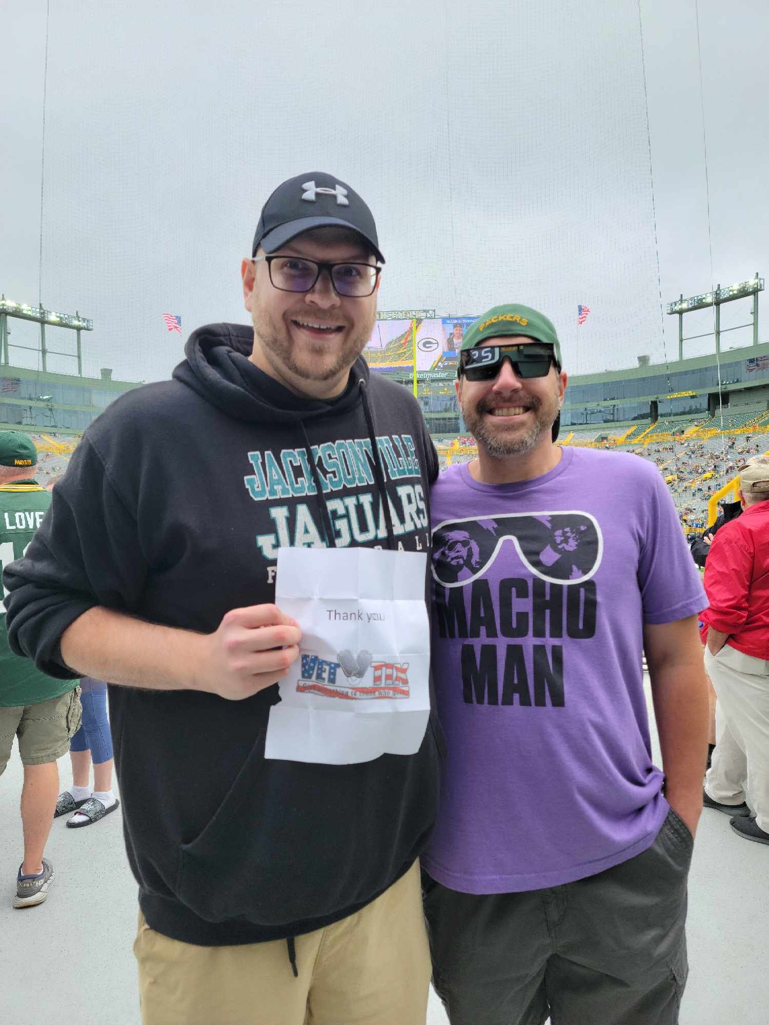 Thanks to Vet Tix and everyone who donated to make this game possible for me and my son, Aiden. This was our first NFL game experience. As a life long Packers fan, you helped create a wonderful experience for me and my young son.