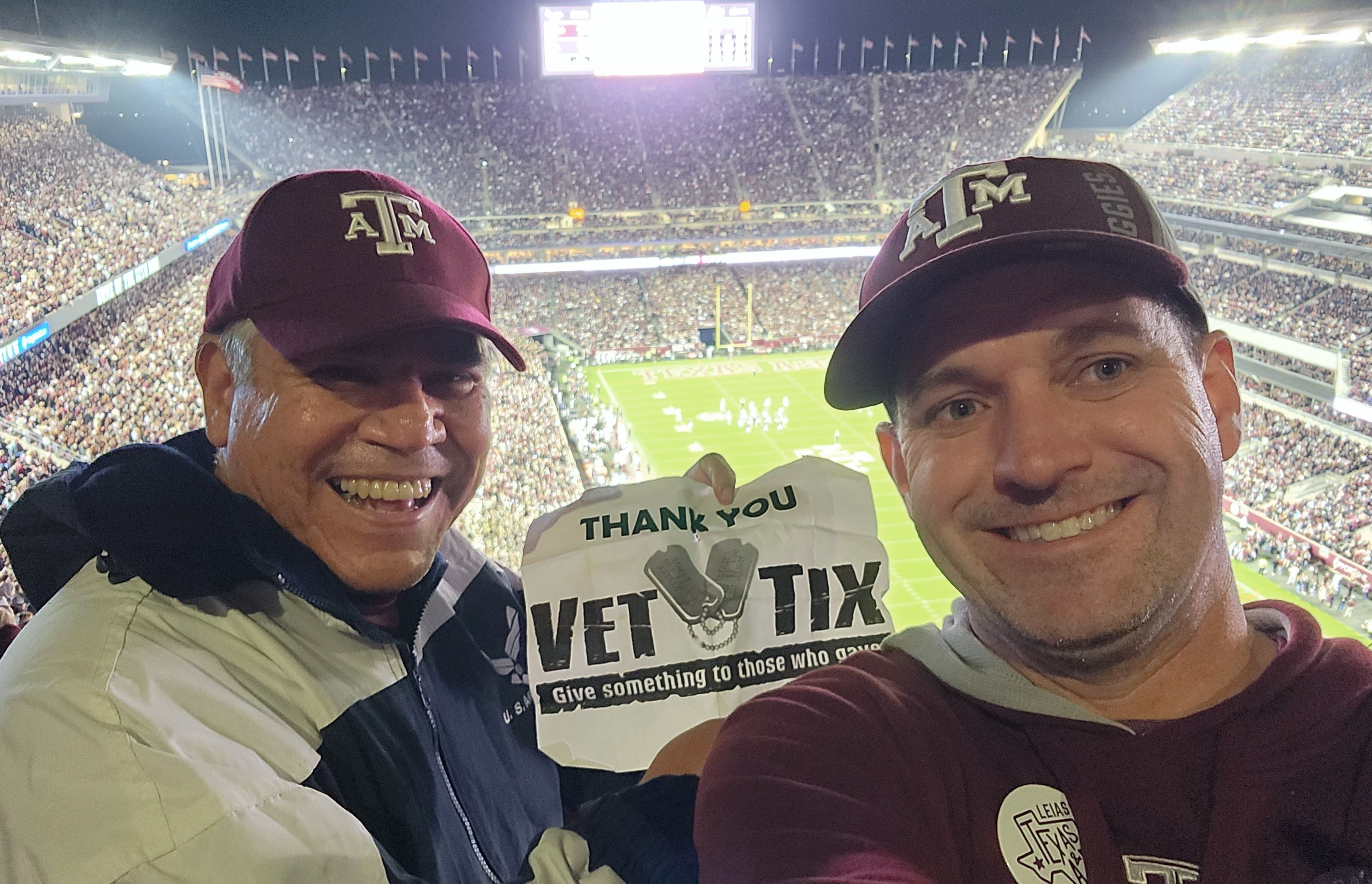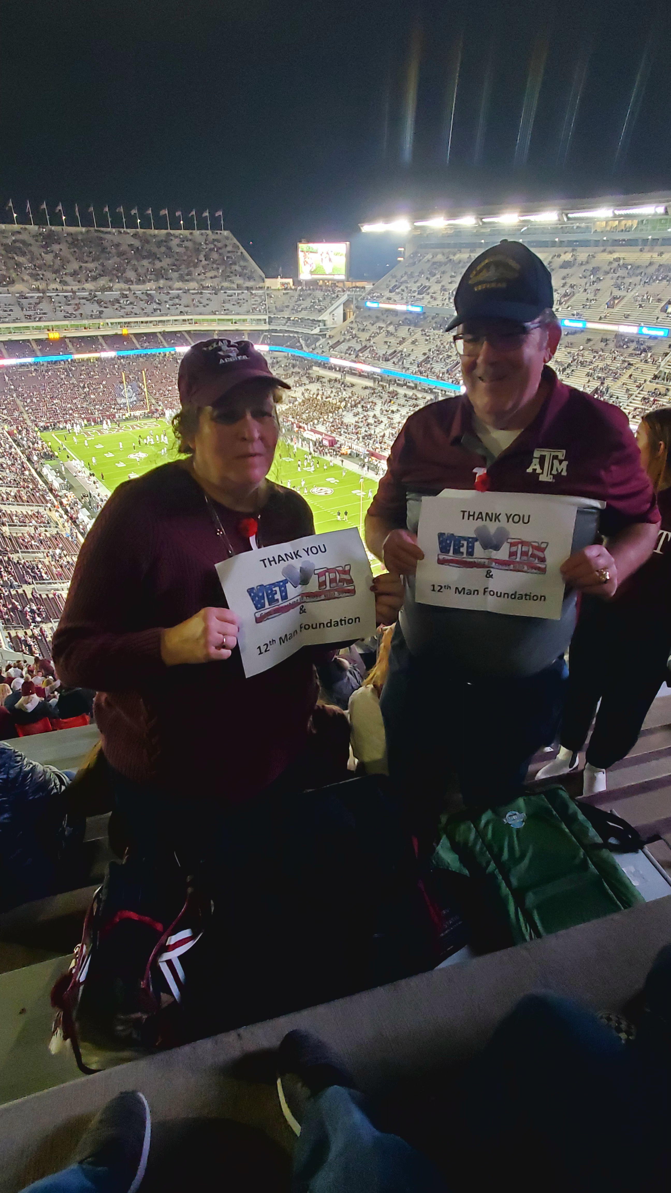 Thank you go Vet Tix and the 12th Man Foundation. We had a great time at the game, great to see a win. Love attending night games at Kyle Field.