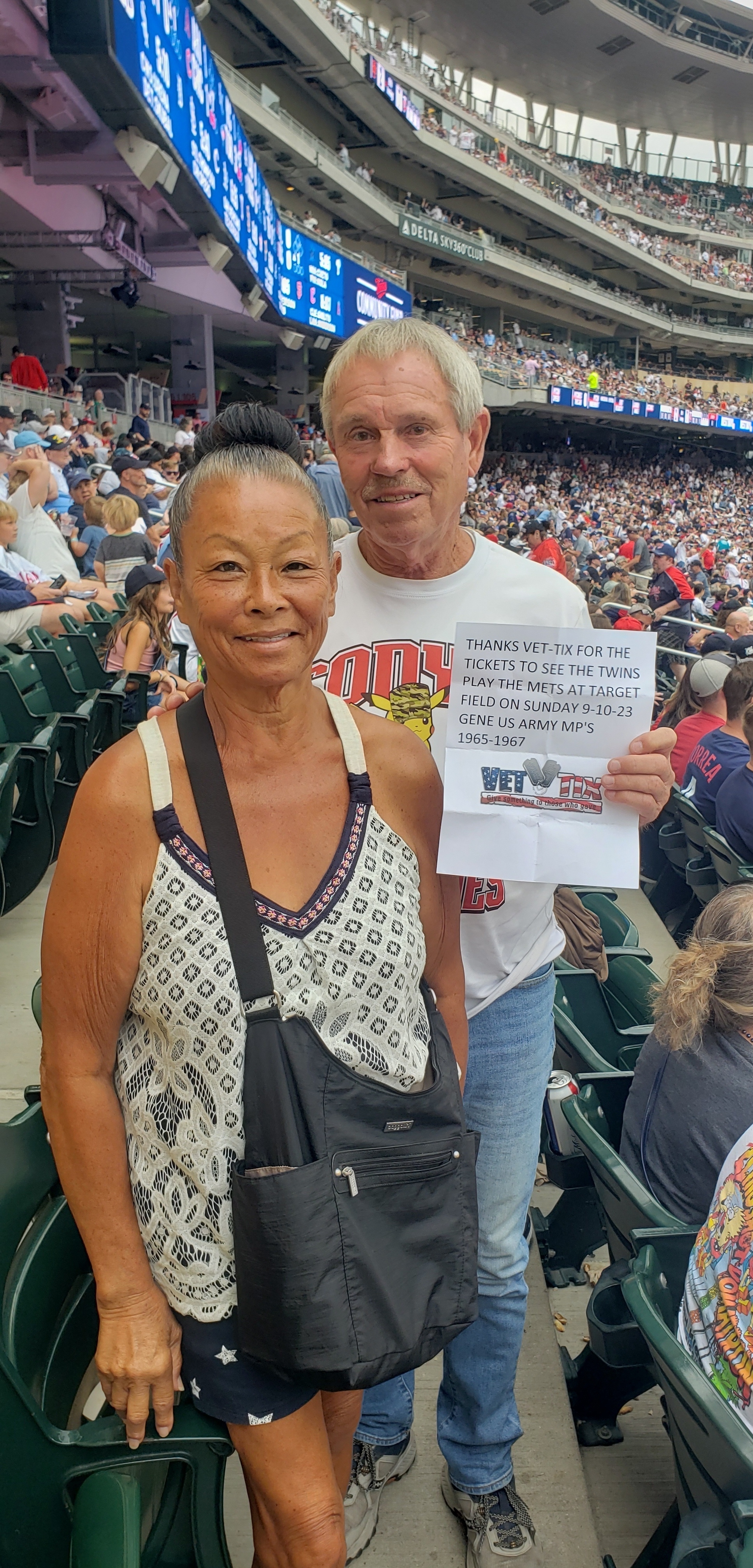 I would like to thank the Minnesota Twins MLB and VET-TIX for the tickets to see the Twins beat the Mets at Target Field yesterday. The Twins beat the Mets and are on there way to winning the division hopefully. Thank you again. Gene US Army 65-67
