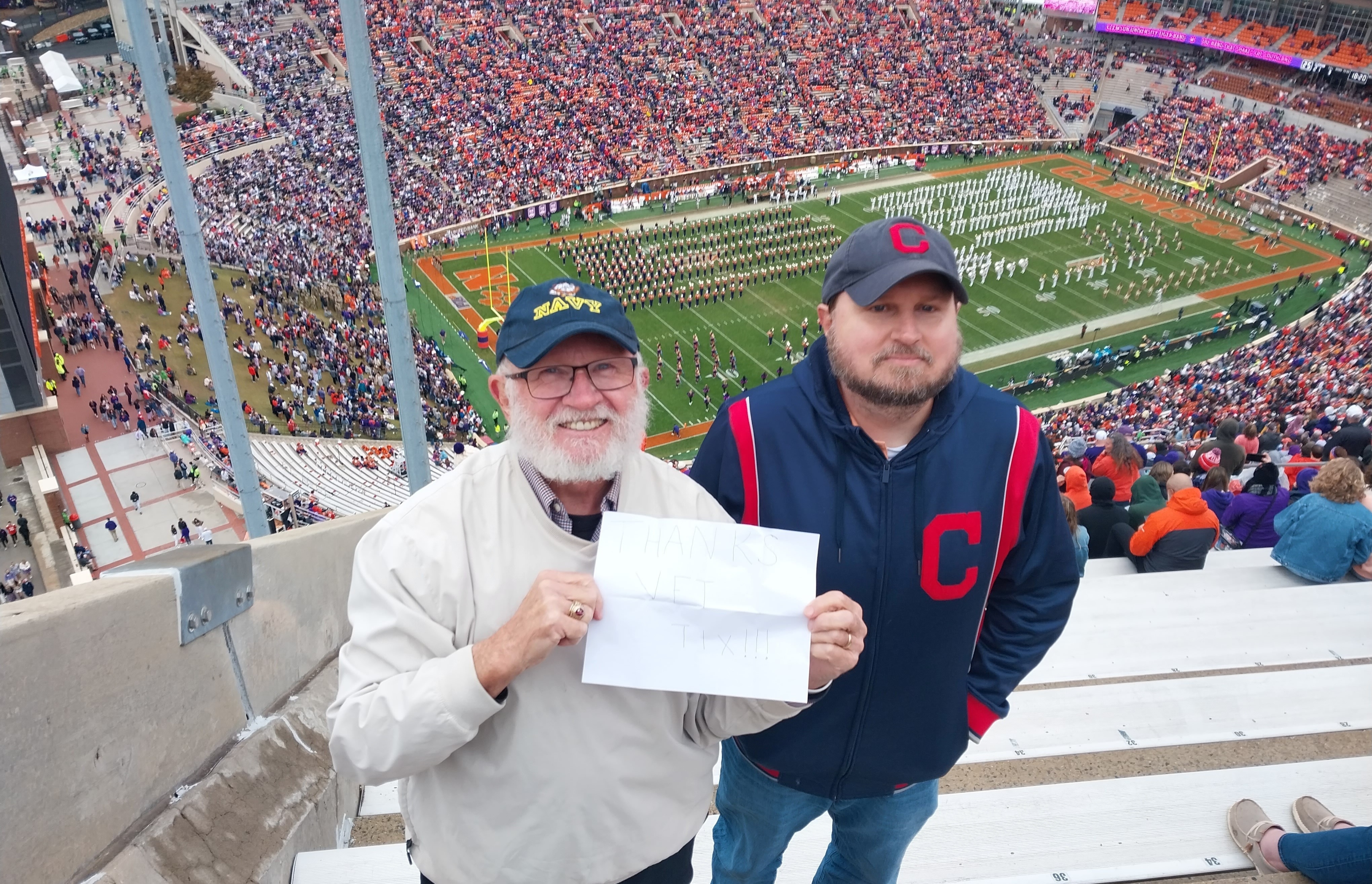 Thank you for the Clemson football tickets. We had a great time, and the halftime Veteran’s Day show was touching. Thank you
