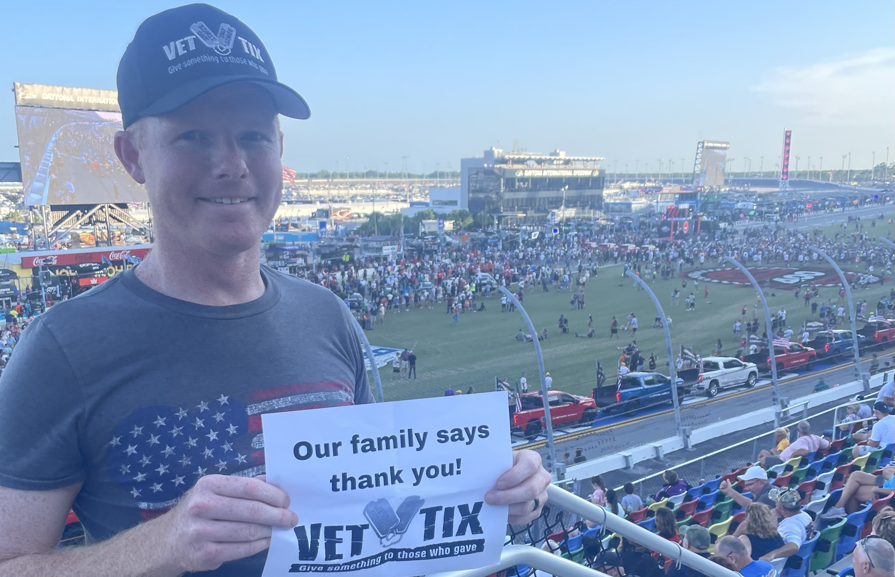 Can not Thank Vet Tix's and those who support the Program Enough! We had a awesome time. It was our first Vet Tix event! Tip: If you go to a NASCAR Race at the Daytona Speedway, Go Early! Thanks Again!
