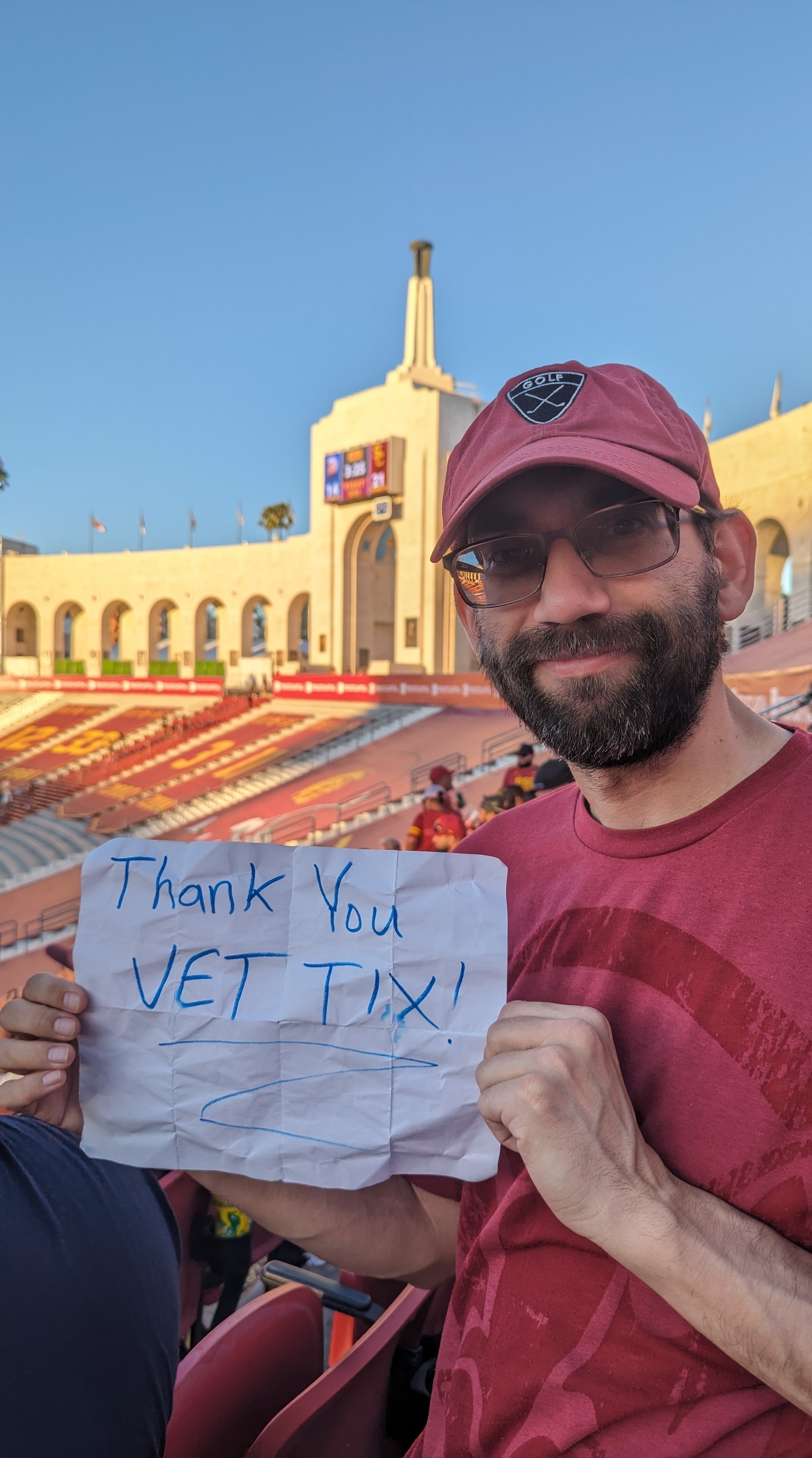 Hello Vet tix, I would like to thank you for the free tickets to this honorary first USC trojan football game. Me and my lady had a great time at the game. Also, I wore all yellow outfit which is different from everyone else. I received so many looks and compliments that I thought I was famous. Thanks again.