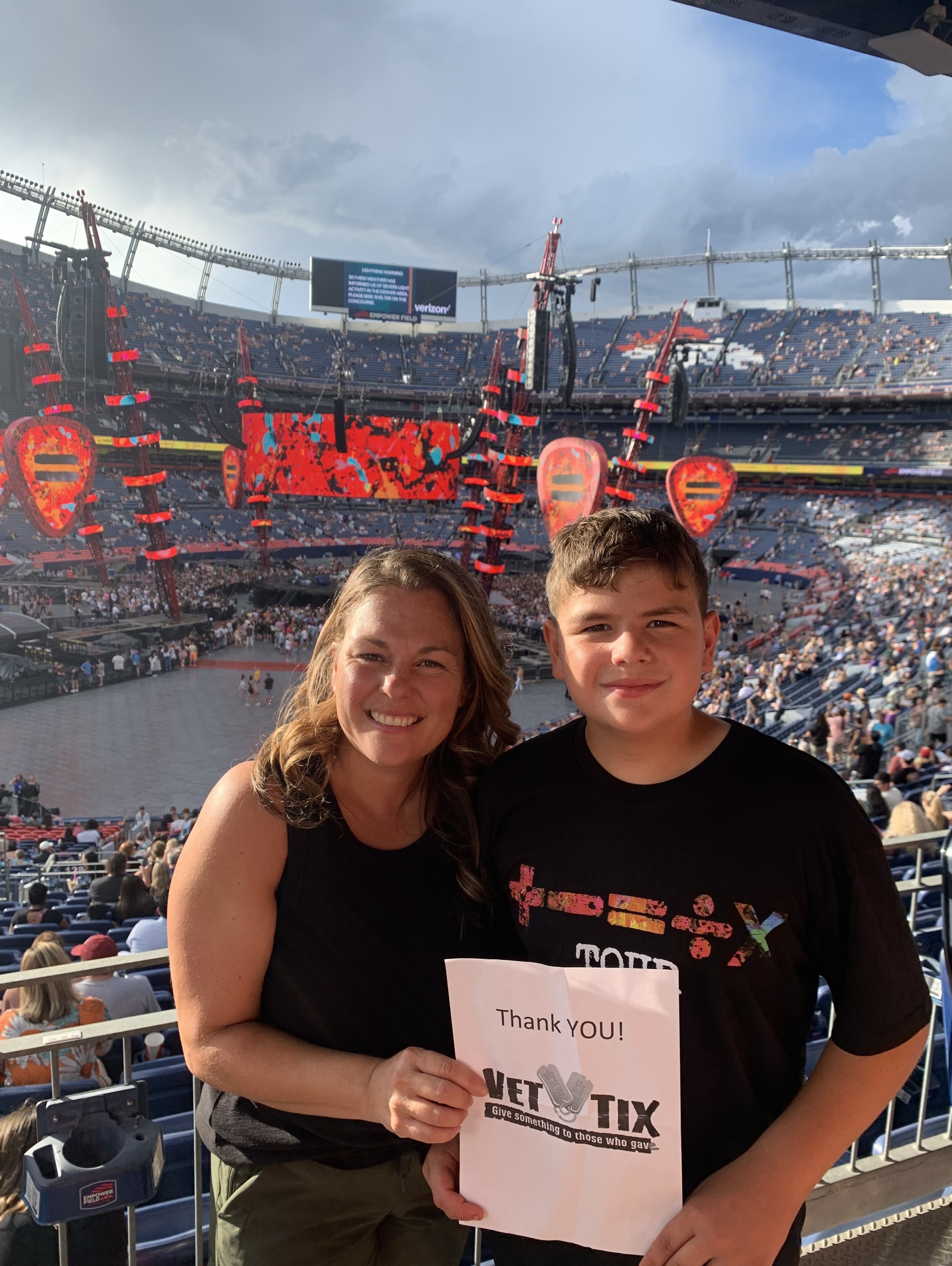 WOW!! THANK YOU, Messina Touring Group, LLC and VetTix for the tickets and the opportunity to see Ed Sheeran. Cannot say enough, he is one heck of a performer!! I am sure the 85K in attendance were wondering if the weather was going to ever clear up, but once it did, HE DID NOT DISAPPOINT!! Everyone should once in their lifetime see him perform because Ed Sheeran is definitely climbing that ladder of greatness, he had Mile High Stadium rocking!! Thank you all so very much again!! To say my Family and I had a blast is most definitely an understatement!! :)