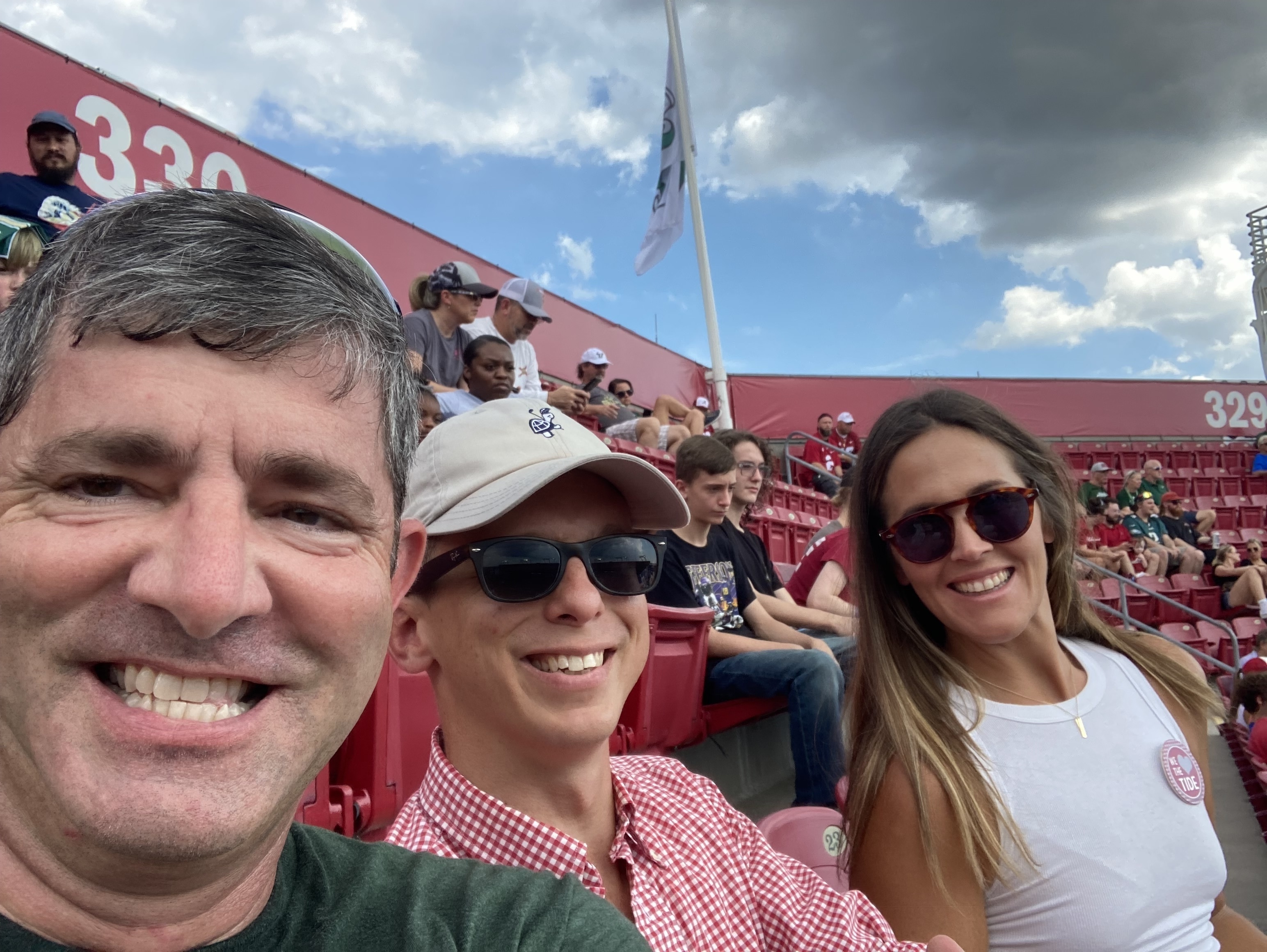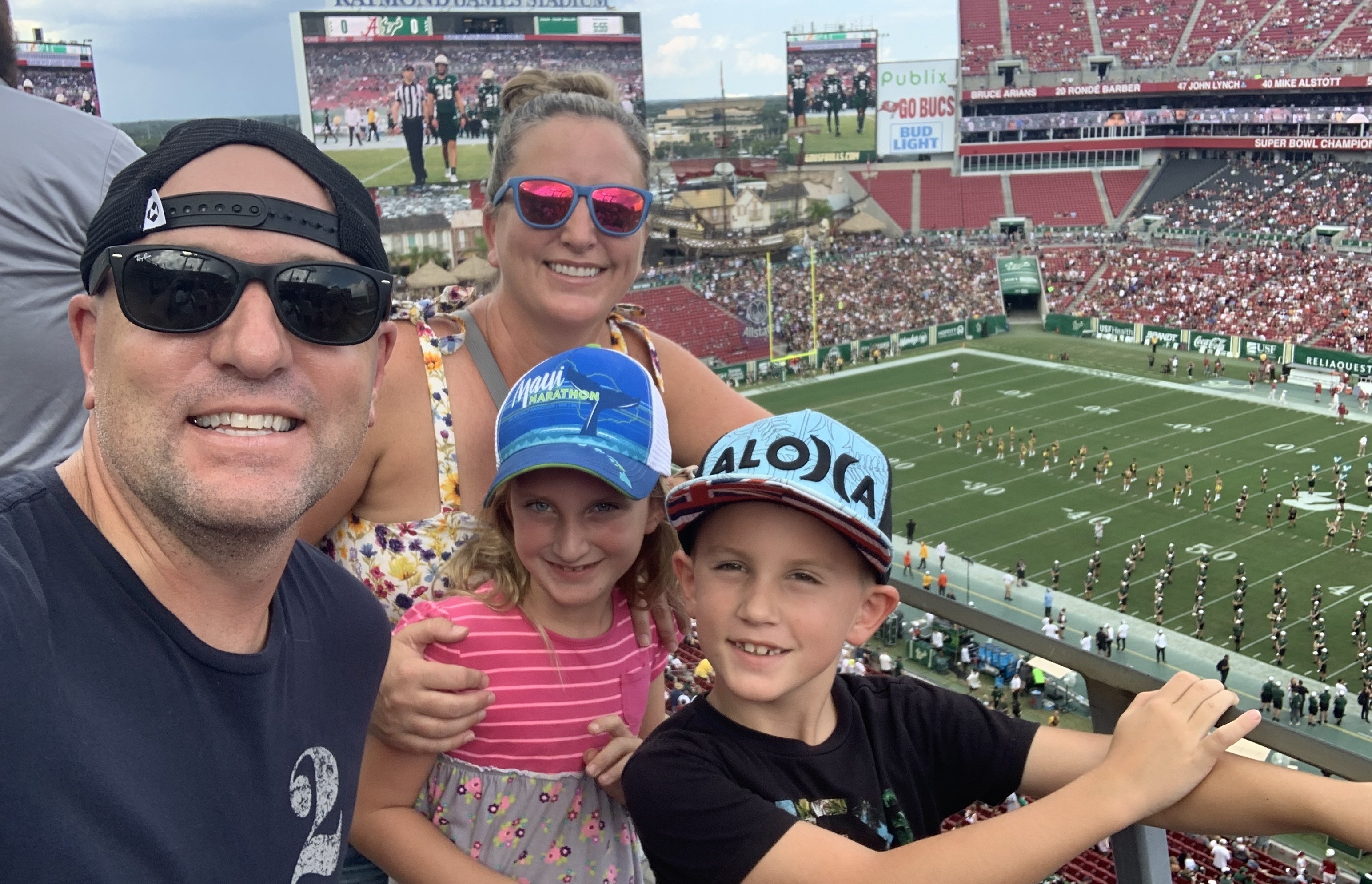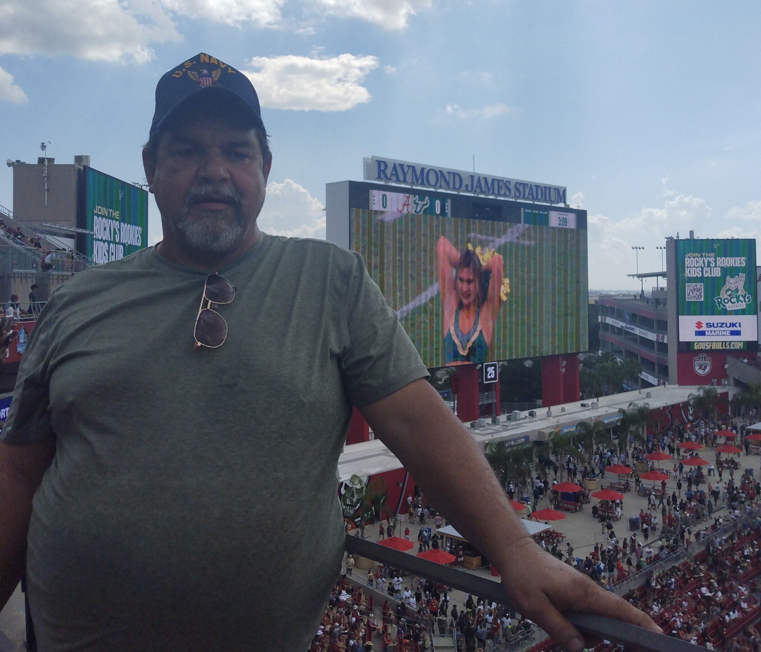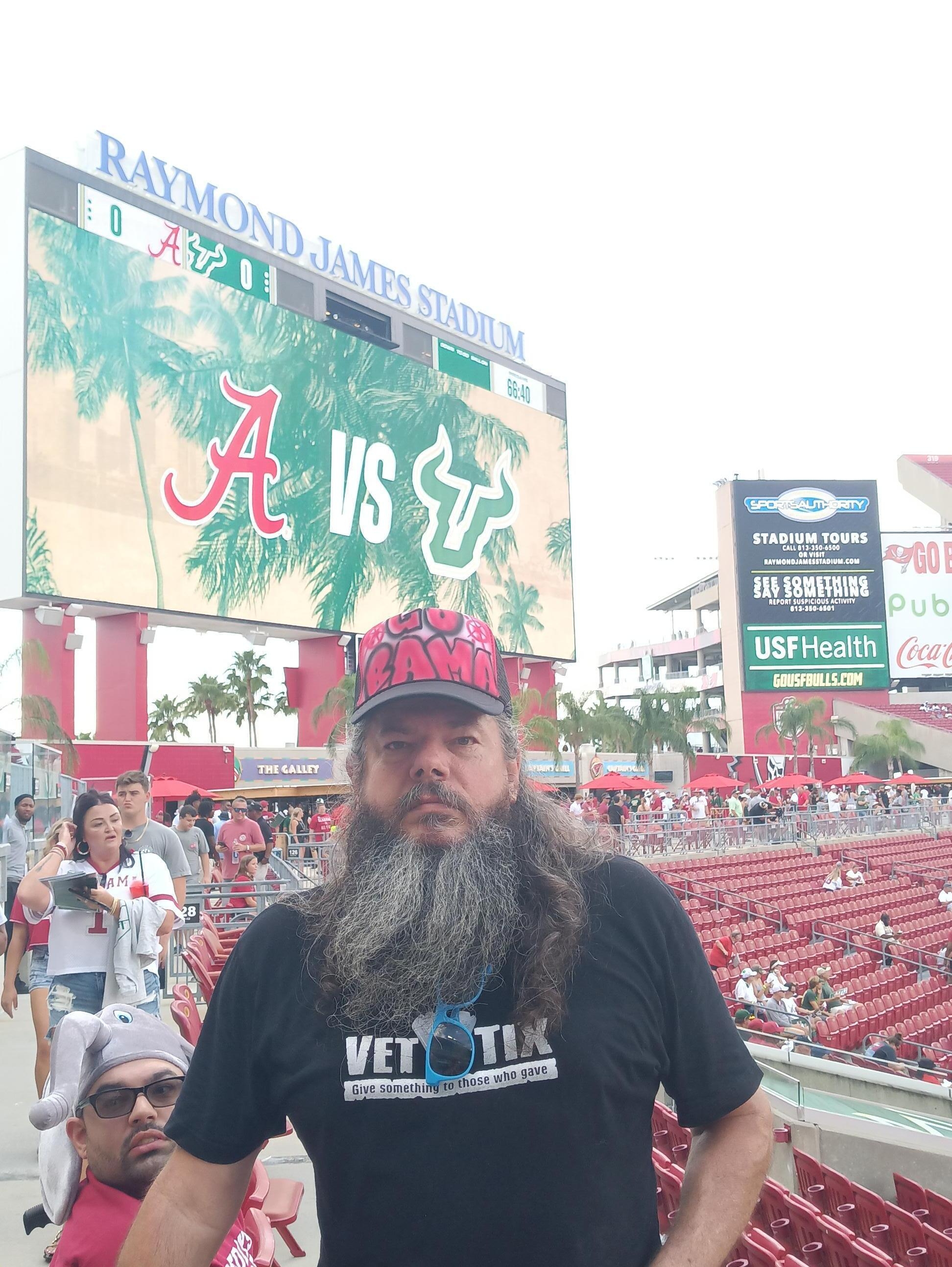 Thank you so much for the tickets to the USF/Alabama game!! We very much enjoyed watching Alabama struggle against the Bulls!! Three out of the four of us in the picture are veterans. We appreciate individuals and organizations recognizing our contributions and sacrifices for nation’s security!