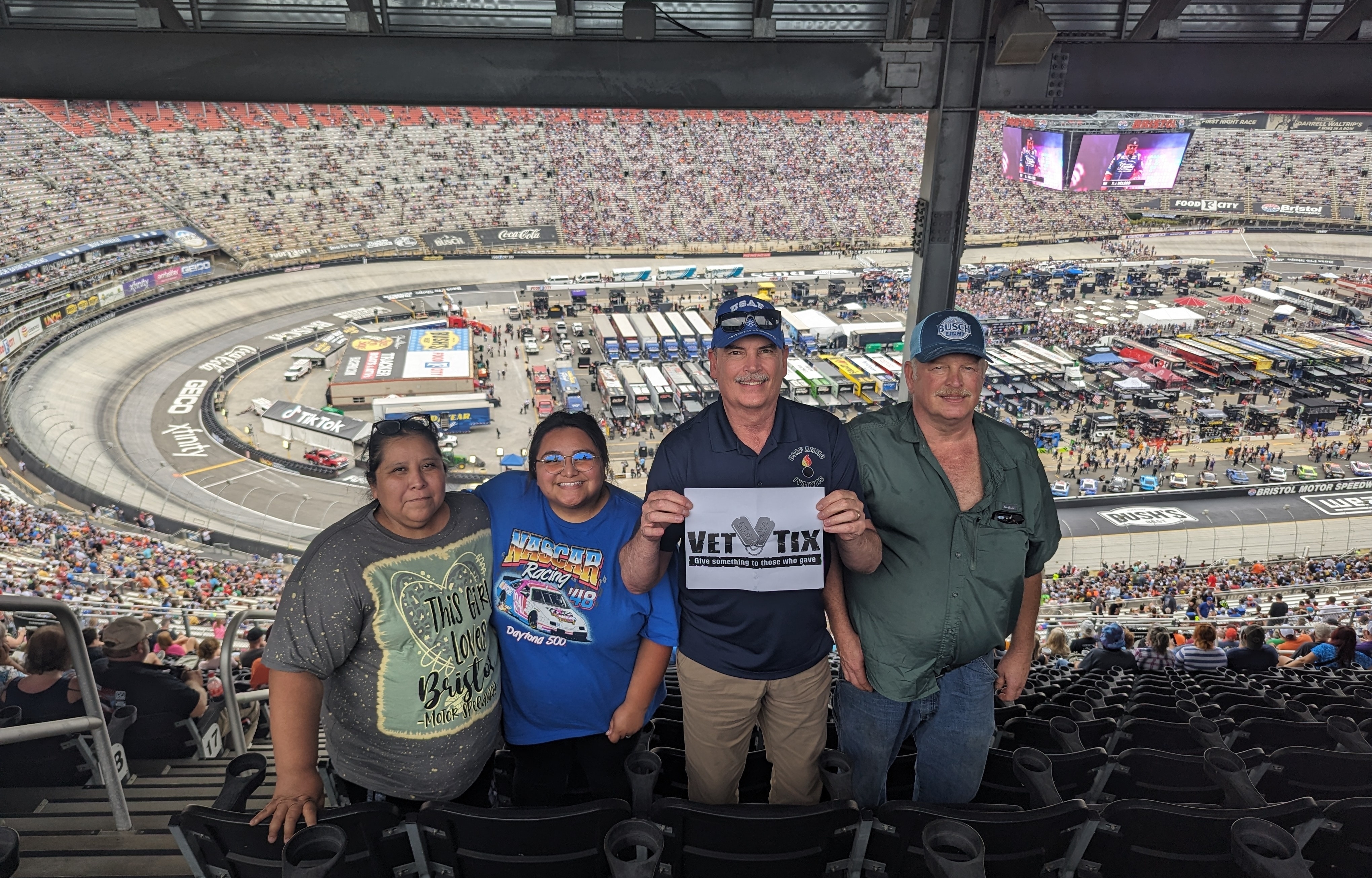 Thank you Veterans Tickets Foundation Purchases and Vettix. We had an awesome time at the Bass Pro Shops Night Race at Bristol Motor Speedway.