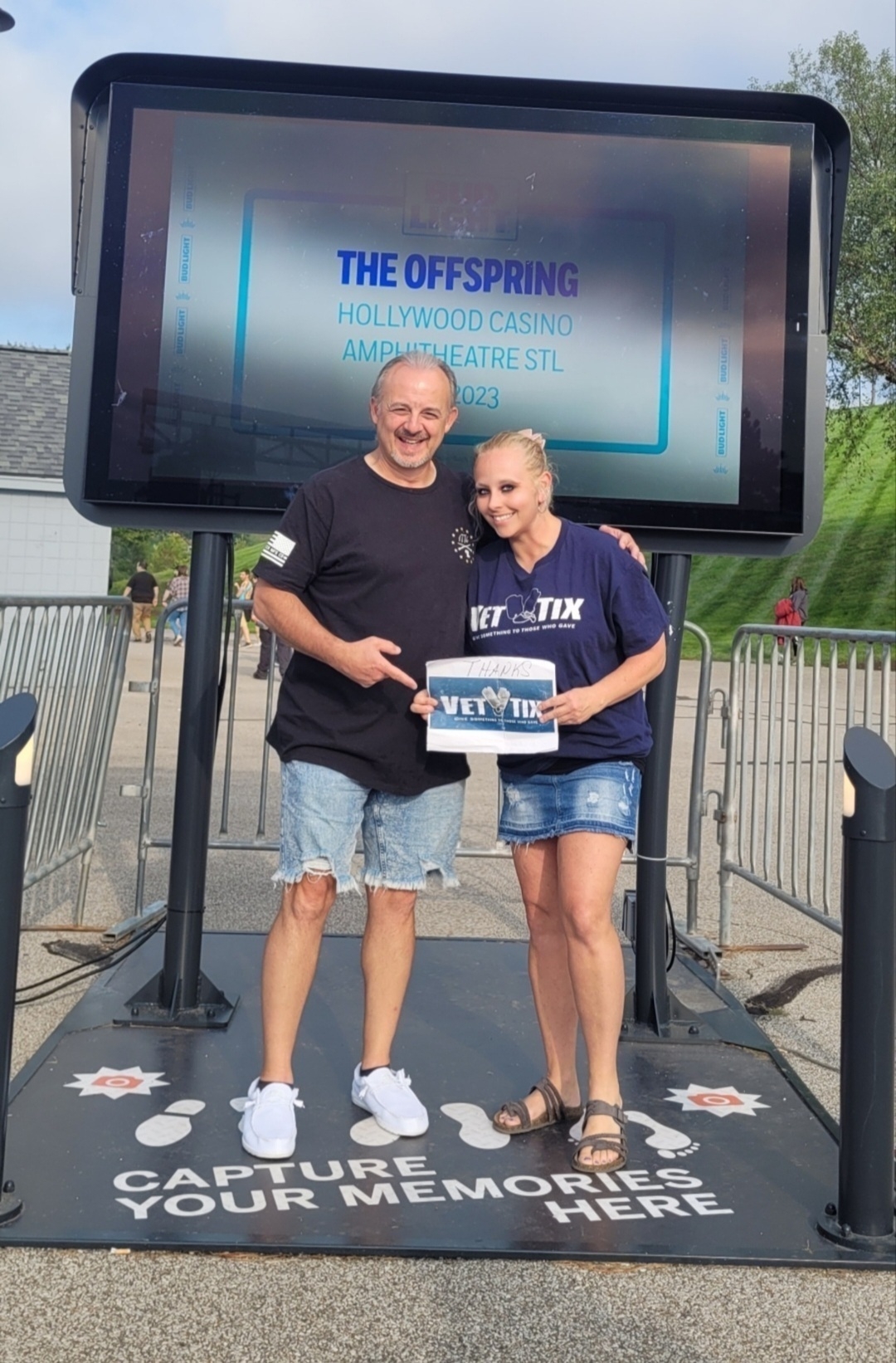 Thank You Live Nation for the Tickets to see The Offspring. We had a blast. We loved the concert. We are standing inside the Amphitheater in front of The Offspring sign. Dated August 27th 2023. We are wearing our Vet Tix Shirt and holding our Vet Tix sign. 30 points earned!!! Thank you!