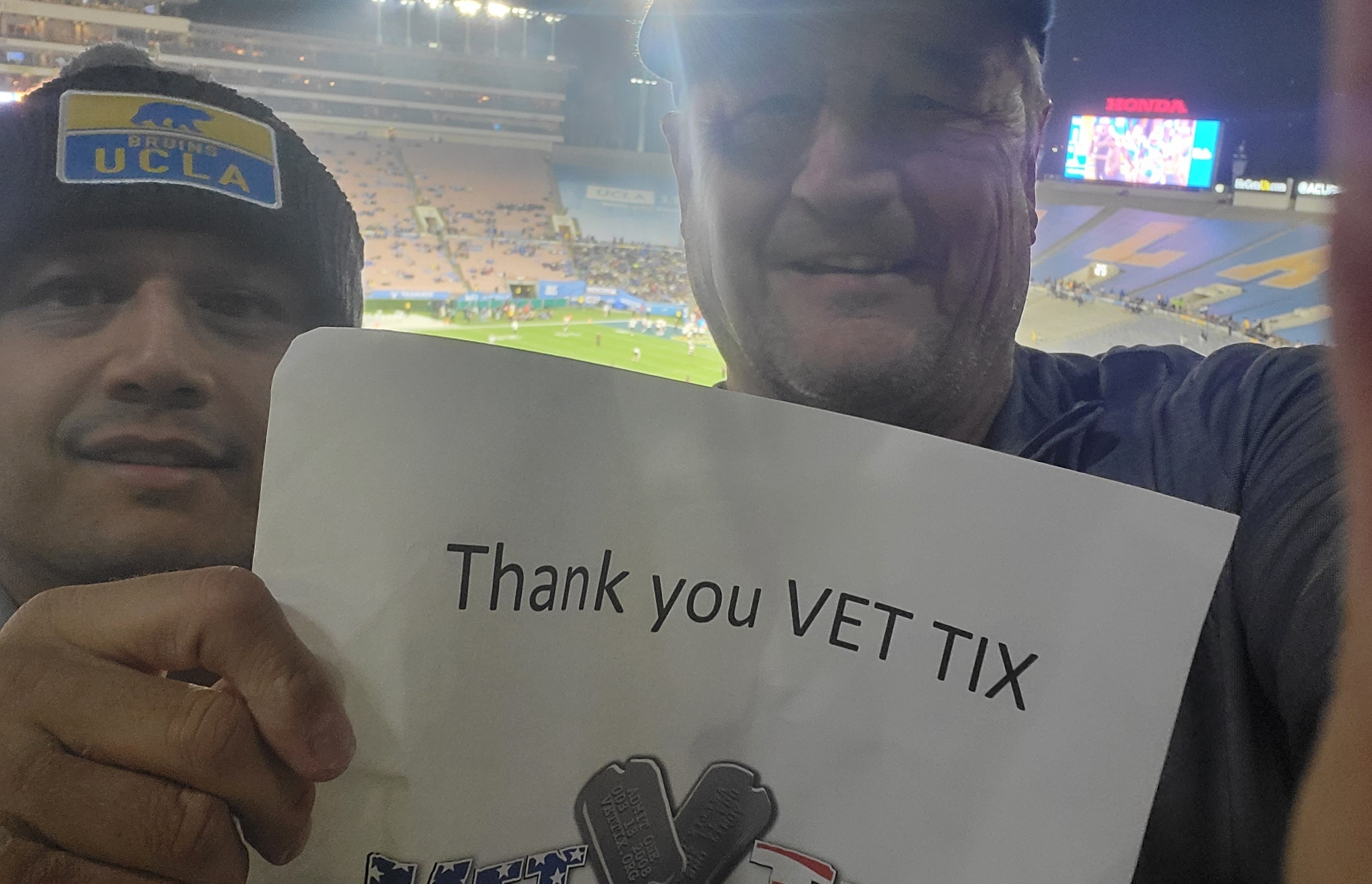 want to give a big thank you to VETTIX and UCLA for donating these tickets to us Veterans. These tickets allow us to attend games that we wouldn't be able to attend otherwise. This also gives us a little peace of mind and family time together. We couldn't have been happier at this game. Thank you.