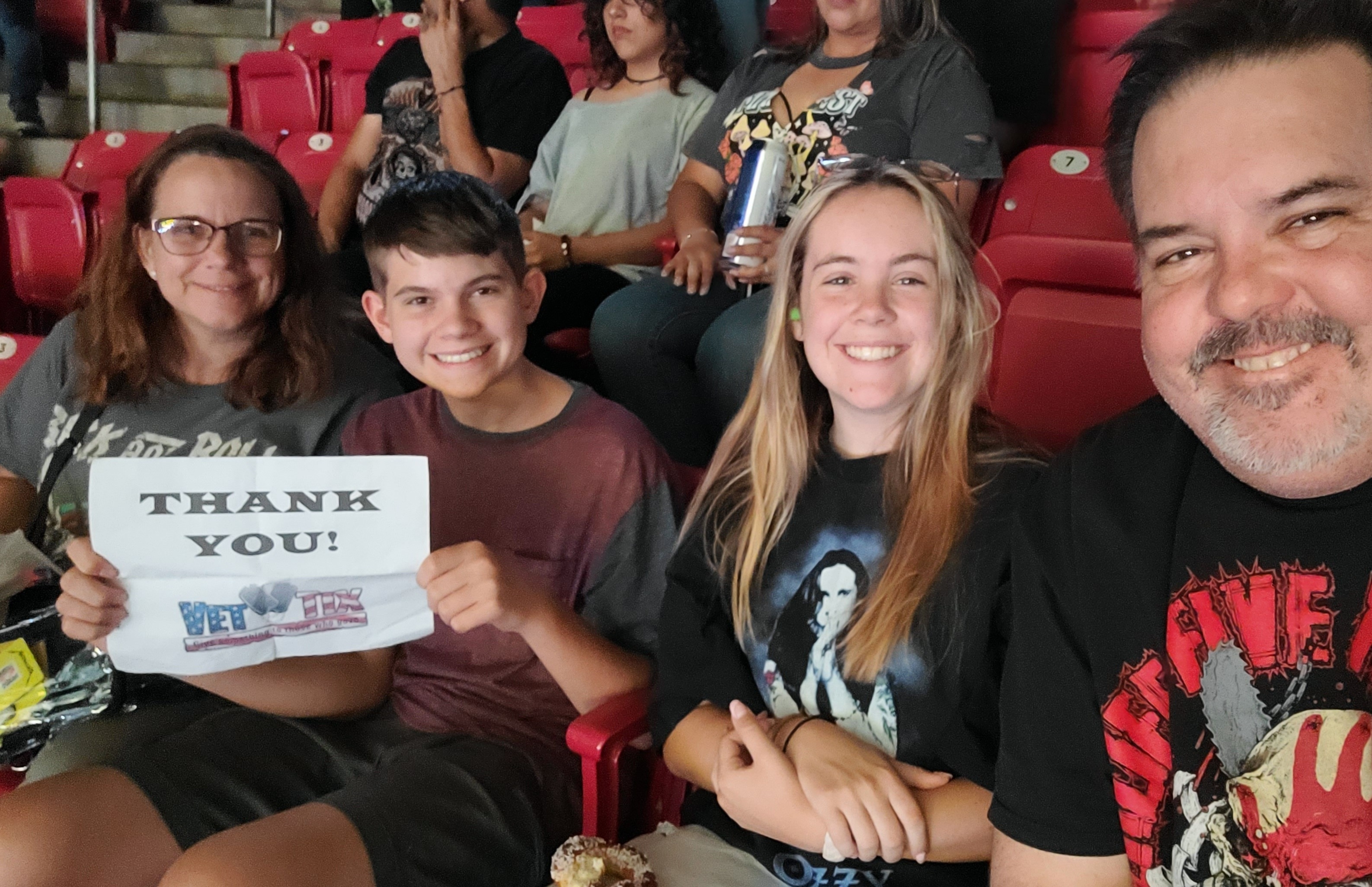 Thank you to Live Nation for their support for our nation's veterans. Their continued generosity allowed my family to see the Metallica: M72 World Tour last weekend. The show was awesome, the venue was great, and the overall experience was amazing. Thank you!