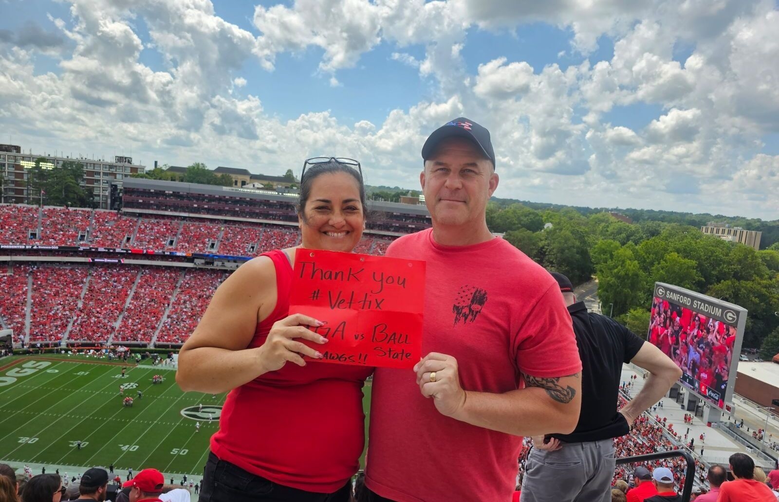Thank you University of Georgia Athletic Association, Veteran Tickets Foundation Purchases. We really enjoyed watching the UGA-Ball State game. It was my wife's first-ever visit to Sanford Stadium and my first since the days of Herschel Walker. Also good to see Joey Chestnut before the game started.