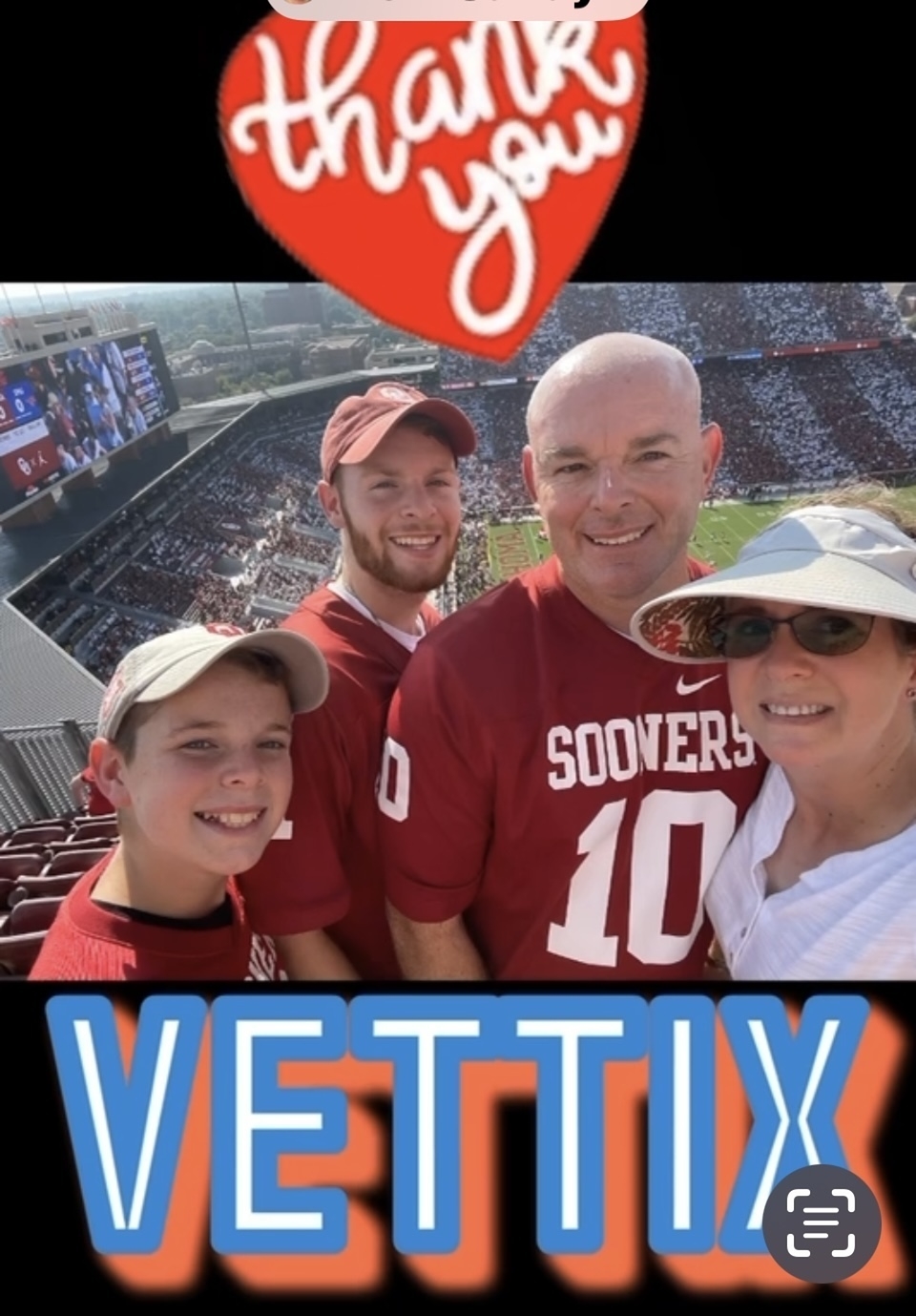 Thank you to the University of Oklahoma for supporting VetTix and giving me and my family the opportunity to attend the game. If it was for your generosity, I would not have had this opportunity.