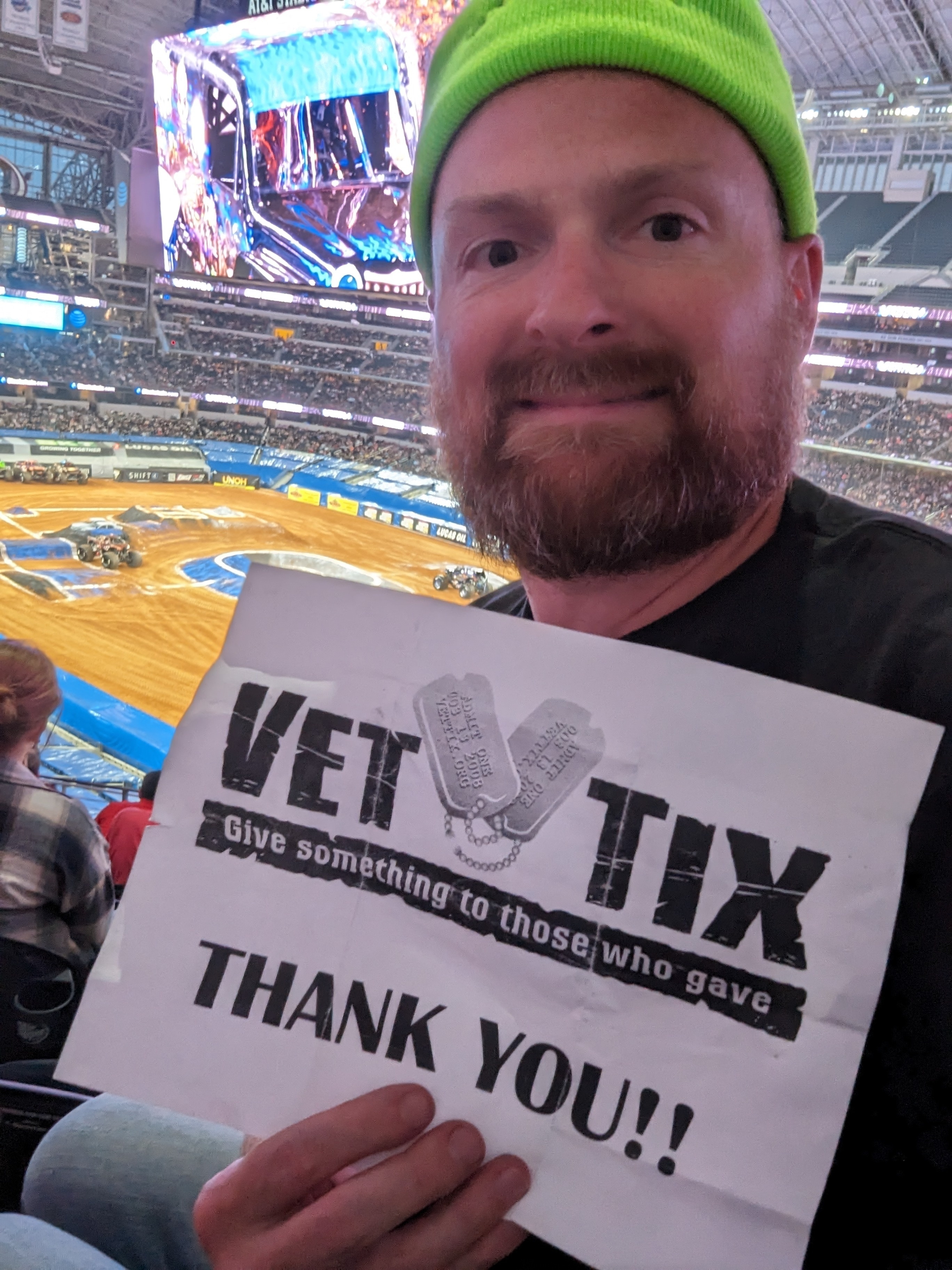 Thank you to Feld Entertainment, Inc., Veteran Tickets Foundation Purchases for the donated tickets for me and my family to enjoy monster jam at Dallas cowboys stadium. We got loud with everybody else and had a great time.