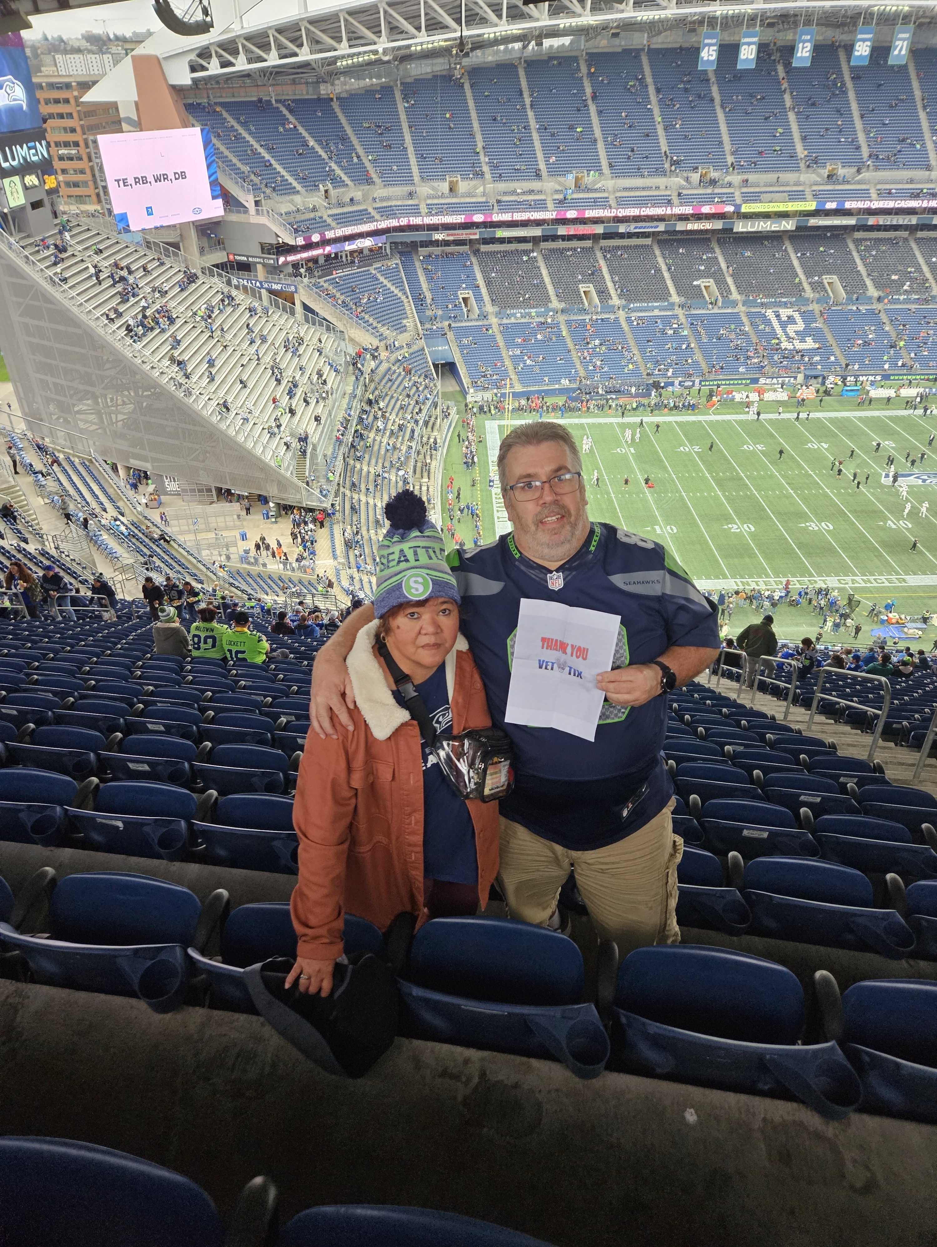 Thank you Vettix and Veteran Tickets Foundation to the Seattle Seahawks game. My wife and I had a remarkable day watching her favorite team. A victory for Seattle, beautiful weather and fine Veterans though out the stadium!