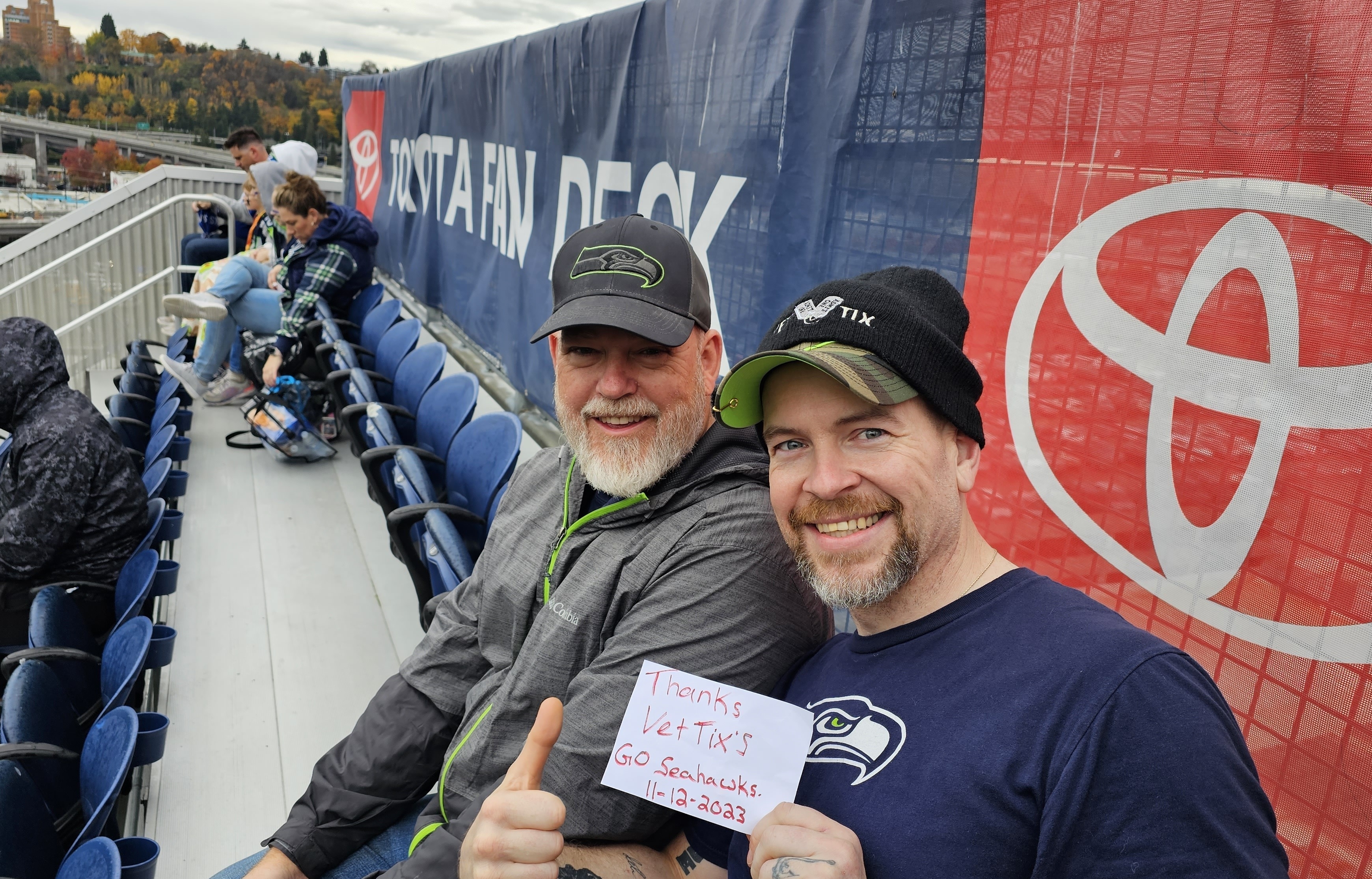 I want to share a huge THANK YOU for the kind generosity of the Veterans Tickets Foundation who gave my family and I the opportunity to experience an amazing night at our very first NFL game. It was between our hometown Seattle Seahawks and Washington Commanders with Seattle winning in the last 3 seconds. We had a great time and our spirits are lifted. The night was even more special over Veteran's Day weekend with recognition for all who served and the numerous messages from VetTix and other supporters of the US military. Thank you for what you do for all who served.