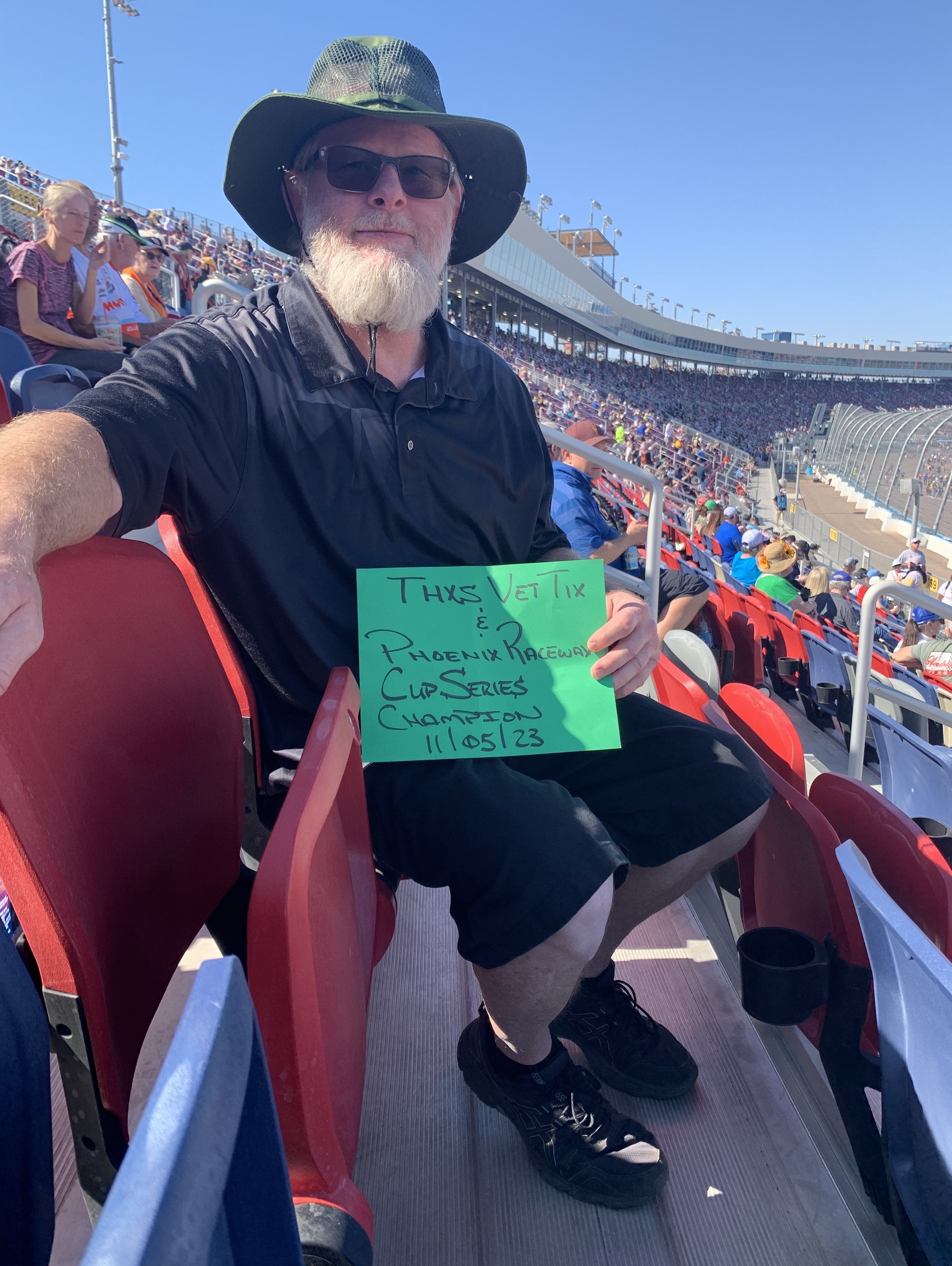 What a thrill. My first NASCAR race and I got to bring a Vietnam vet! Thank you for a lovely day at the race track.