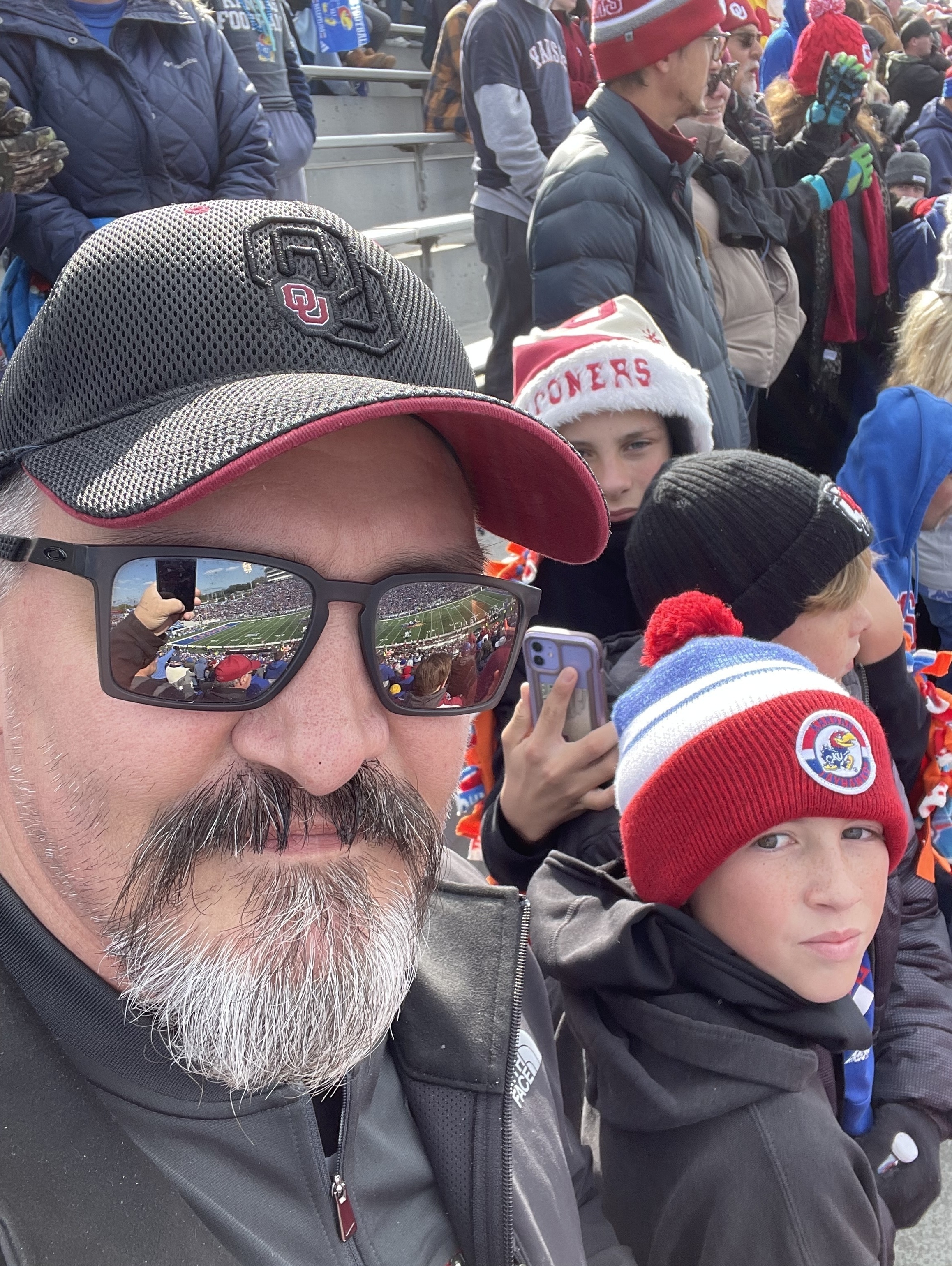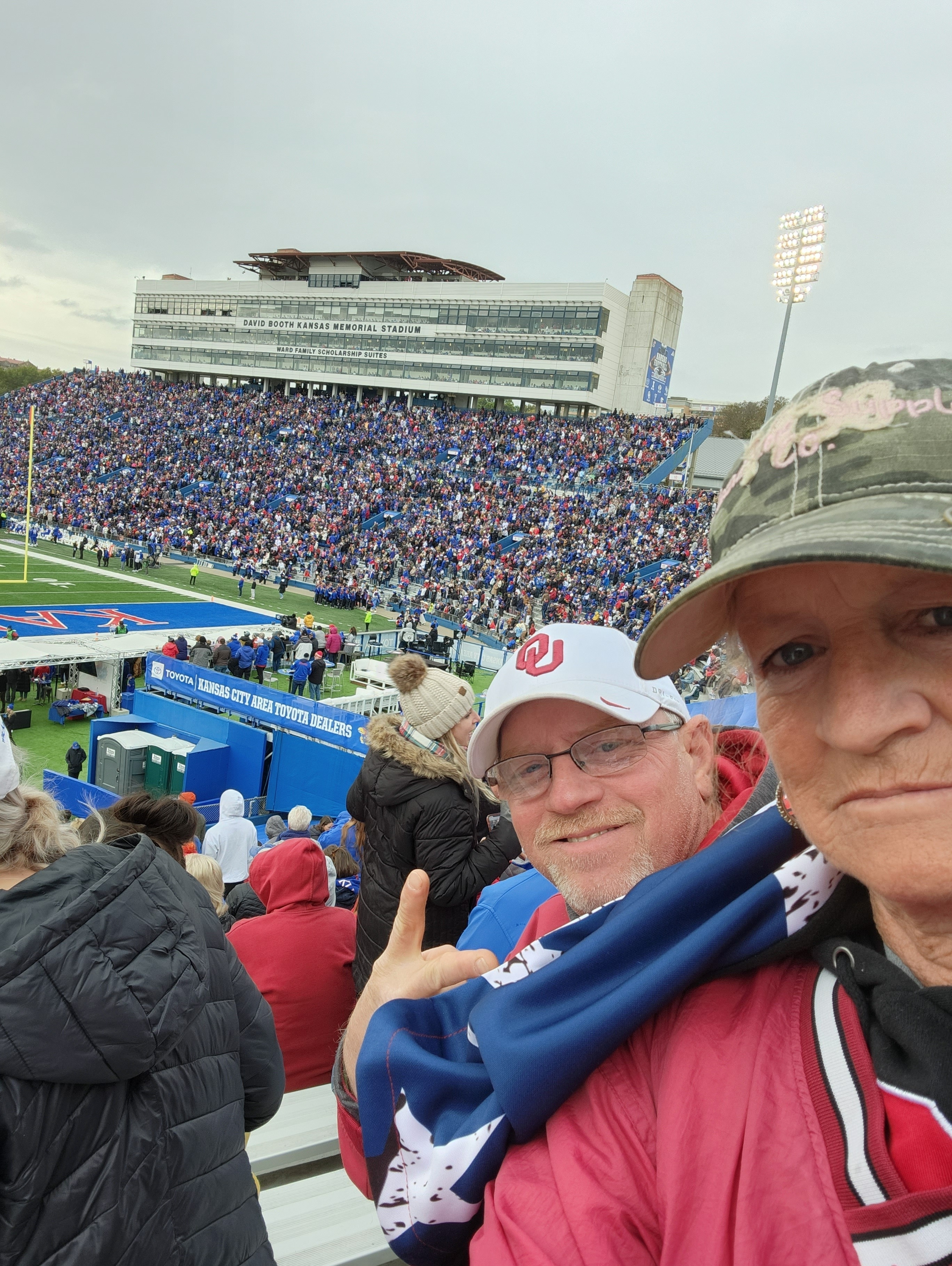 It was cold, rainy, and nasty out plus our Sooners got beat but we loved be able to go to the game! Thank you Kansas Jayhawks for the tickets and congratulations on the win!! Thank you Vettix also for the tix!