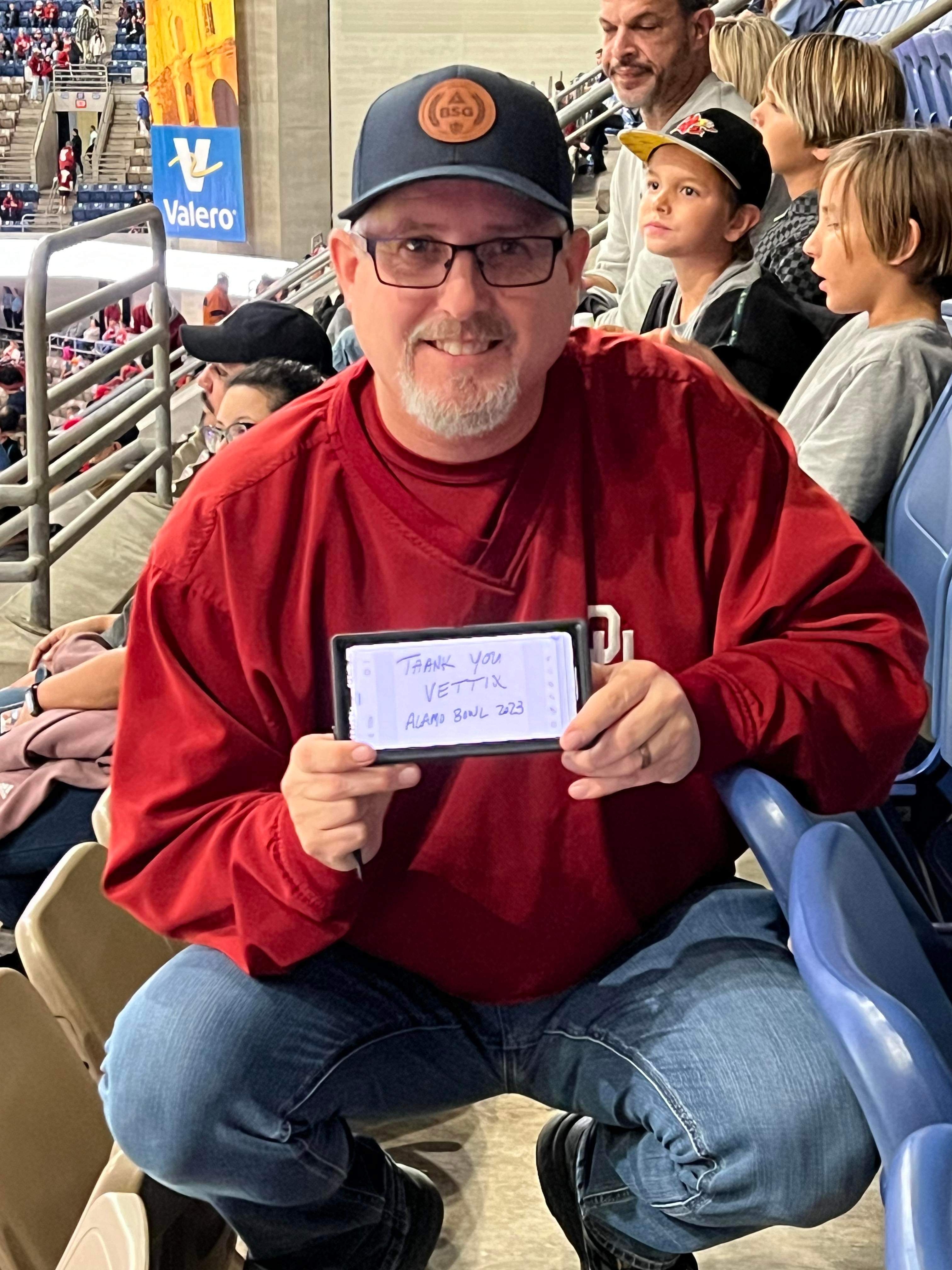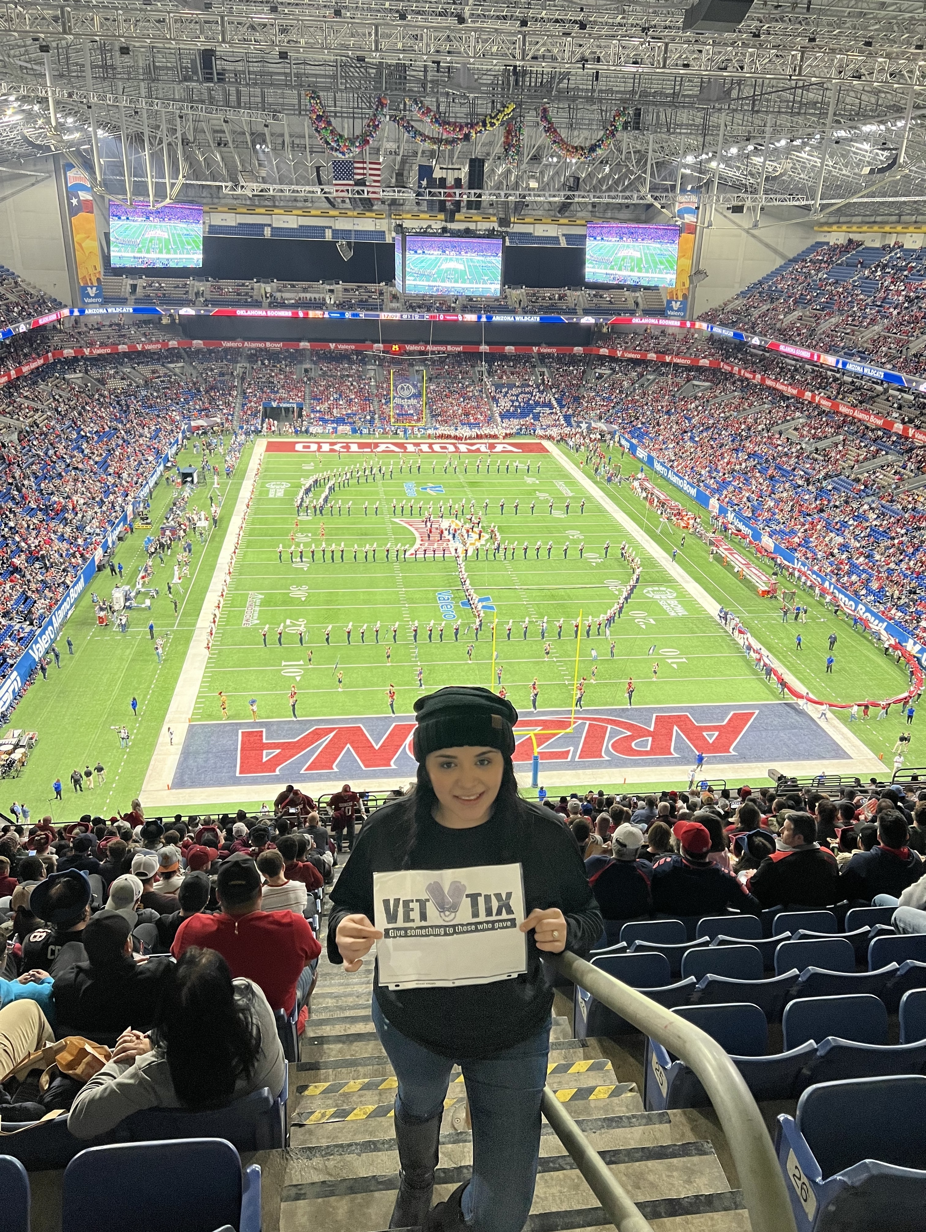 I want to thank Vettix and the University of Arizona, Veterans Tickets Foundation. It was an awesome treat to be able to take the family to a bowl game. Even though I'm a Sooner Fan it was still a great time sitting in the Arizona section. They recognized over 4000 veterans or service members currently at the game. The Alamo Bowl also recognized all military members for a standing ovation which was a great. Thank you Vettix for this great opportunity.