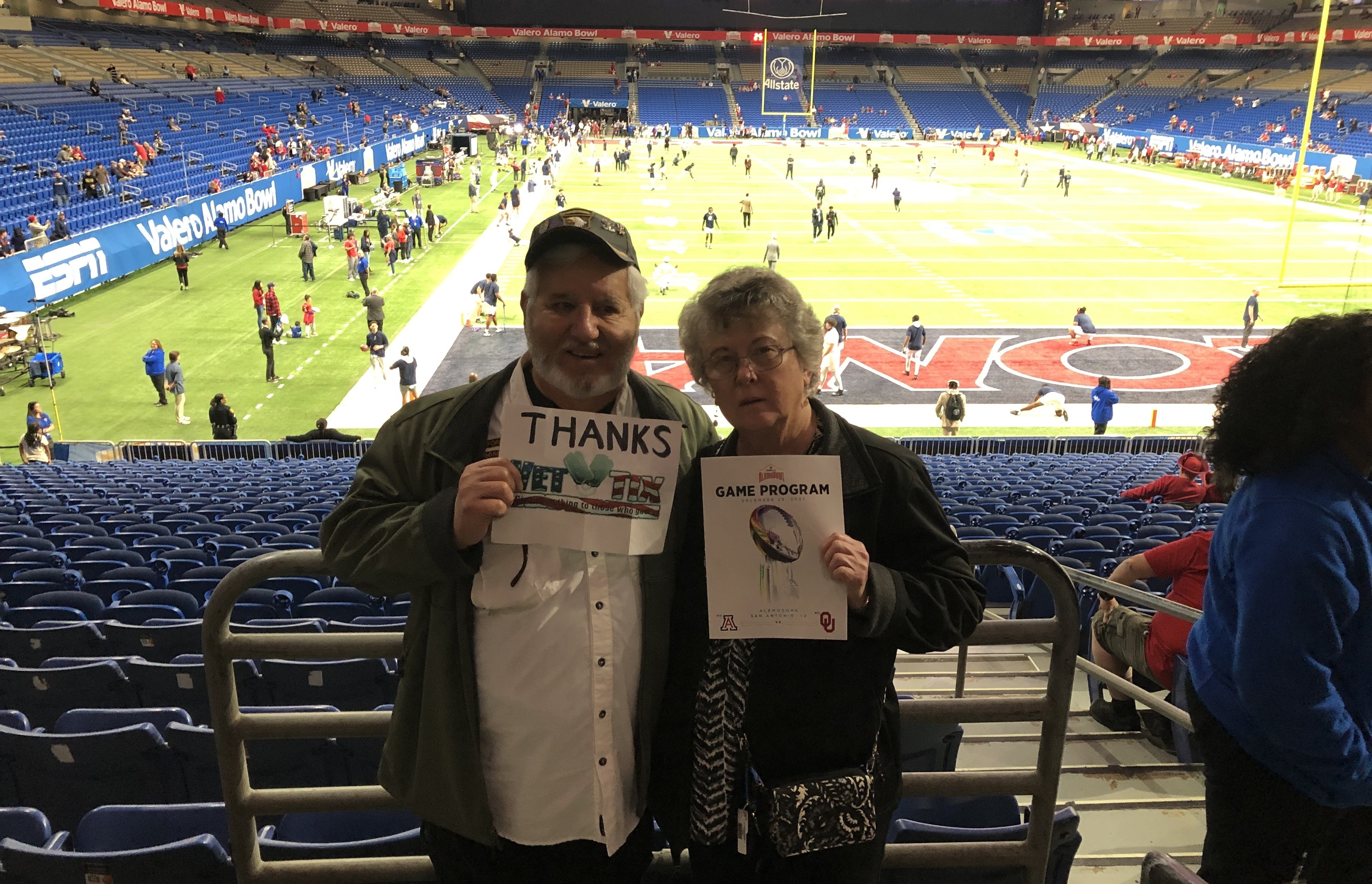 I would like to say thank you to The Valero Alamo Bowl and the Veteran Ticket Foundation for the opportunity to attend the 2023 Valero Alamo Bowl between Oklahoma and Arizona. It was a very enjoyable game.