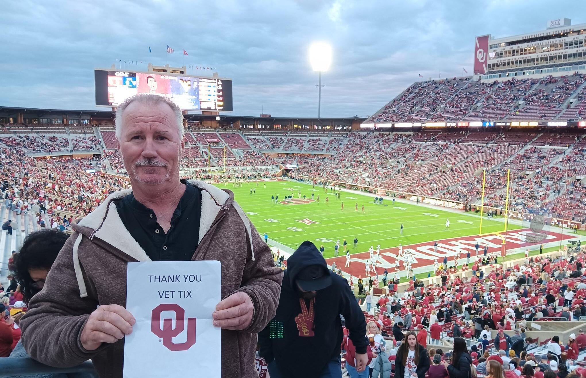 Thank you vettix for the tickets to the OU/WVU game. We had so much fun cheering on our team and celebrating veterans day at the football game.