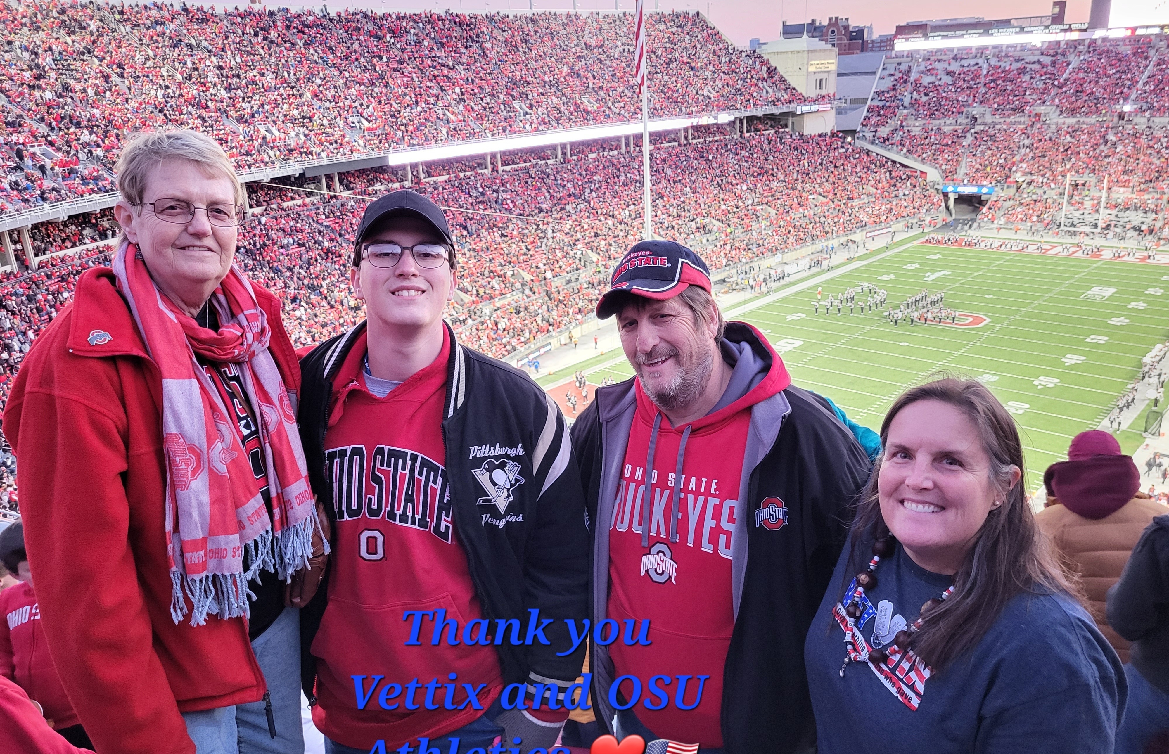 Thank you Vettix and OSU Athletics for a wonderful experience with my family!!! This was for two of them, their first game at Shoe! Being away with the Navy didn't allow much time to be spent together. I am thankful to have time now and grateful for your generosity to experience this with them!