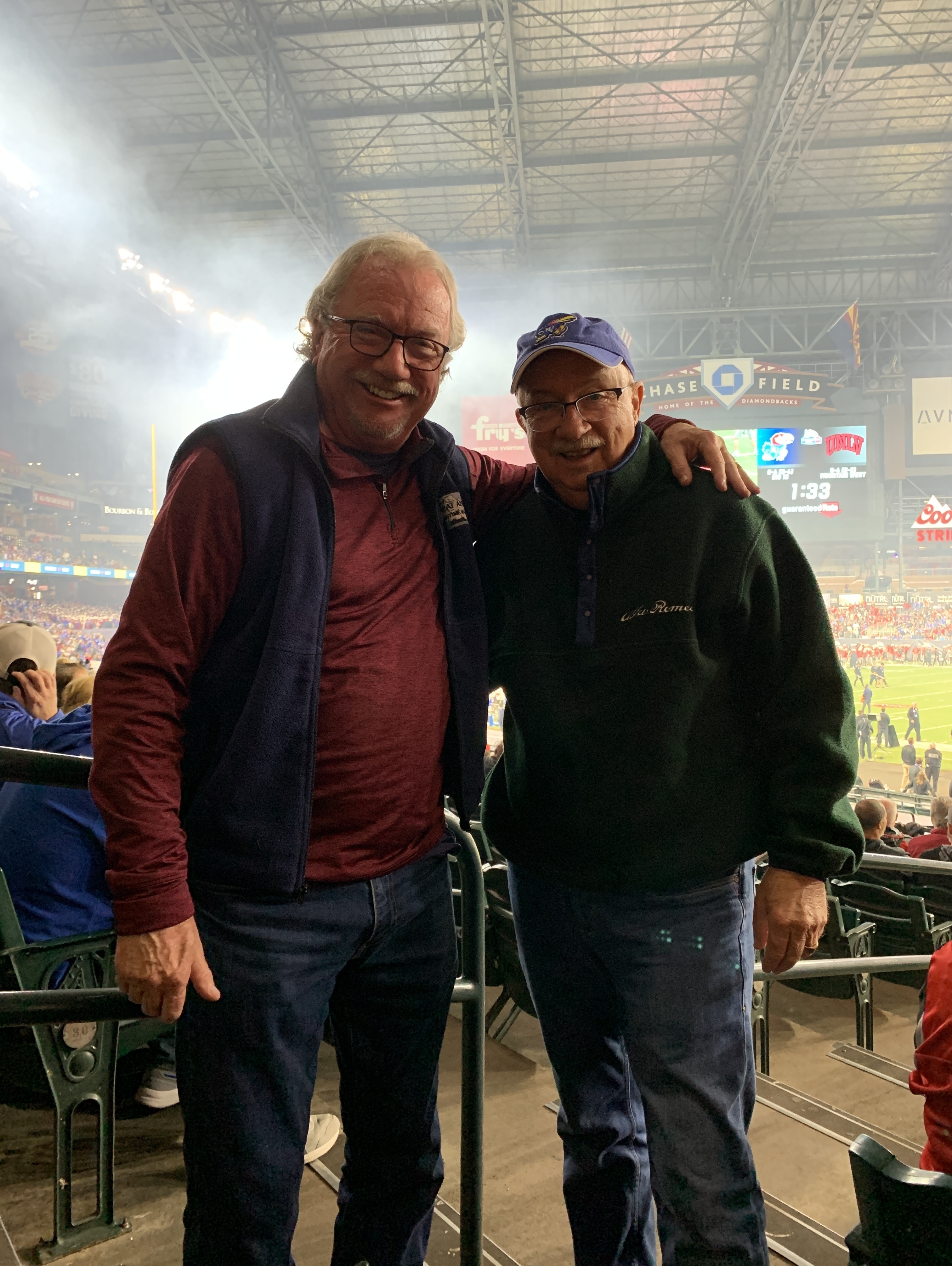 Thanks Fiesta Bowl for the tickets to the Guaranteed Rate Bowl. It was so much fun to be with all the collegiate fans and ambiance along with KU and UNLV. The football game and pyrotechnics, bands and cheerleaders were so energetic and entertaining. What a great night during this holiday season.