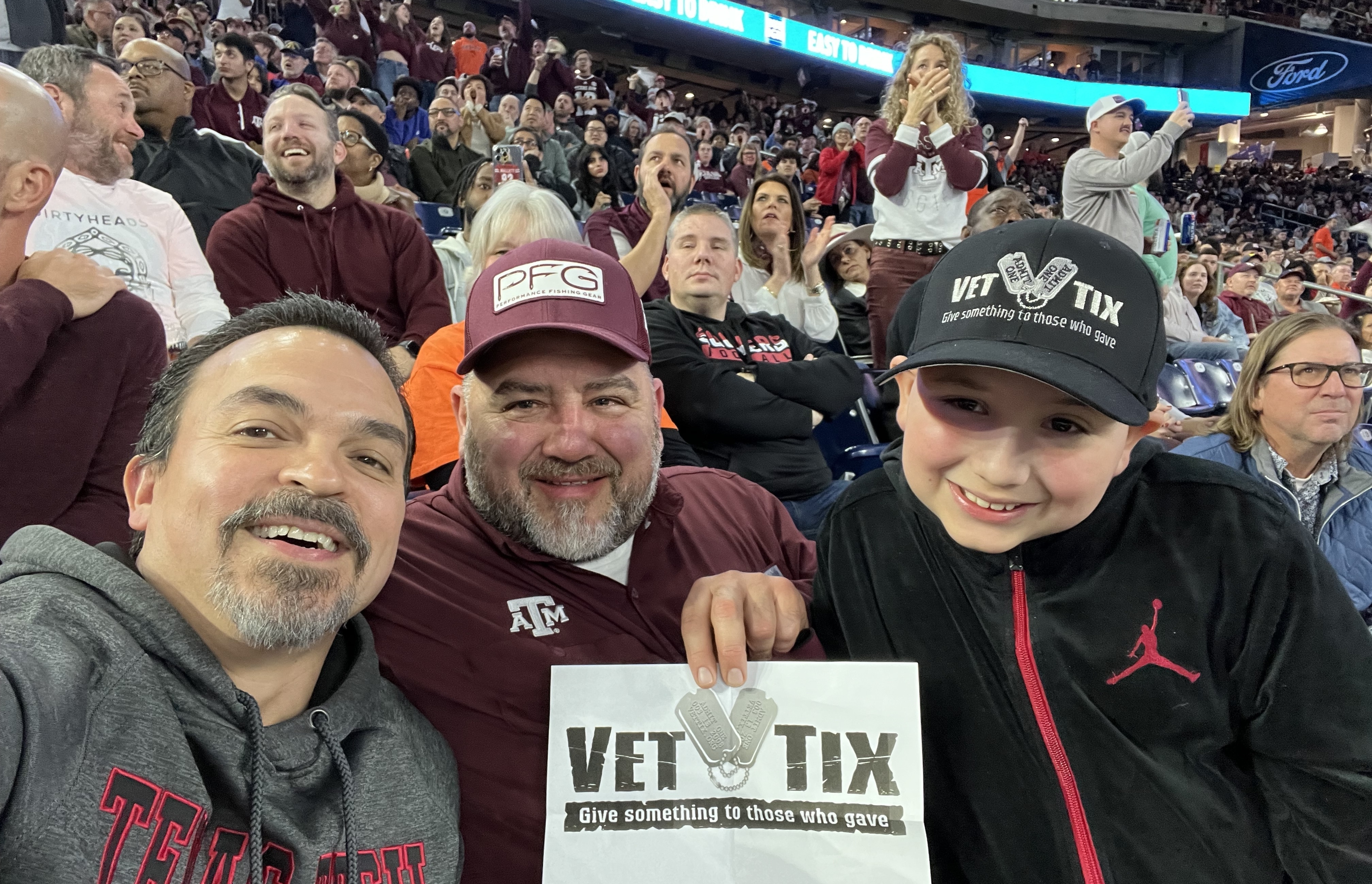 Thank you to the donor and vettix. Seats were amazing and we had a great time. We attended an A&M event as Longhorn fans. đ My two in the picture just commissioned as 2nd Lieutenants into the army so good times. Thank you so much.
